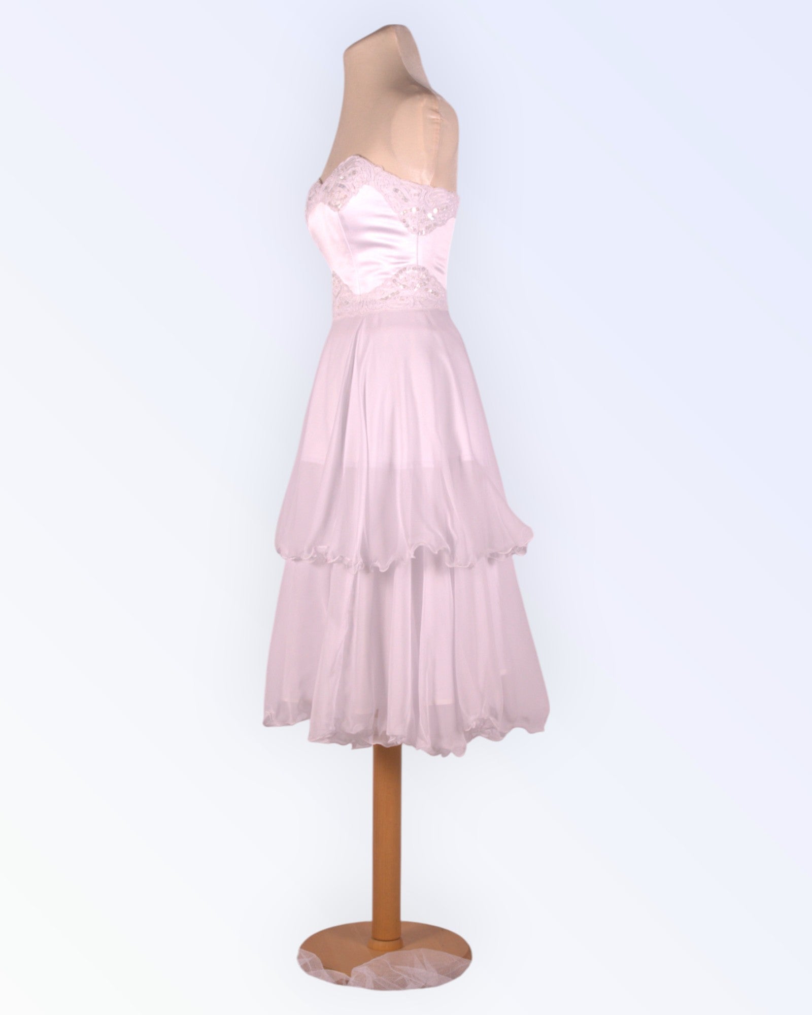 Pieni valkoinen korsettimekko, jossa on kerrostettu sifonkihame. Mekon korsettiosa on koristeltu pitsillä, kirjailtu paljeteilla ja pienillä helmillä. Vuorillinen tuote. Materiaali 100 % polyesteriä.