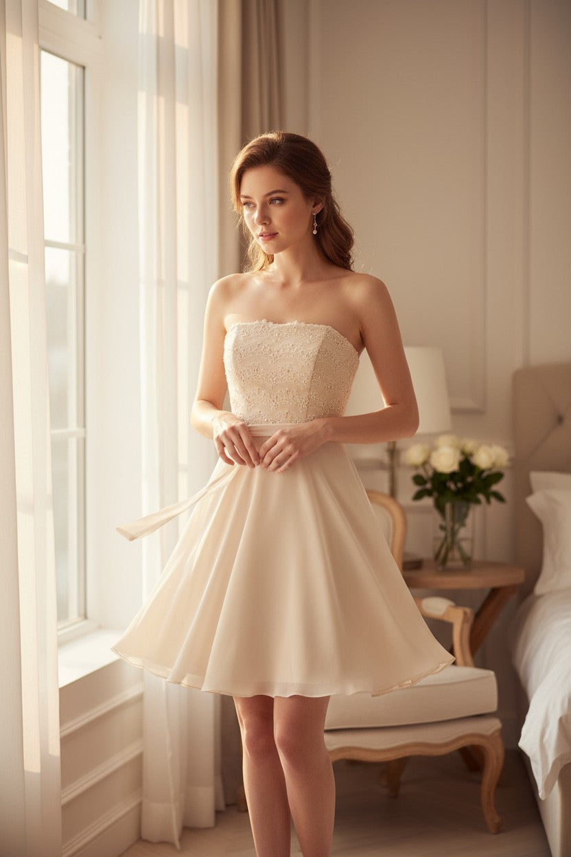 Pieni luonnonvalkoinen vintage-tyylinen mekko. Mekon korsettiosa on päällystetty ranskalaisella pitsillä ja kirjailtu helmillä ja kristalleilla. Mekossa on erillinen vyö, jossa on kimalteleva solki.
