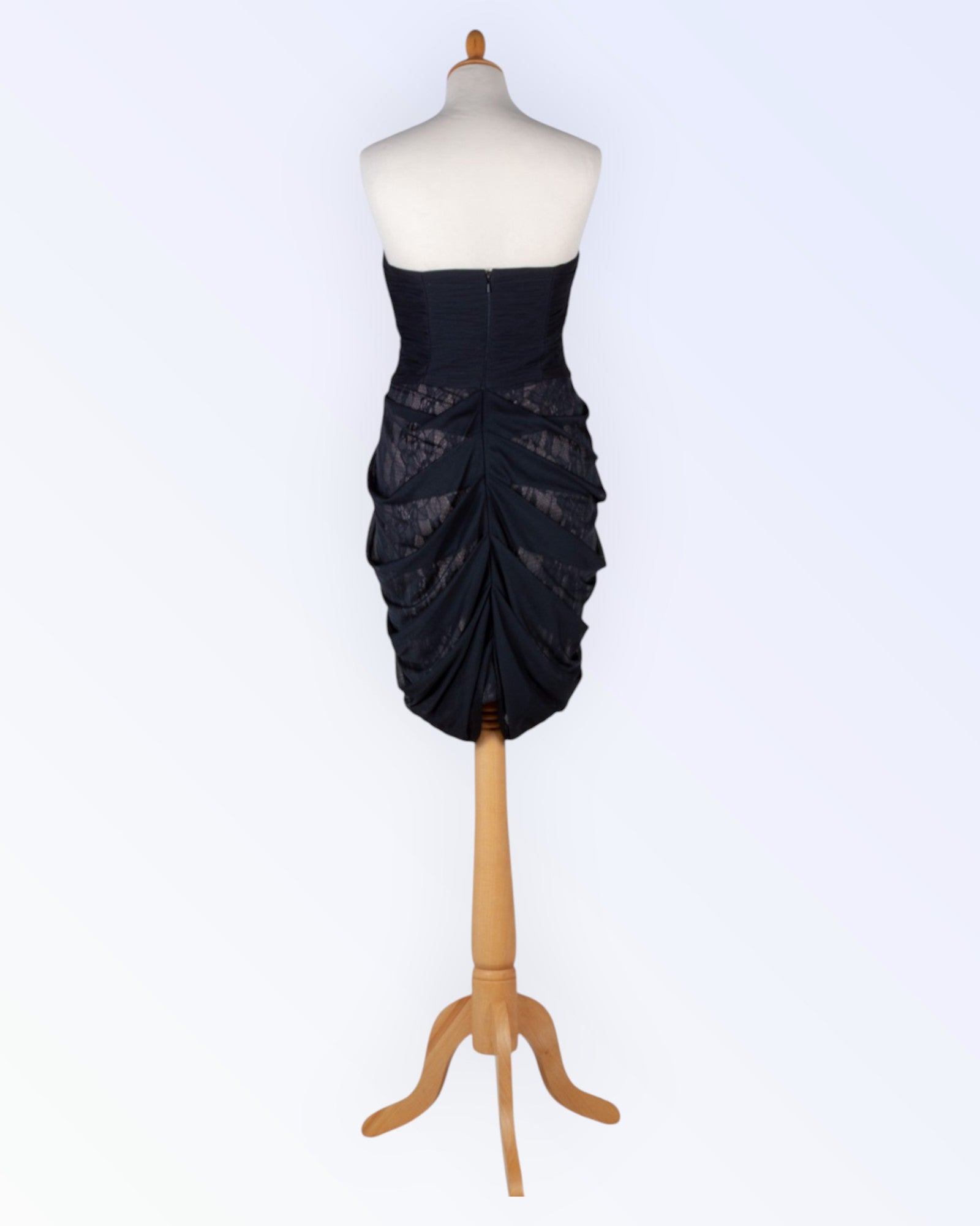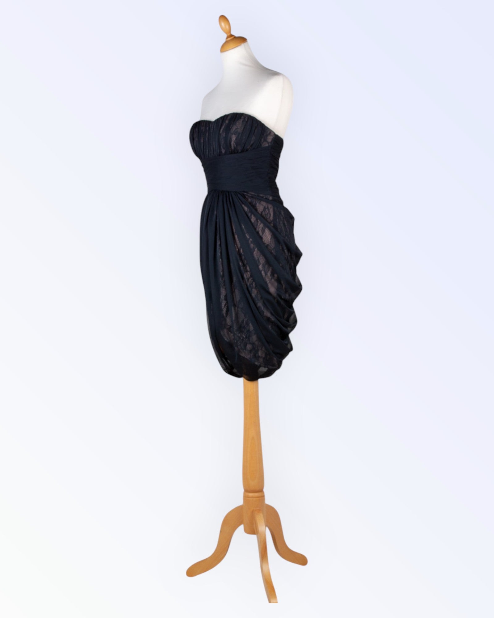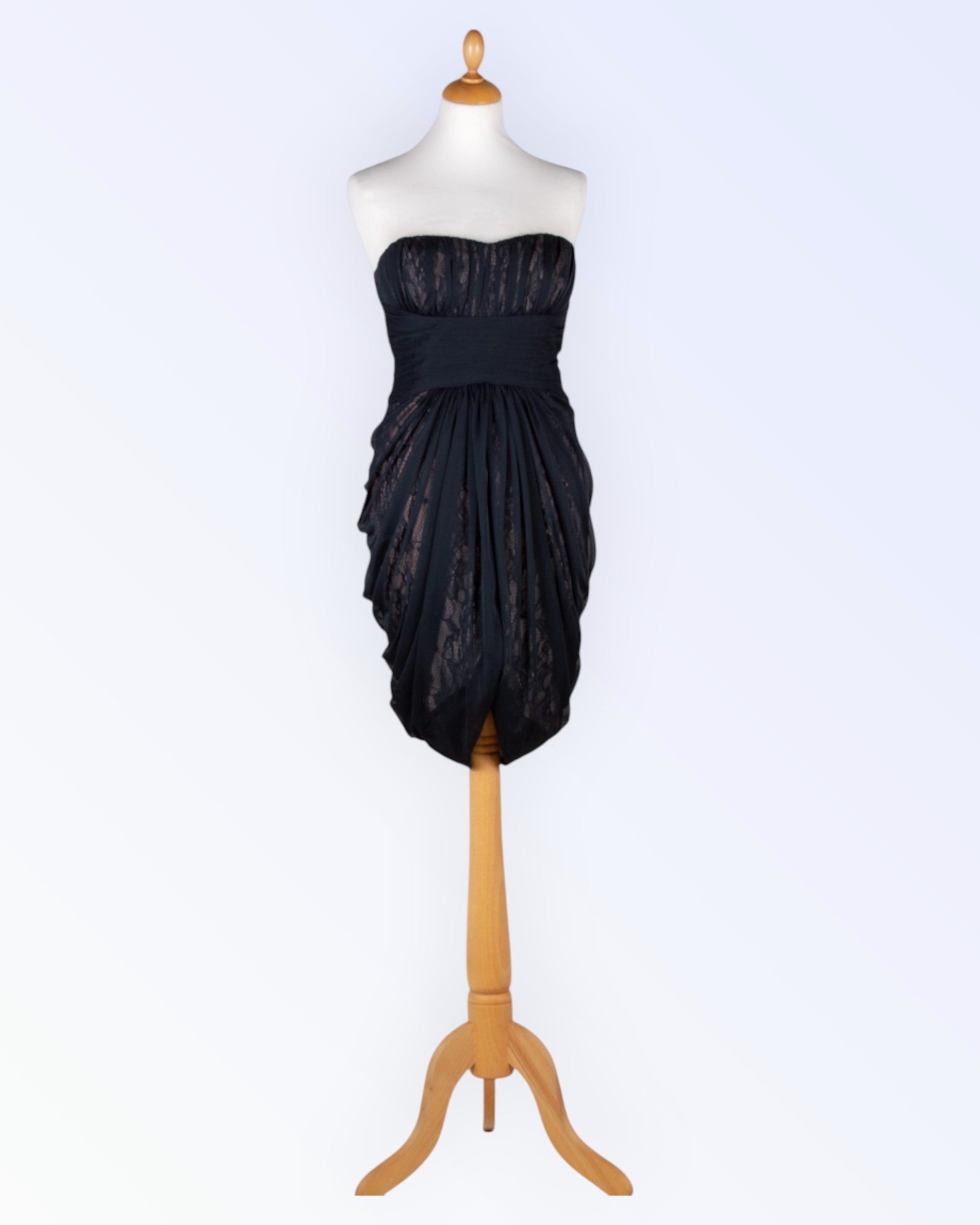 Drapeerattu sifonkimekko, jossa pitsiä ja ihonvärinen kangasvuori.