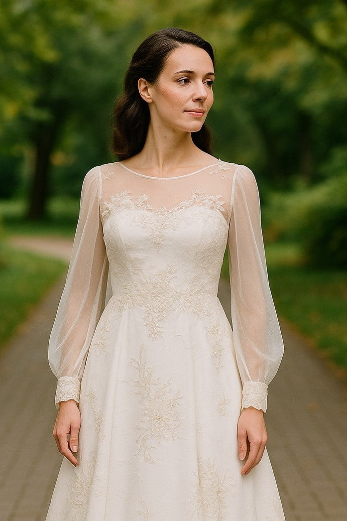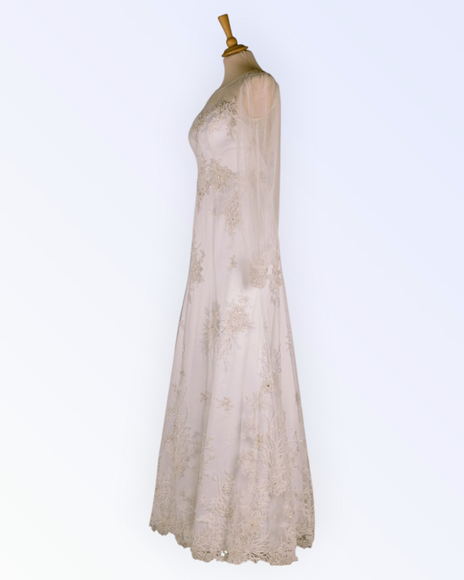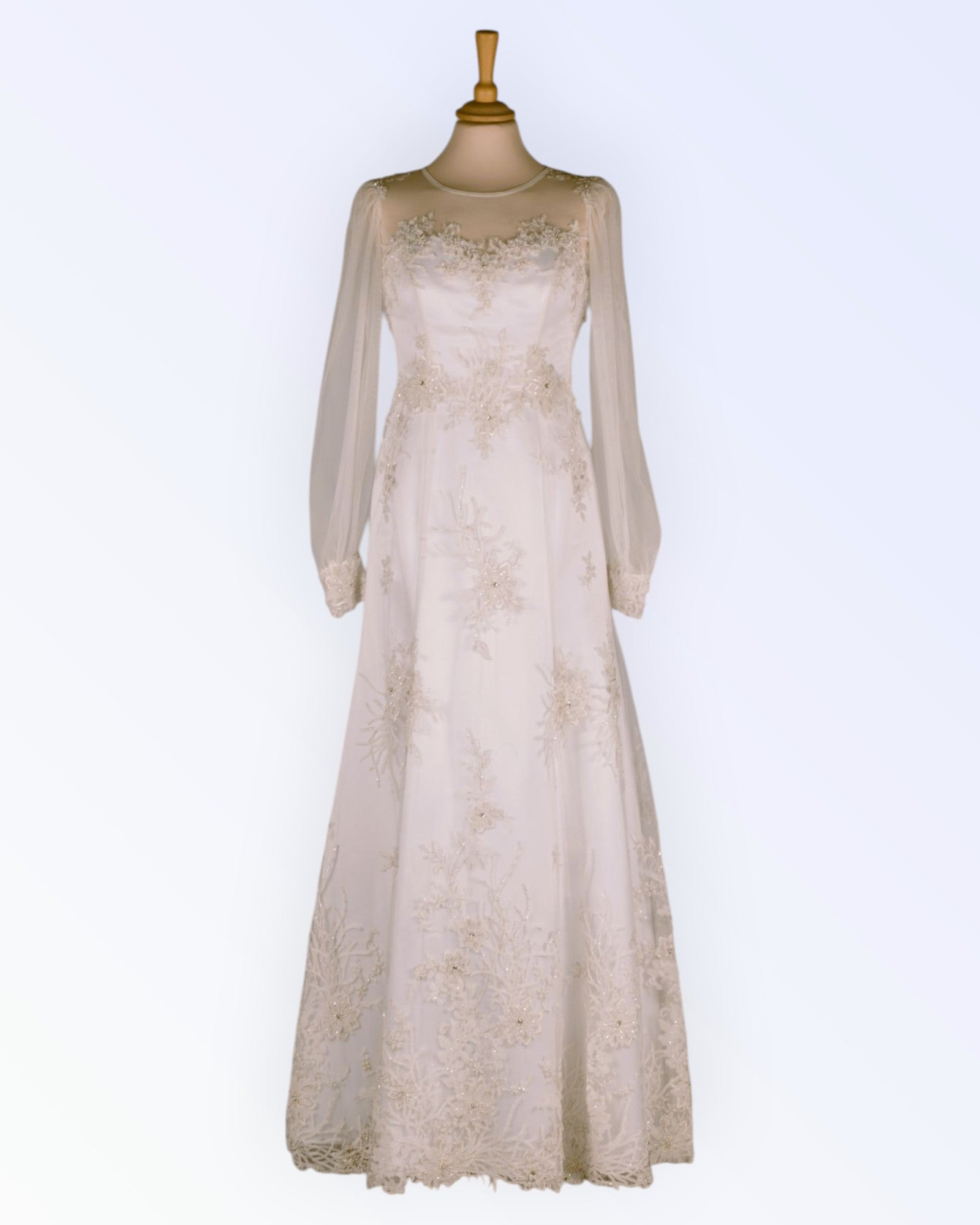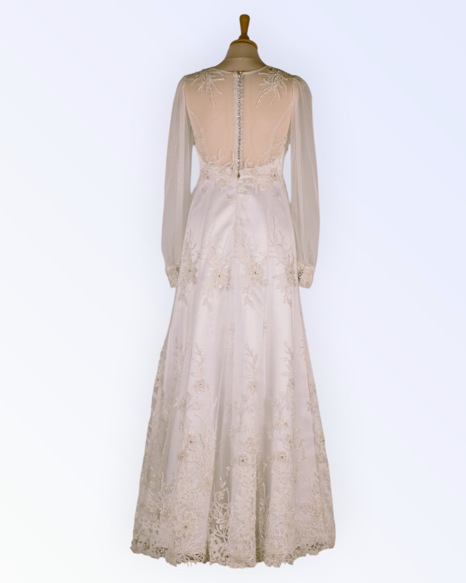 Vintage-tyylinen hääpuku, jossa on kalliita laserleikattuja kukka-aiheita ja helmikirjailtua tyllipitsiä. A-linjaisessa mekossa on pitkät tyllihihat ja läpinäkyvä tylliselkä kimaltelevilla napeilla.