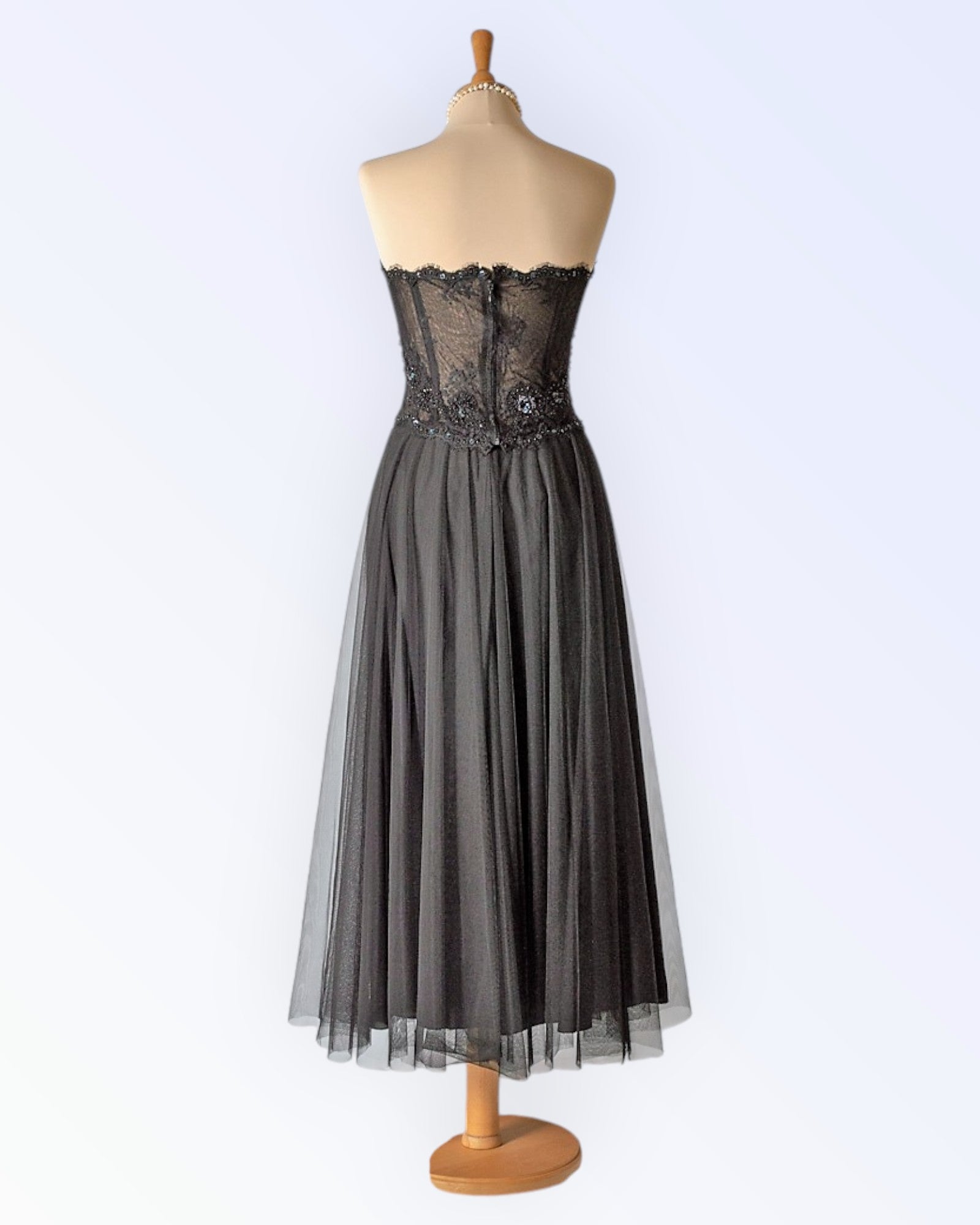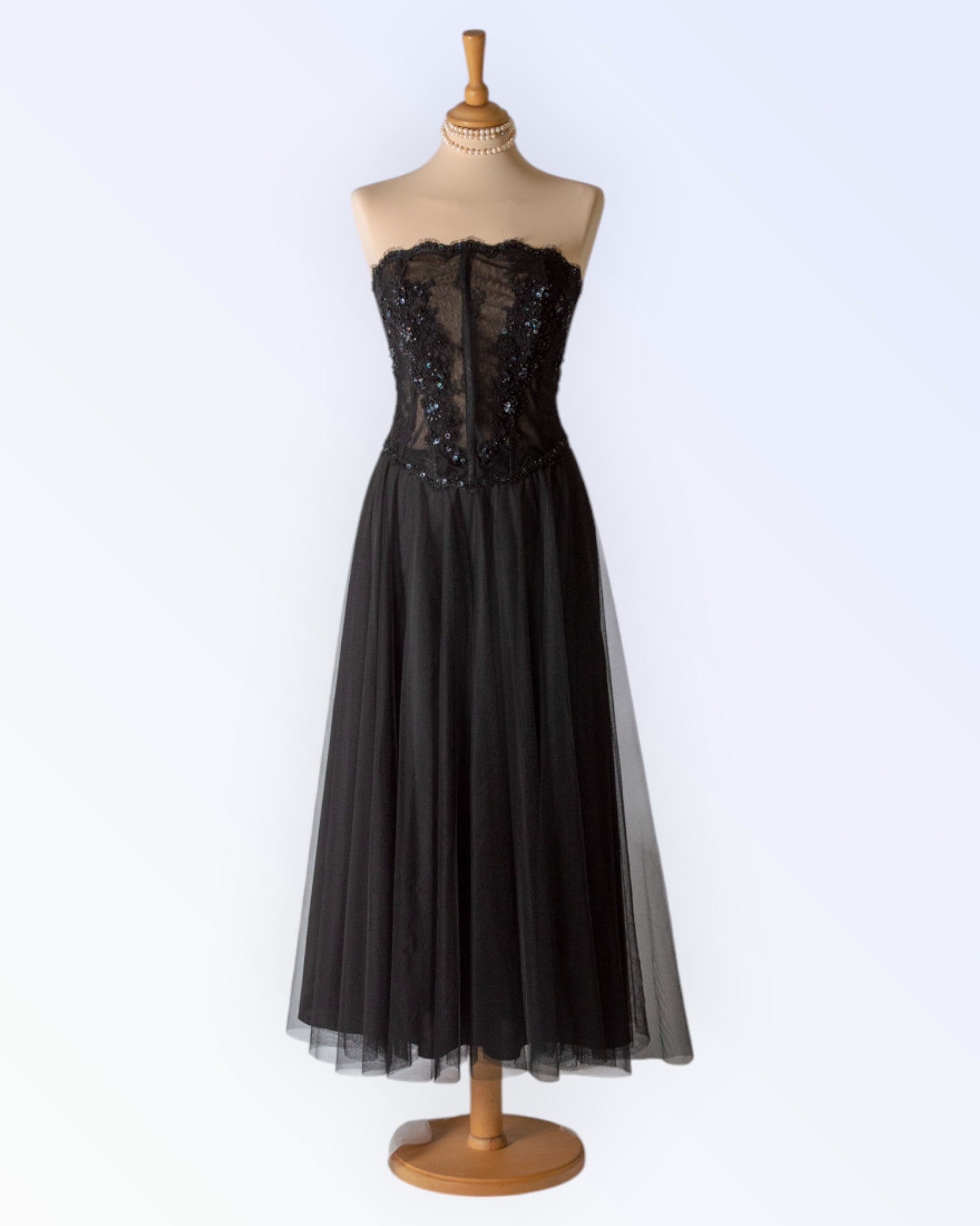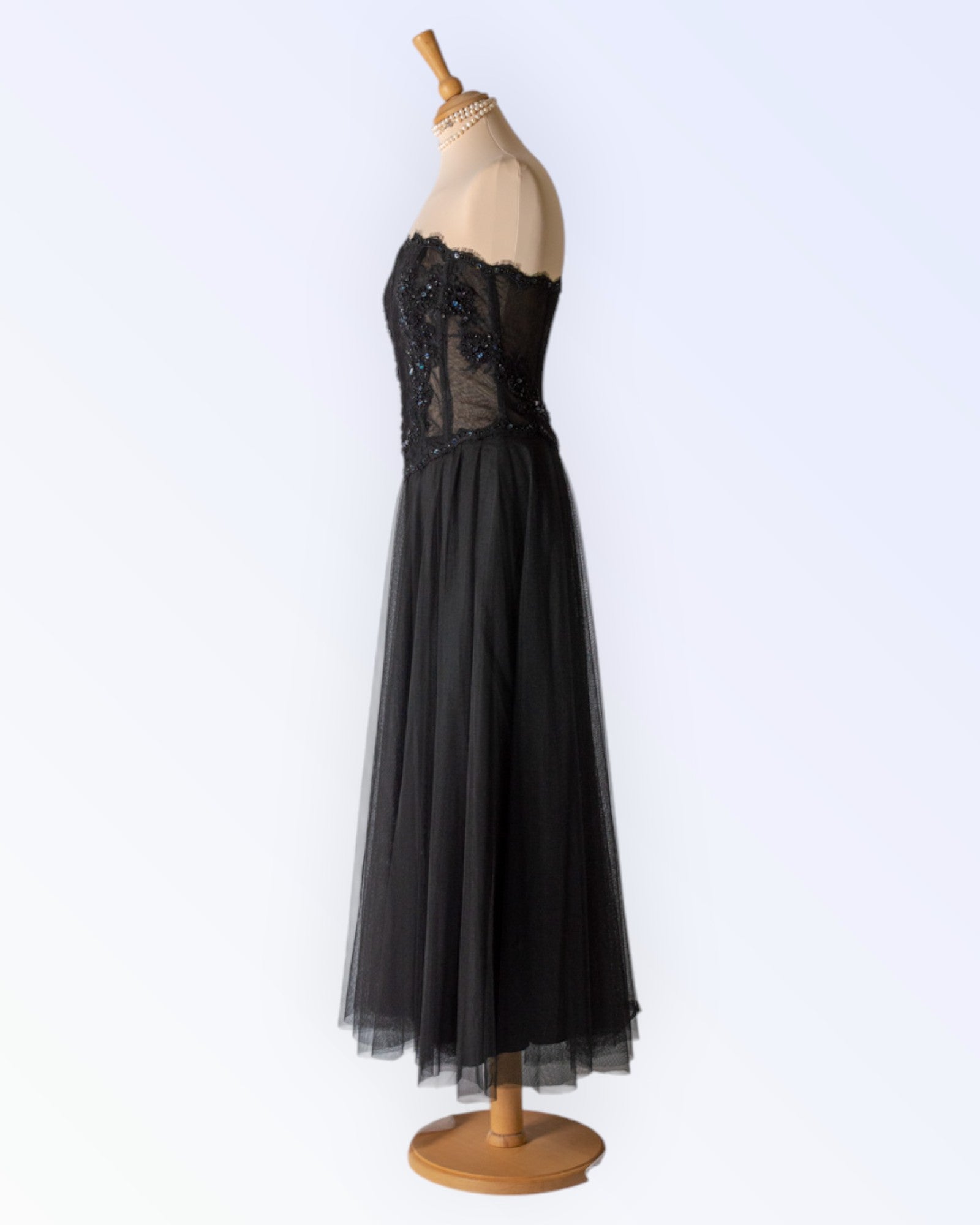 Musta tyllijuhlapaita ja -hame. Läpikuultava yläosa on koristeltu helmikirjonnalla ja pitsillä.