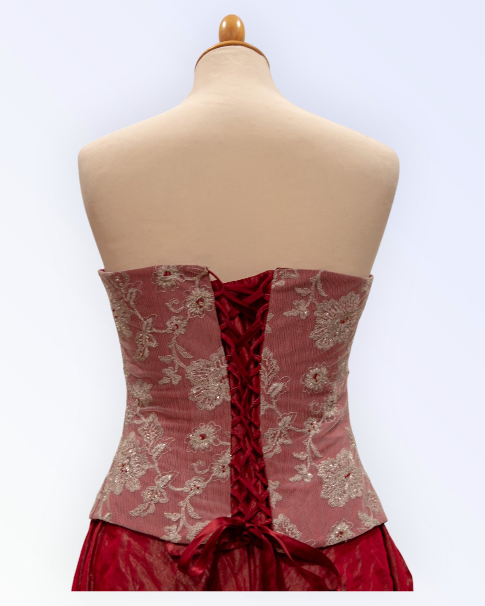 Punainen korsetti, jossa pitsipäällystys.