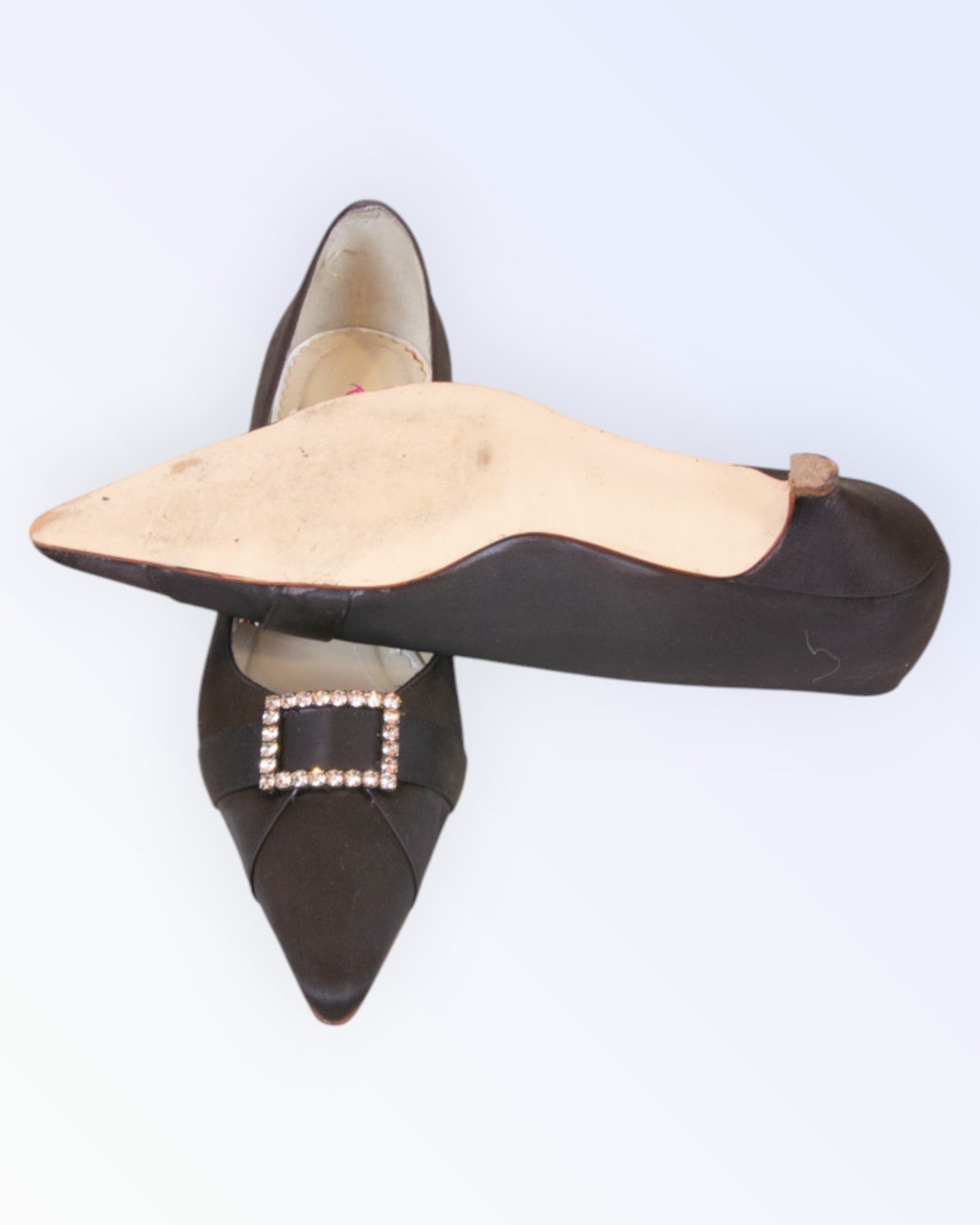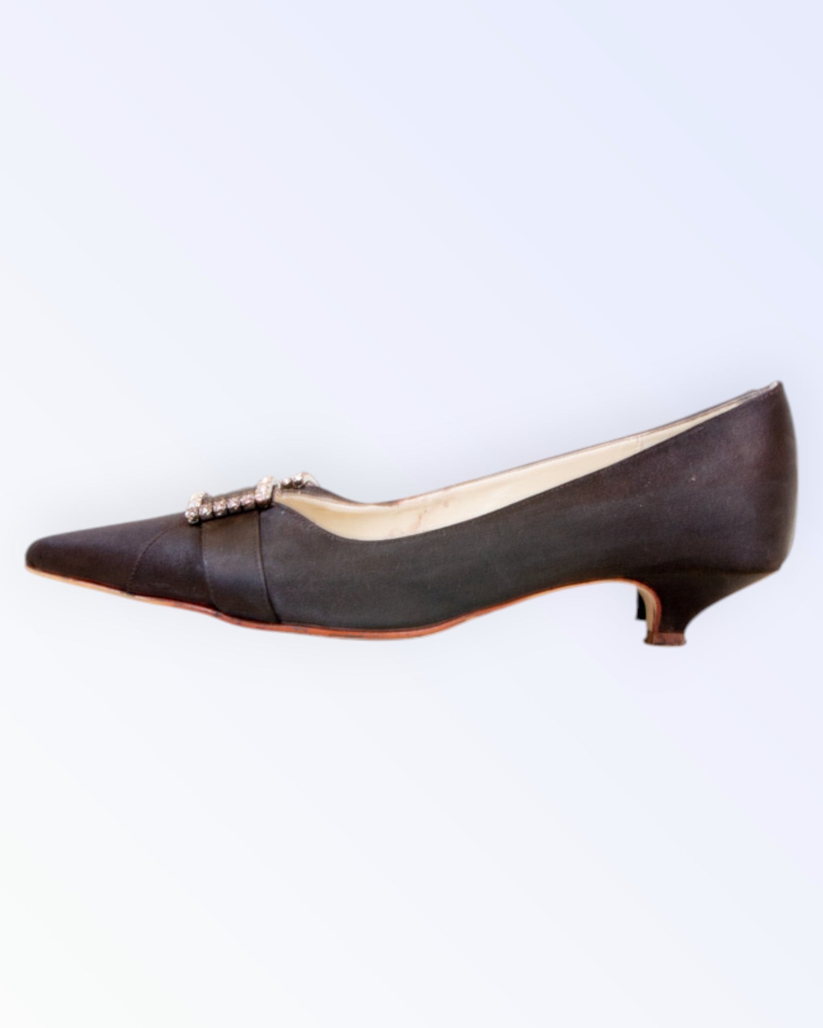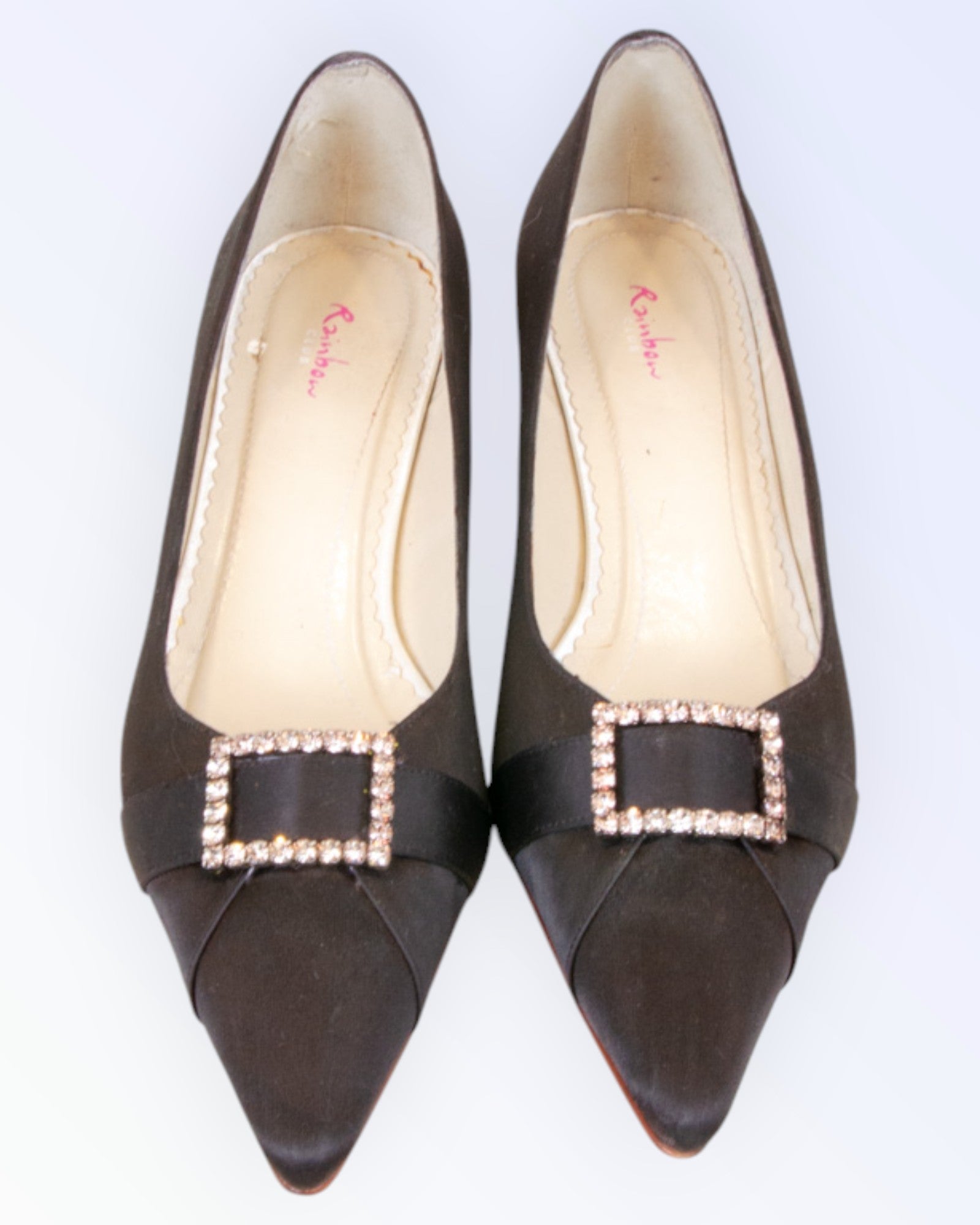 Rainbow värjätyt tummanruskeat matalat tekstiilikengät. Suorakaiteen muotoinen solki, jossa koristeena kimaltelevia kiviä.