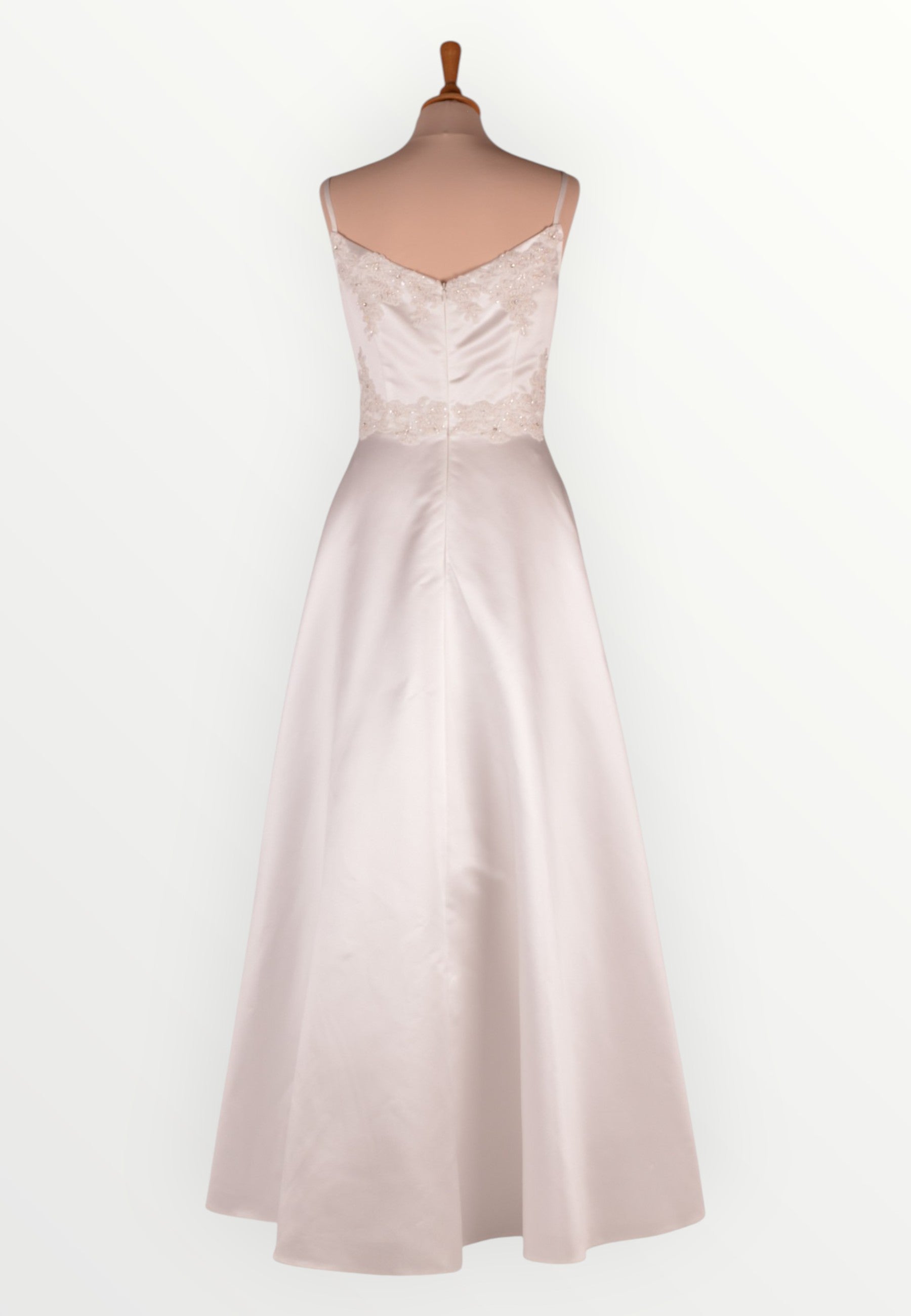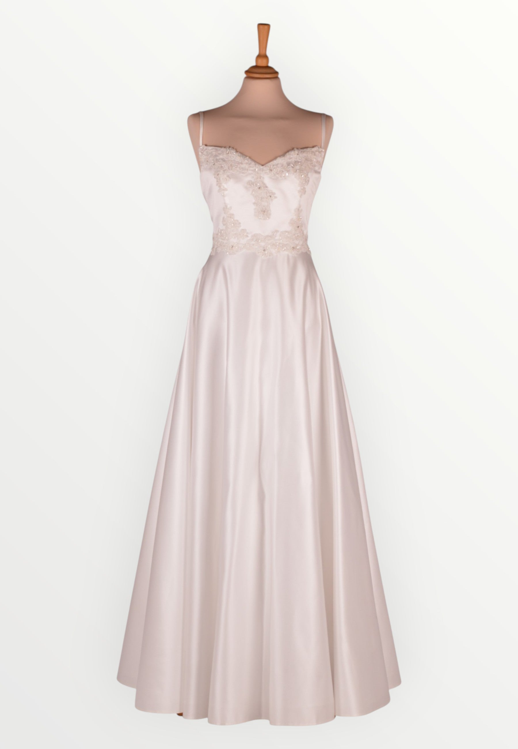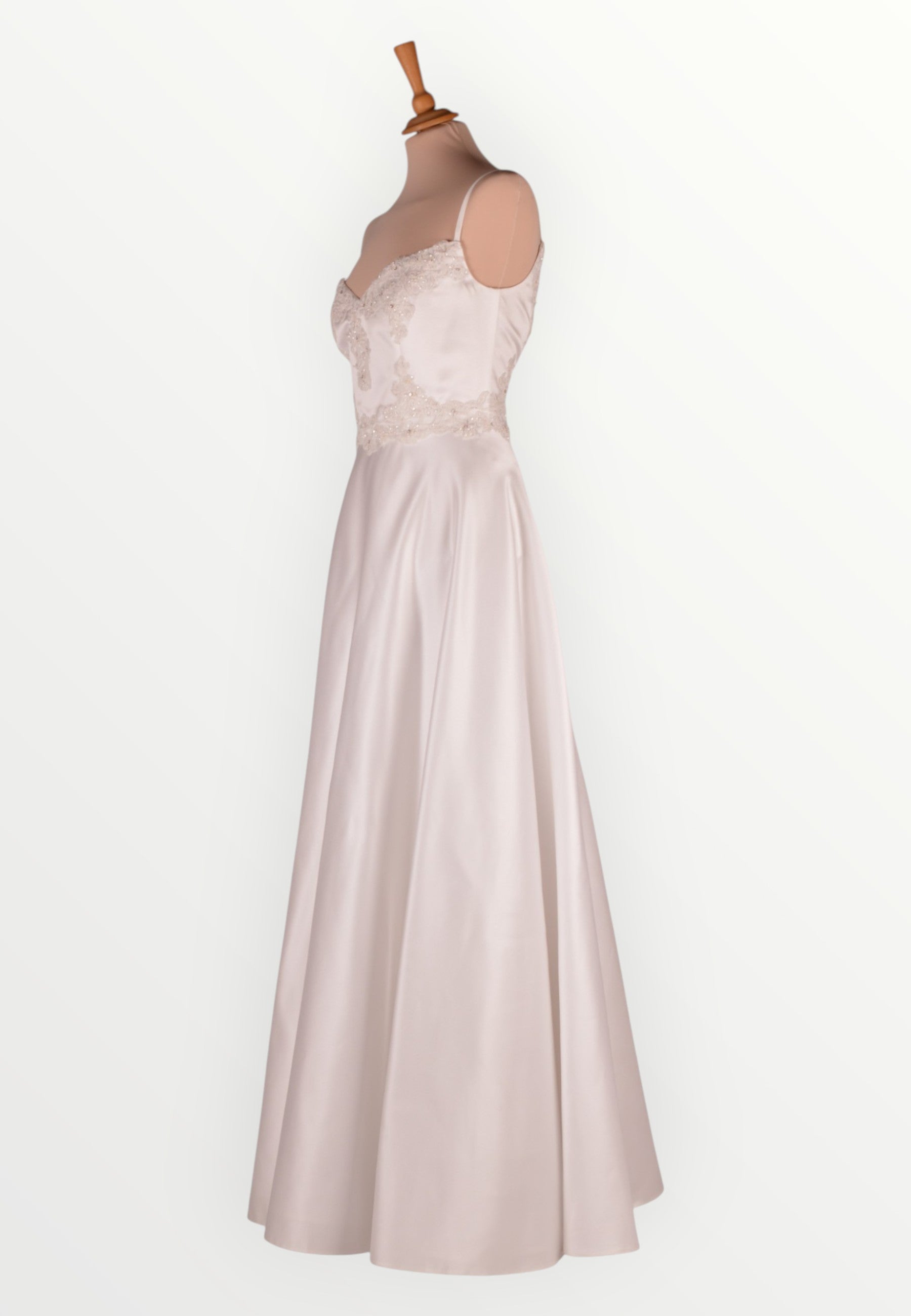 Satiinisessa mekossa on olkaimet, sydämenmuotoinen pääntie ja vartaloa koristavat helmillä ja helmillä kirjaillut pitsiapplikaatiot. Vuorattu tuote.