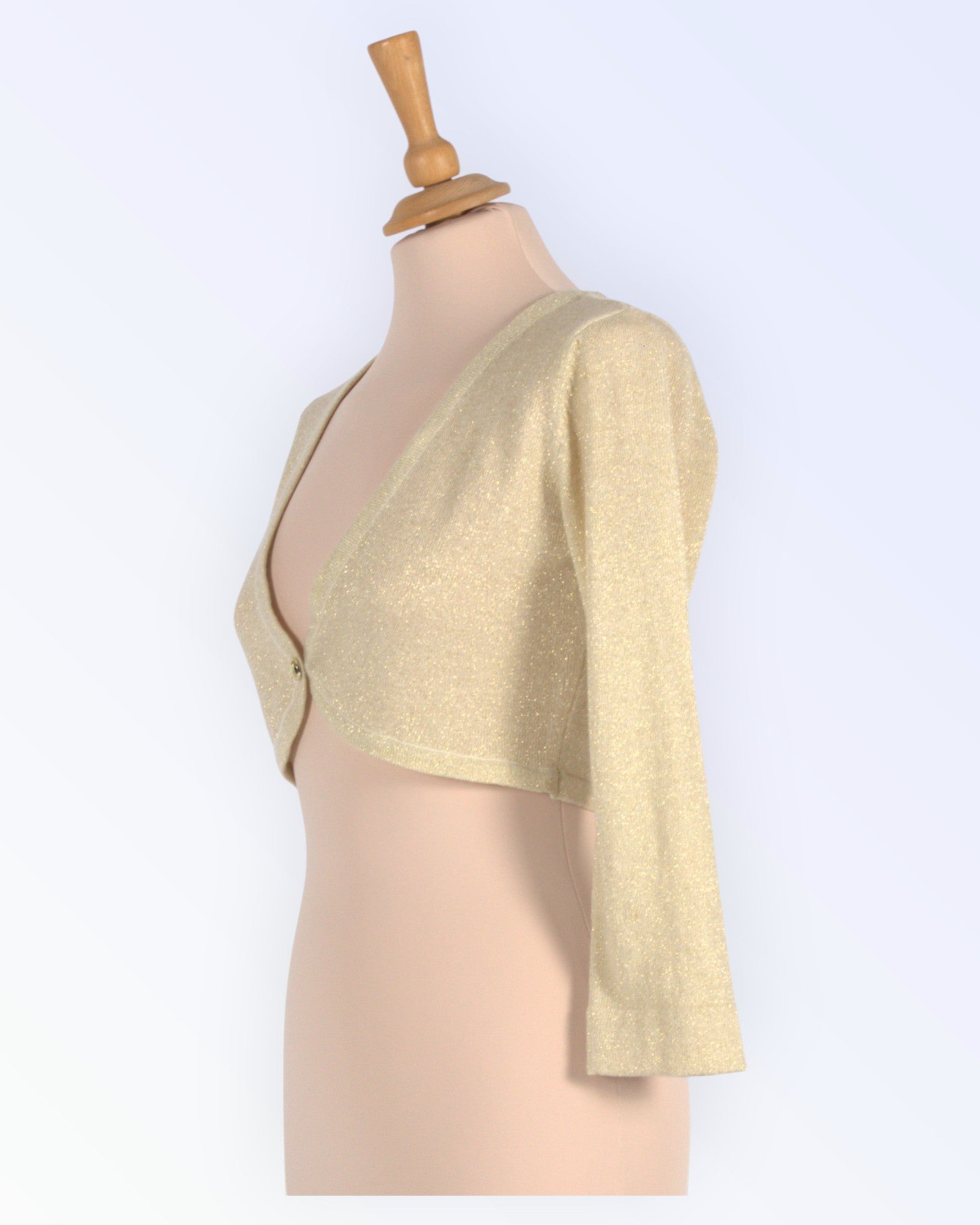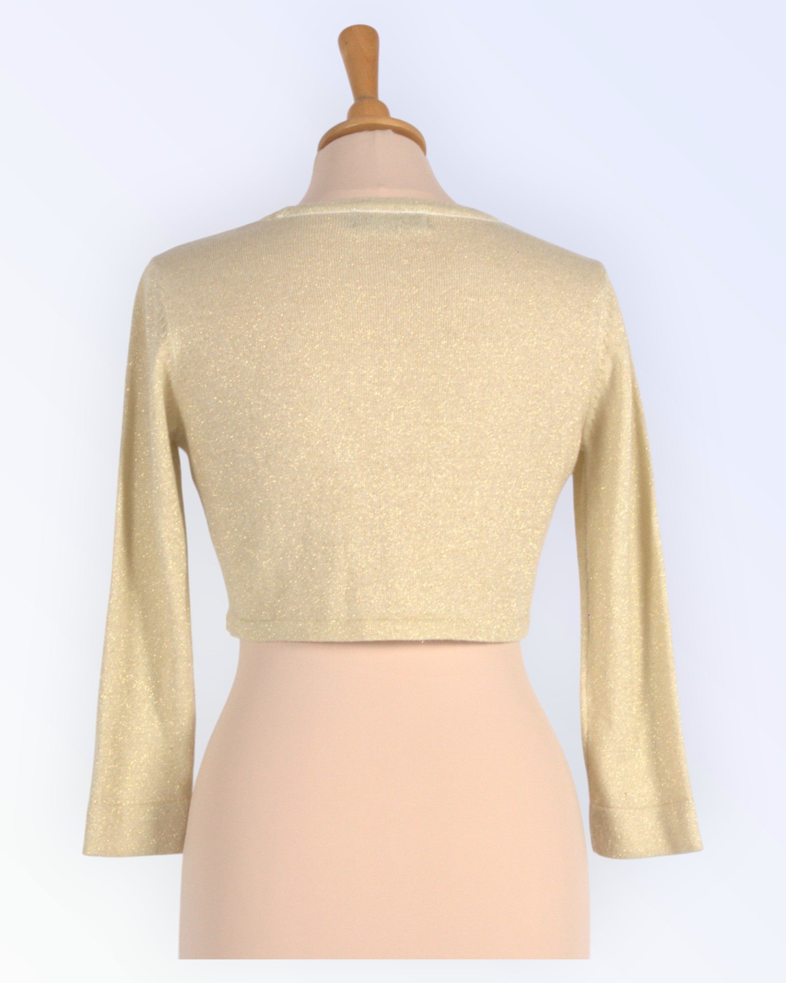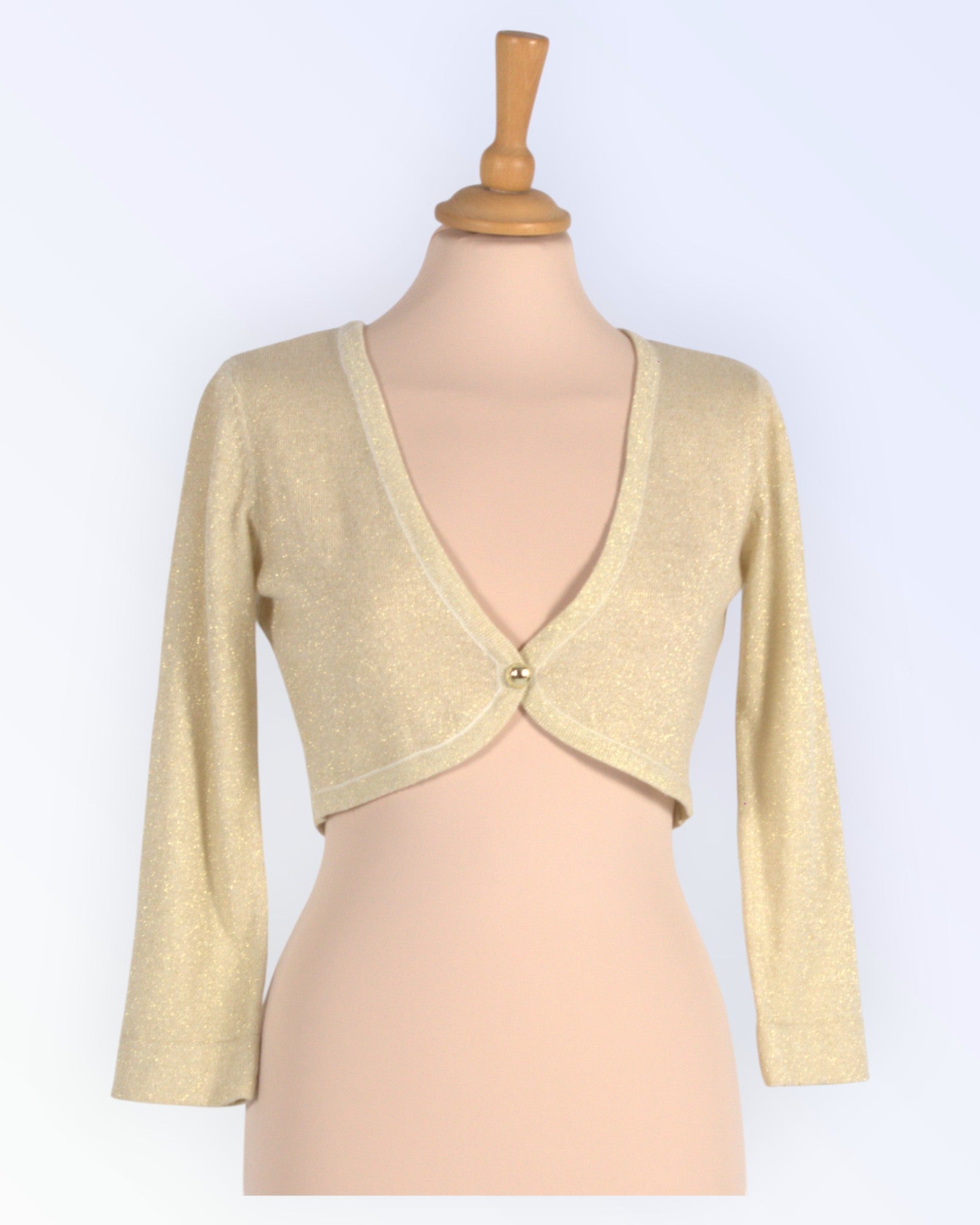 Lyhyt neuletakki, neulottu kultaisesta glitterlangasta.