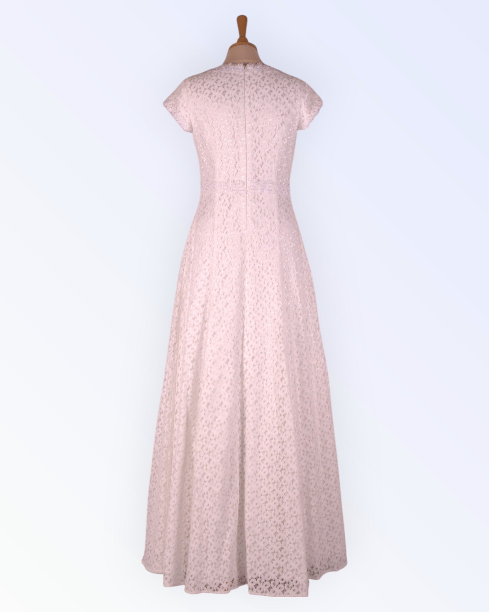 Empire-leikkauksinen hääpuku ohuesta pitsistä. Tämä valkoinen pitsinen hääpuku sopii myös tulevalle äidille.