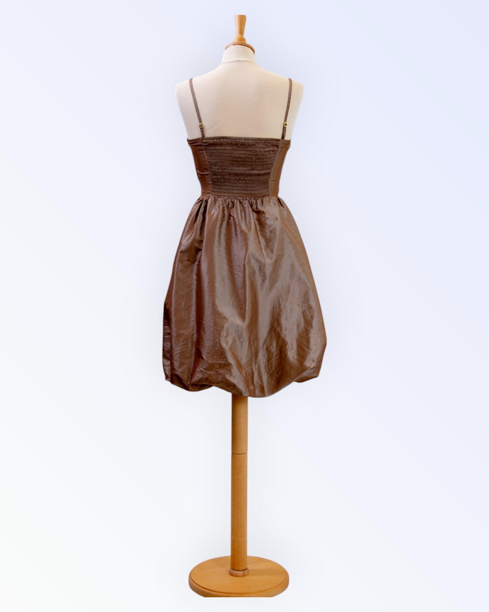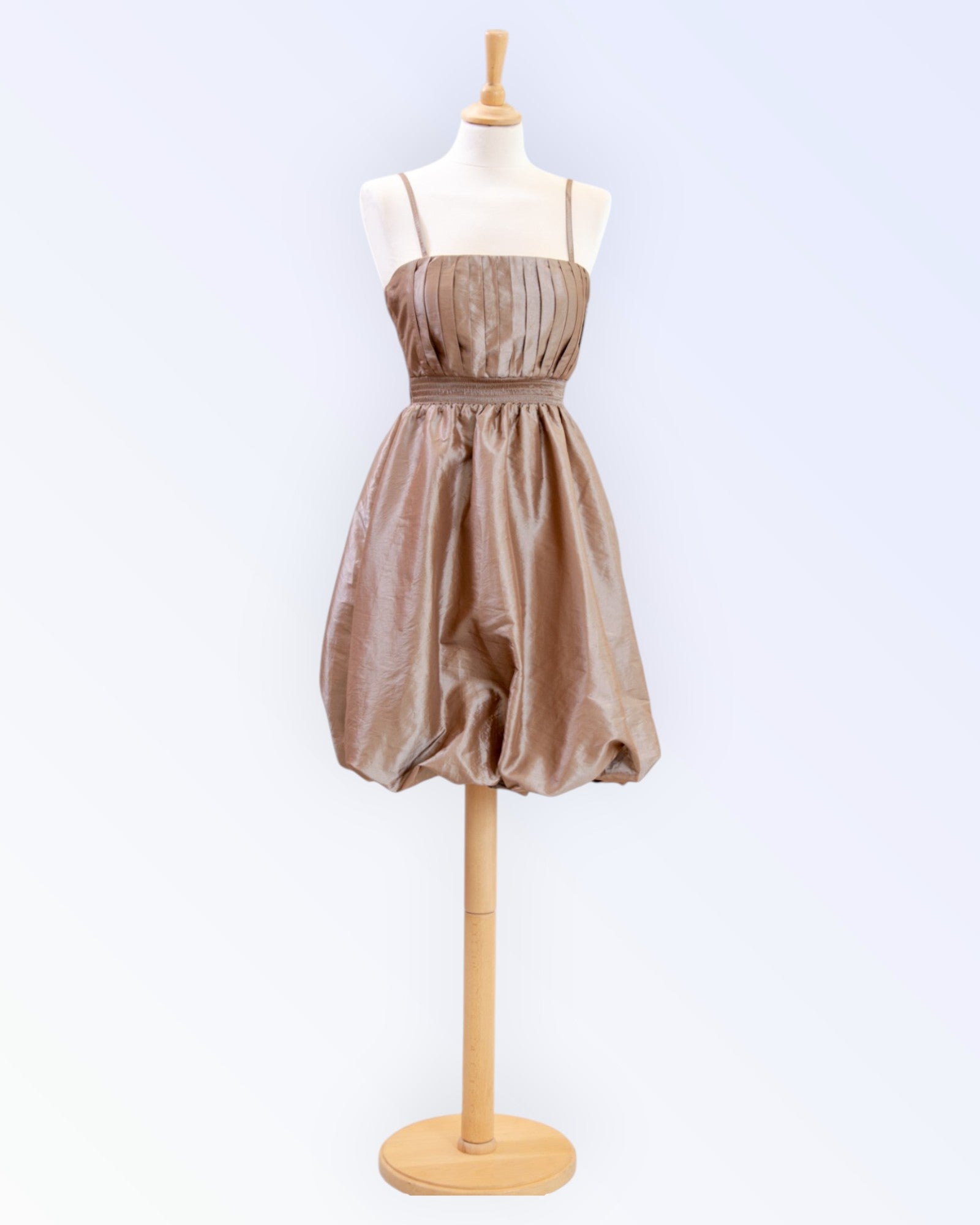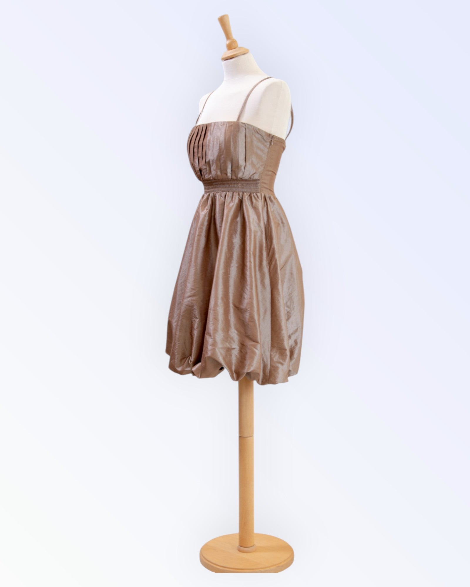 Vilan beigenvärinen taftikuvioinen cocktailmekko. Tämä mekko, jossa on laskeutuva yläosa ja puhvihelma, on hyvä valinta koulun juhliin.