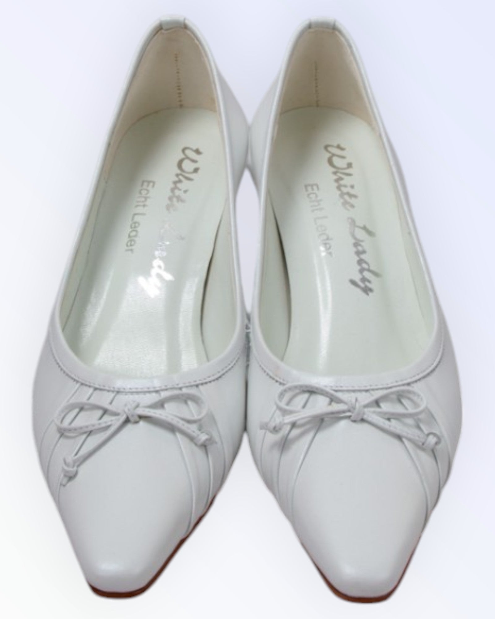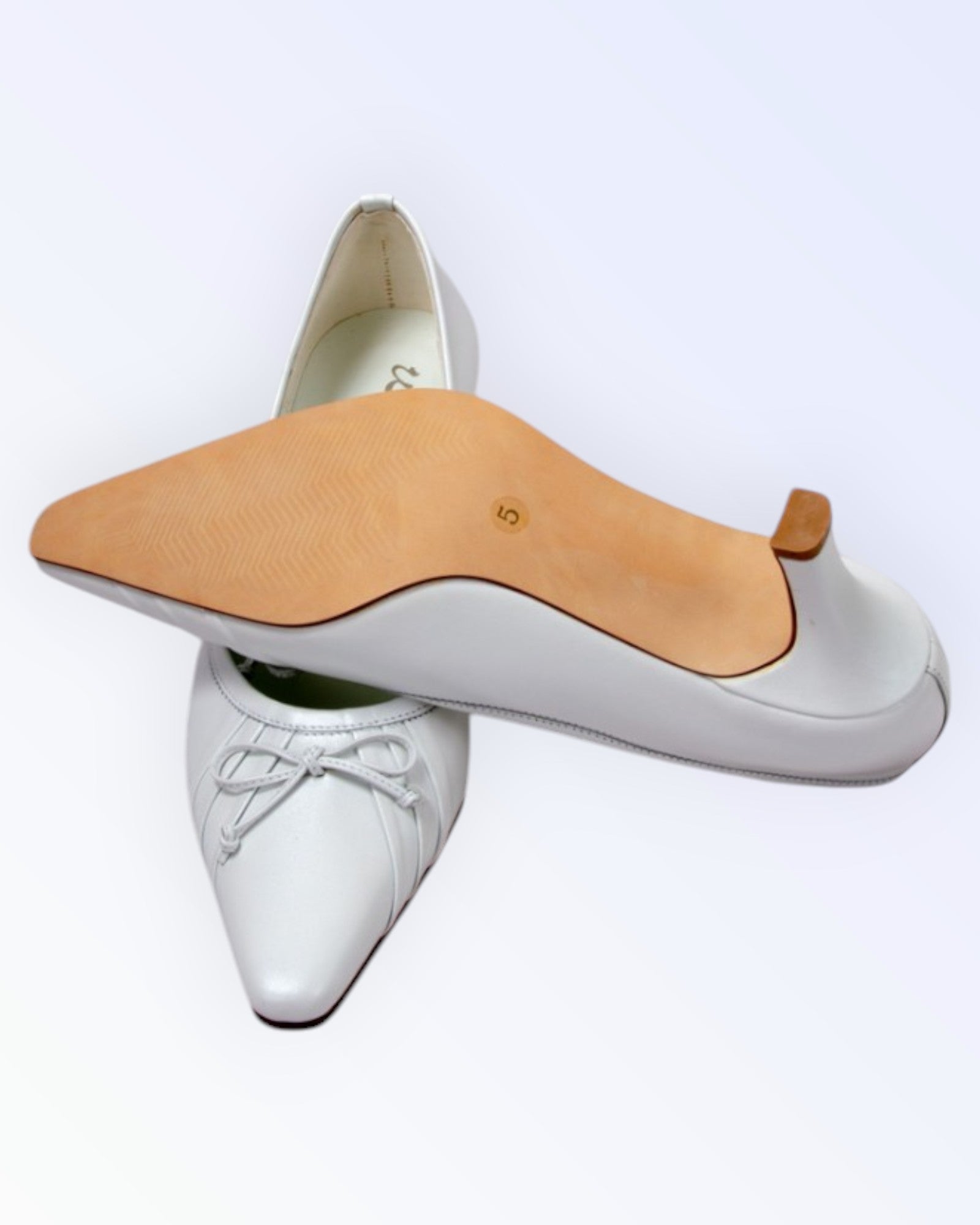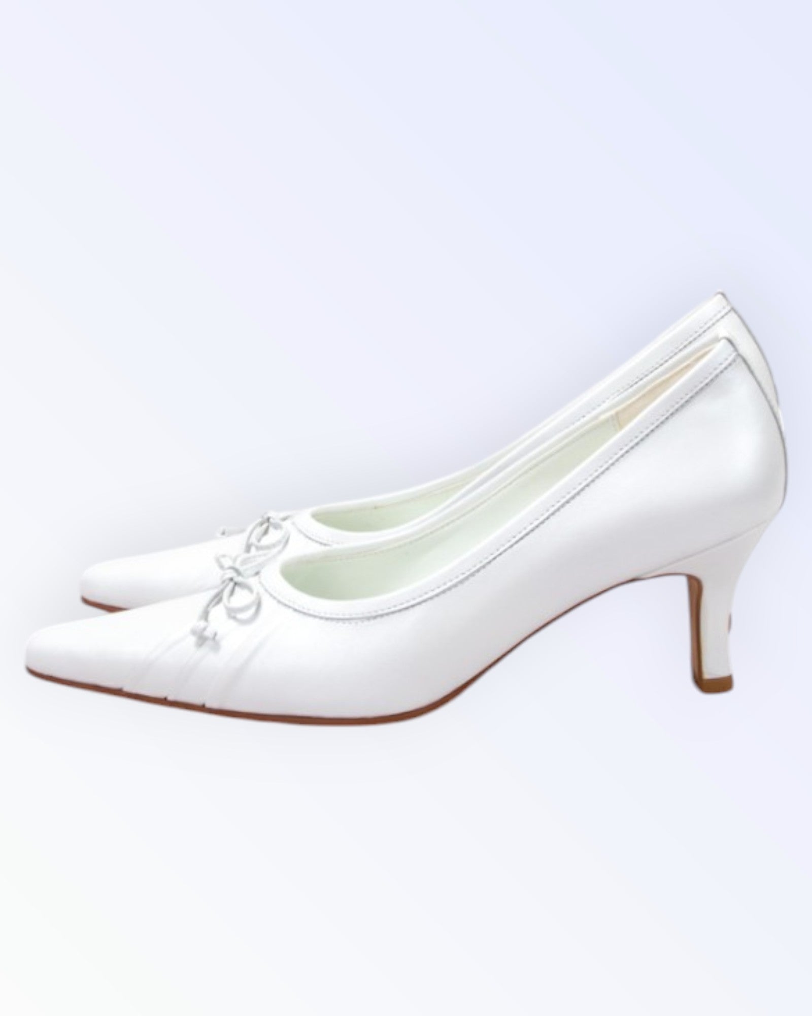 Valkoiset vintage-tyyliset nahkakengät. Tyylikkäissä kengissä on kevyt nahkapohja ja nahkapäällysteinen korko. Ihanteelliset hääkengät.