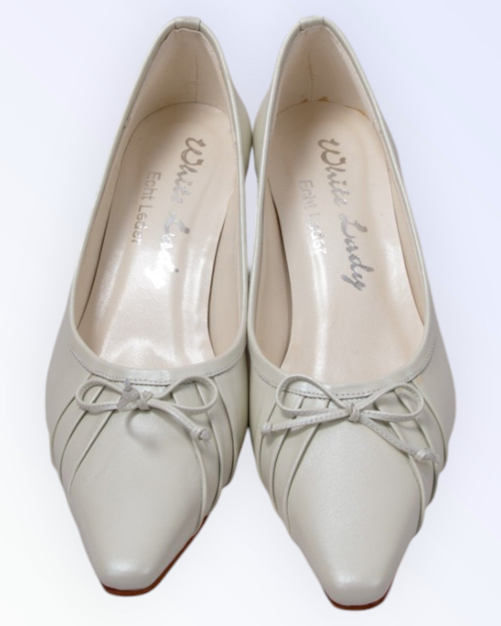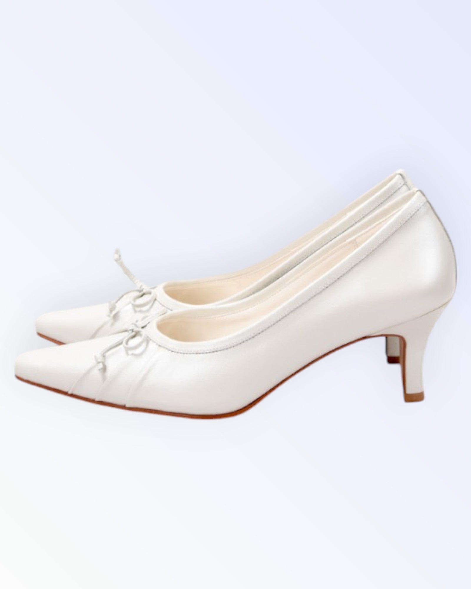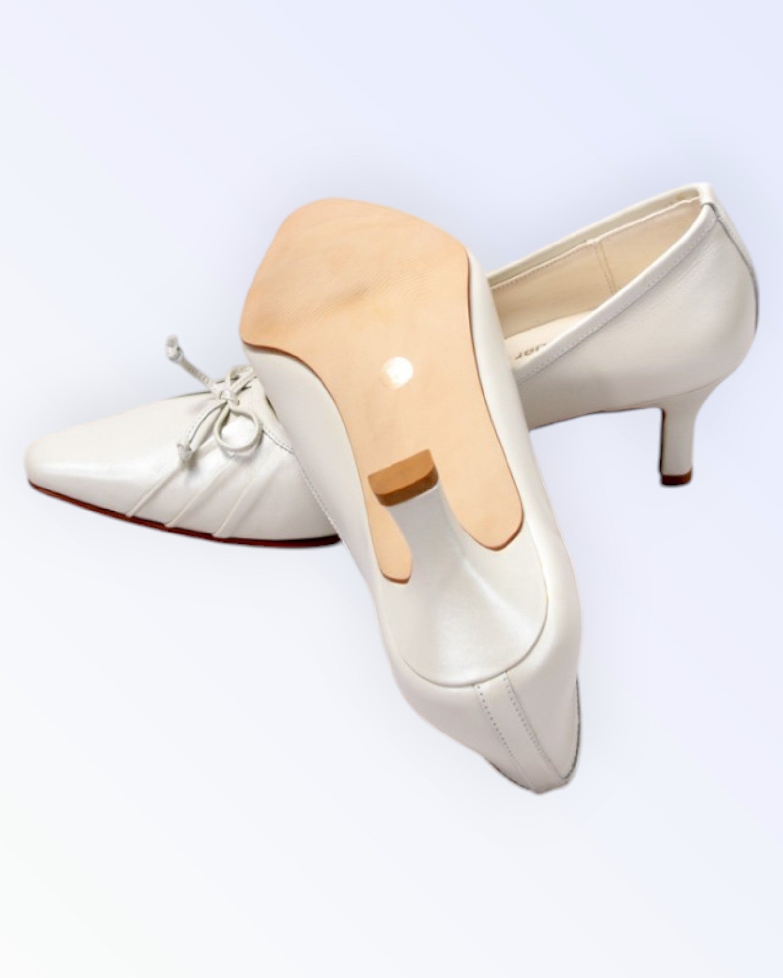 Vintage-tyyliset kengät luonnonvalkoisesta nahasta. Tyylikkäissä kengissä on kevyt nahkapohja ja nahkapäällysteinen korko. Ihanteelliset hääkengät.
