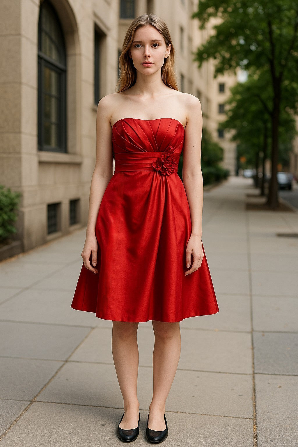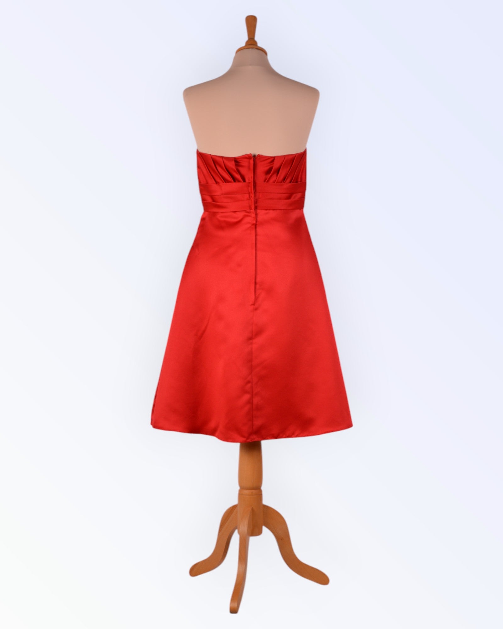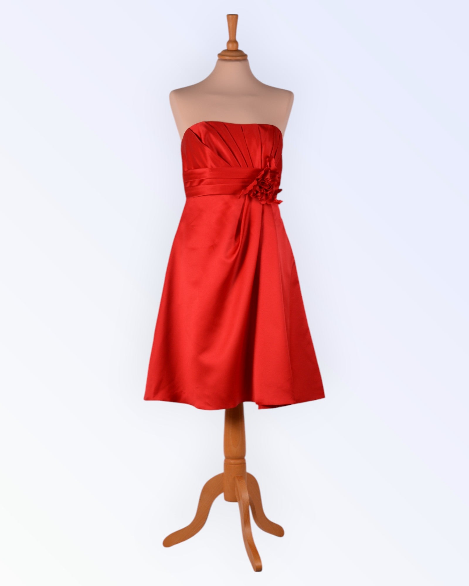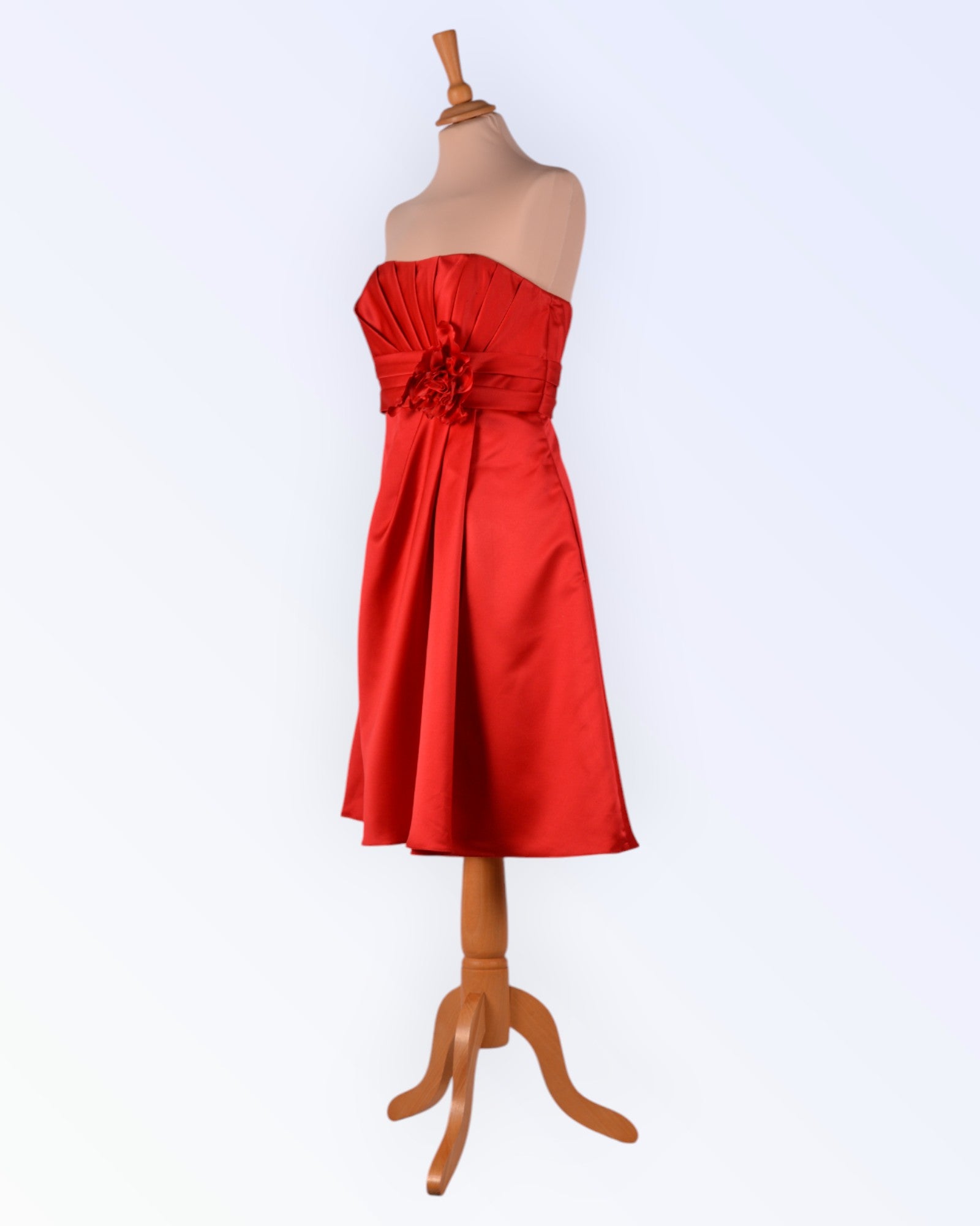 Punasest satiinist asümmeetrilise disainiga õlapaelteta peokleit. Kleidil on korsetiluud ja küljeõmblustesse töödeldud taskud. Voodriga toode.