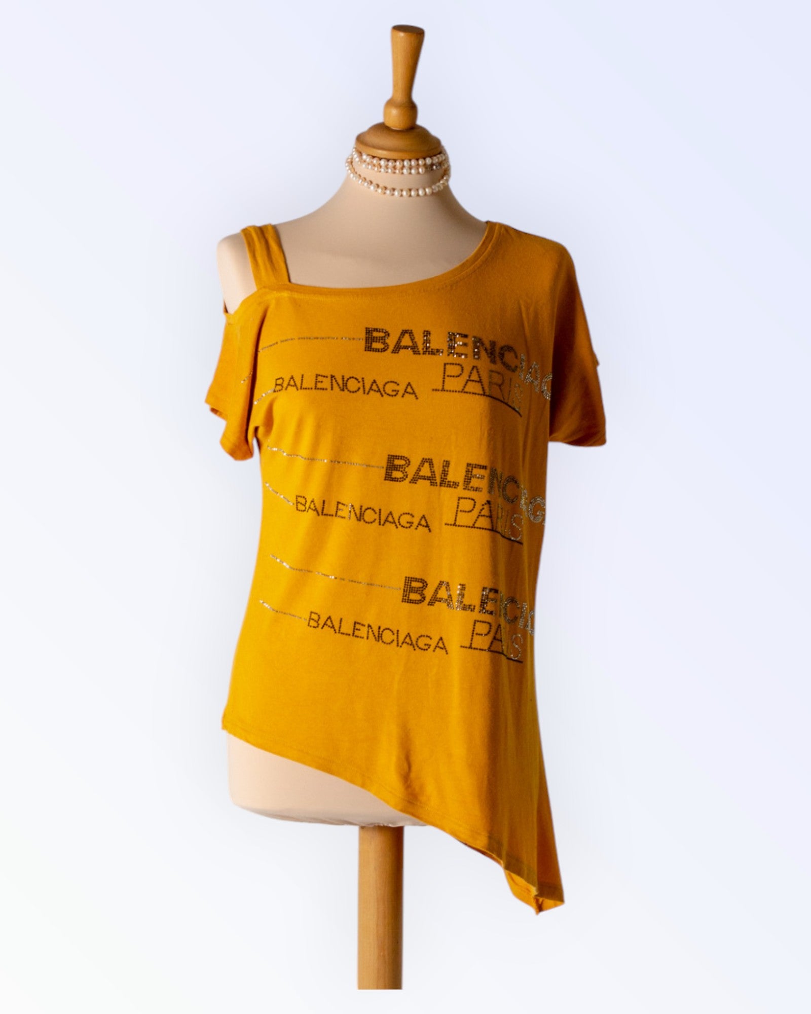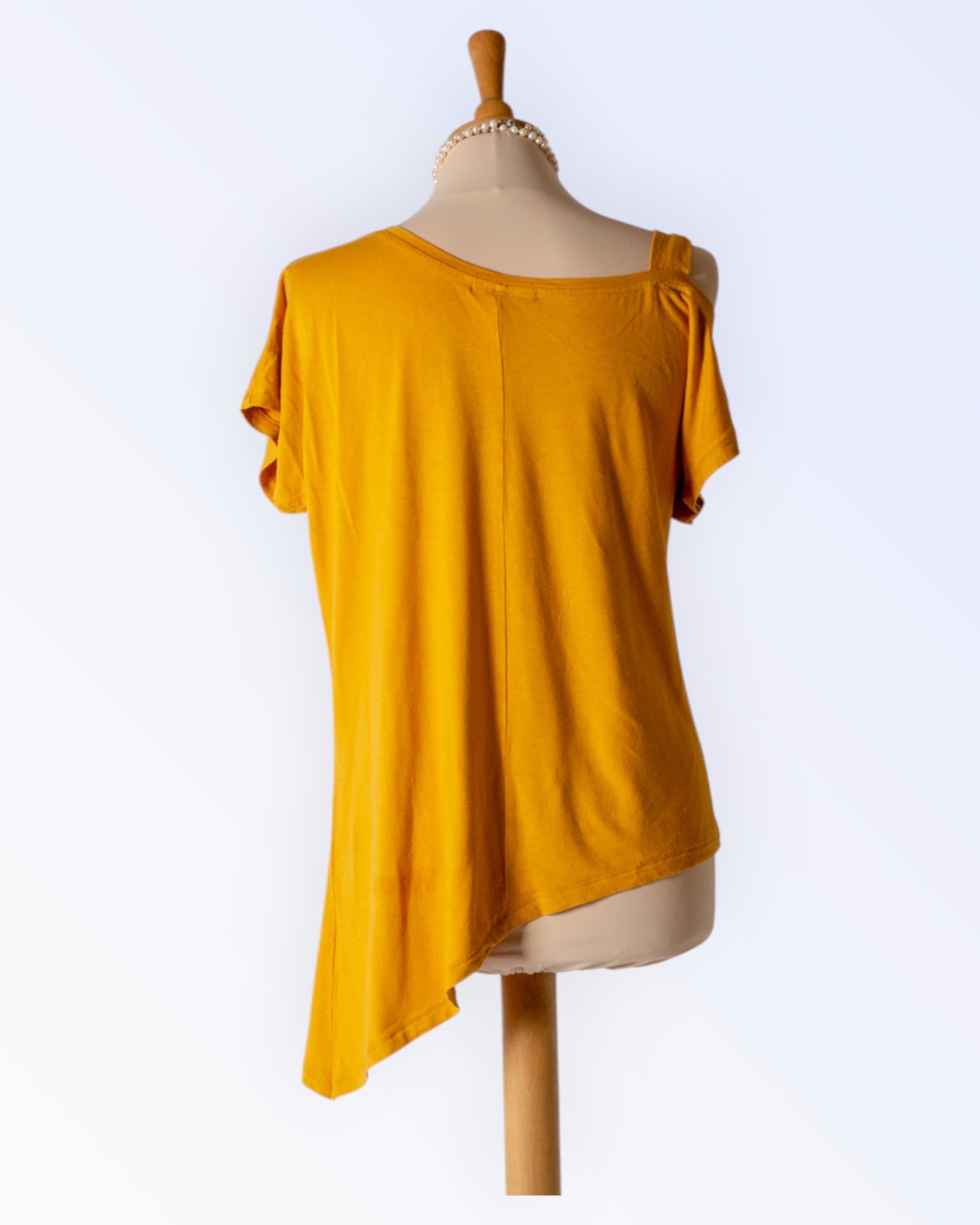 Asümmeetrilise disainiga kollane trikotaažtop.