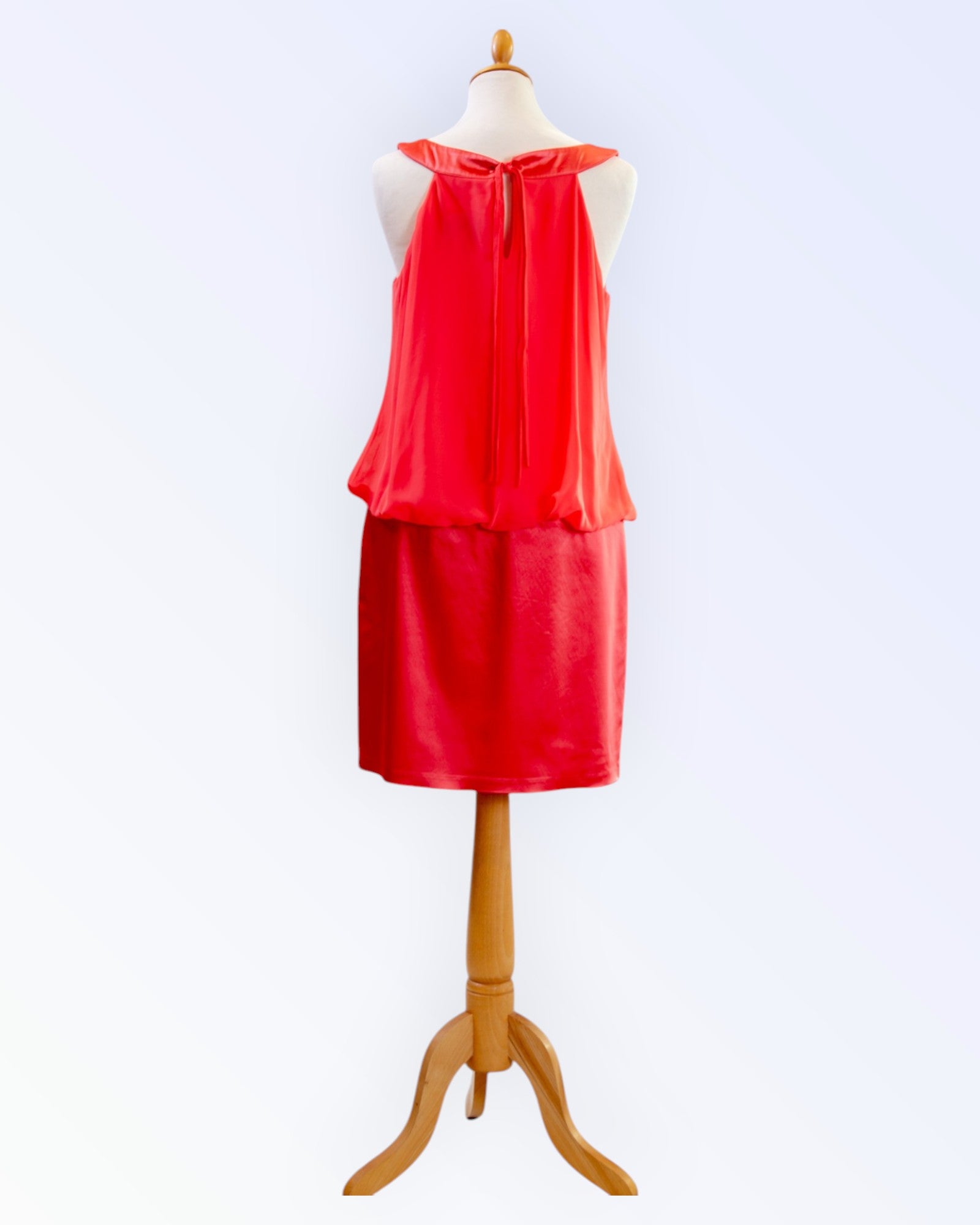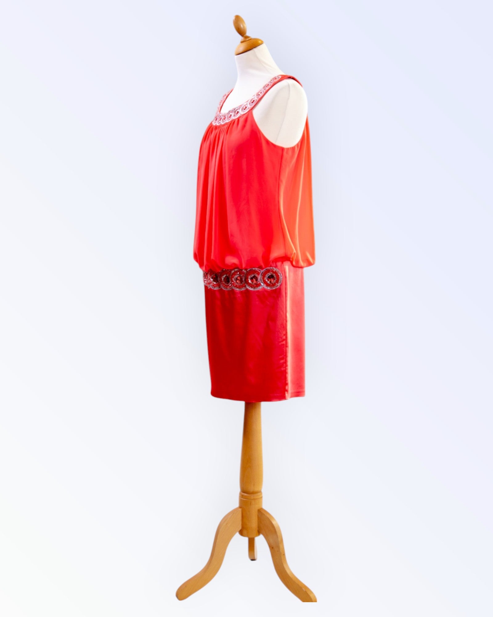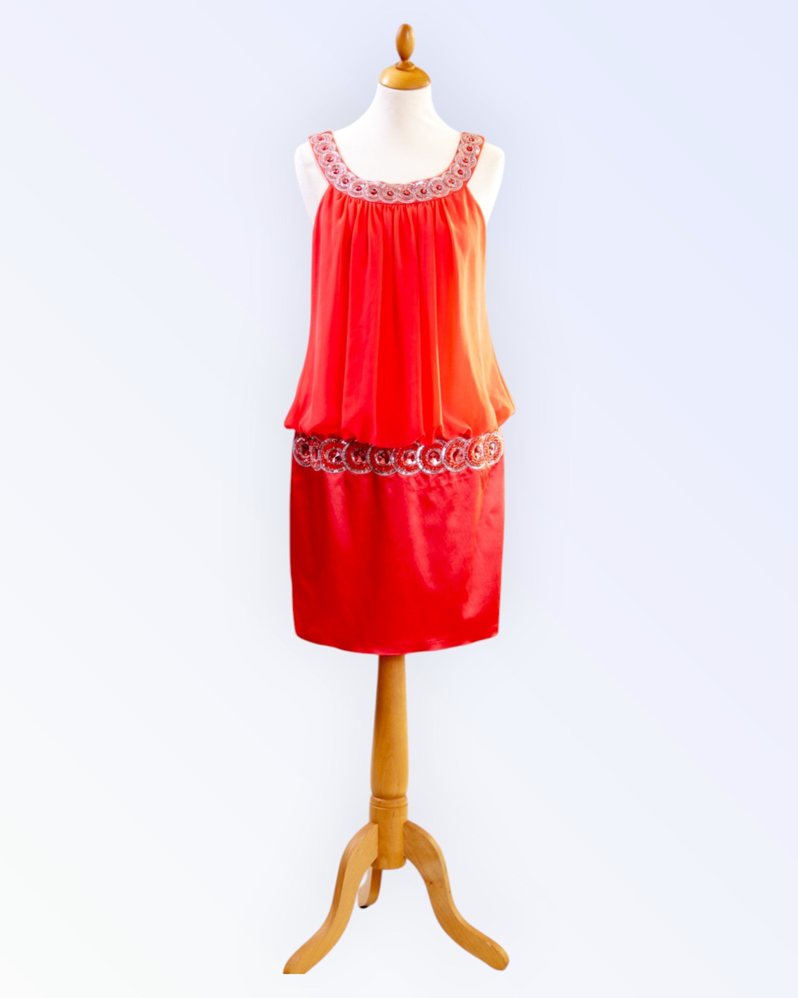 Rikkaliku kaunistusega korall-roosa kasutatud kokteilkleit.
