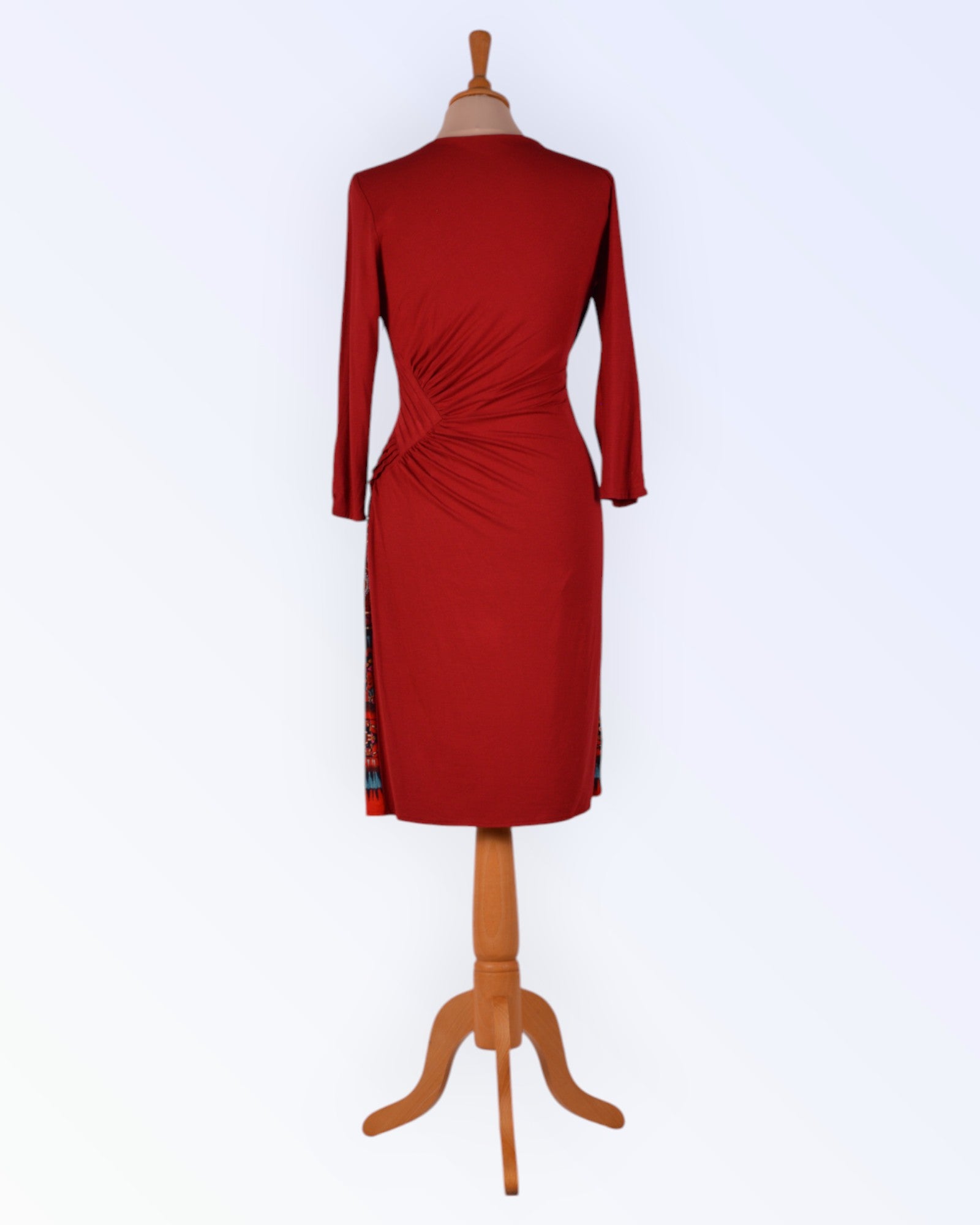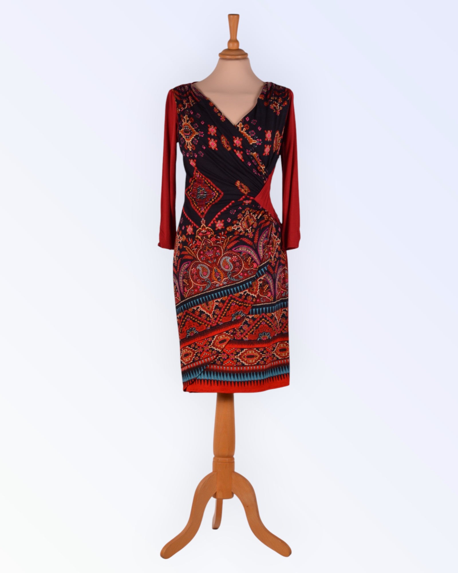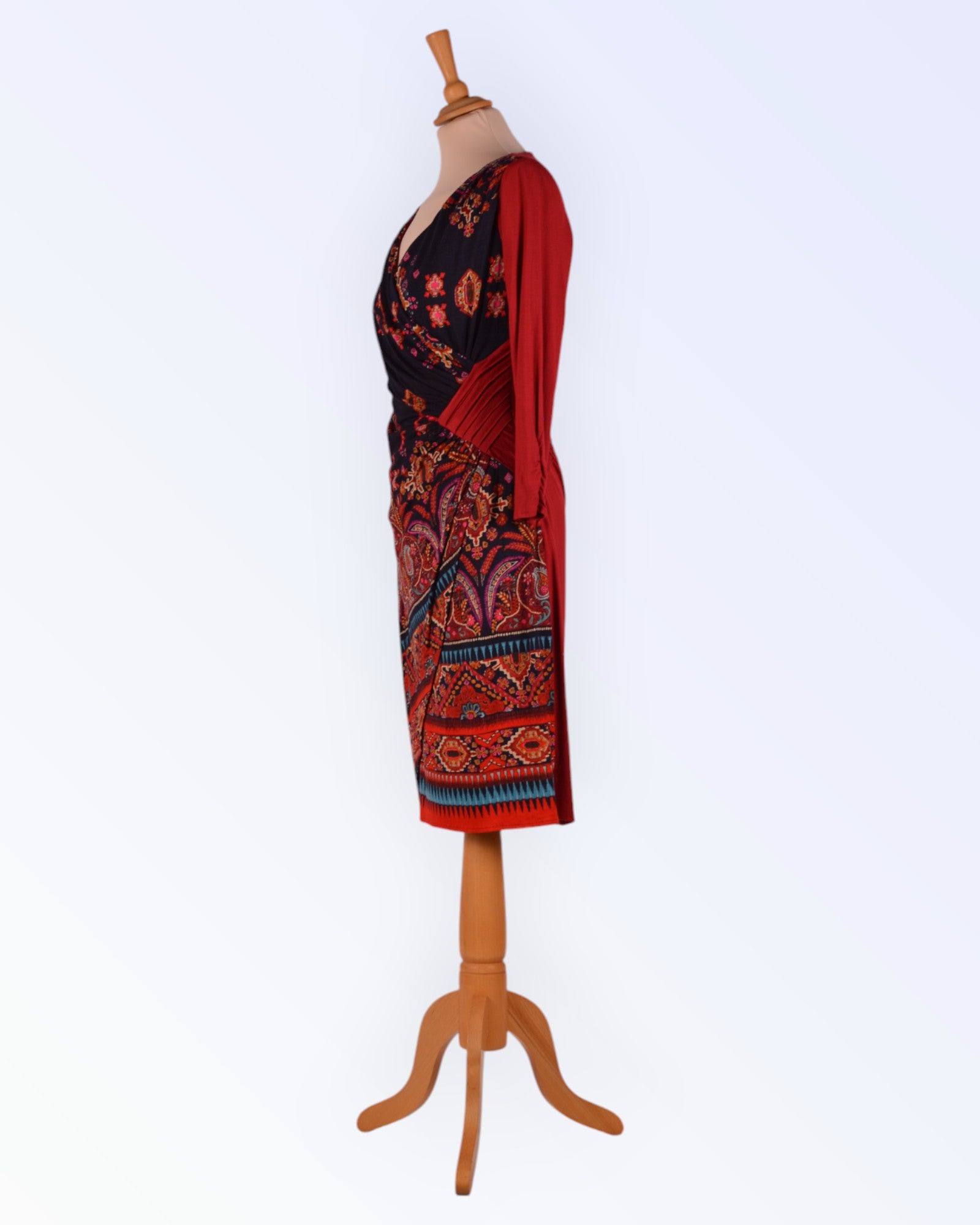 Asümmeetrilise disainiga poolpikkade varrukatega mitmevärviline trikotaažkleit.