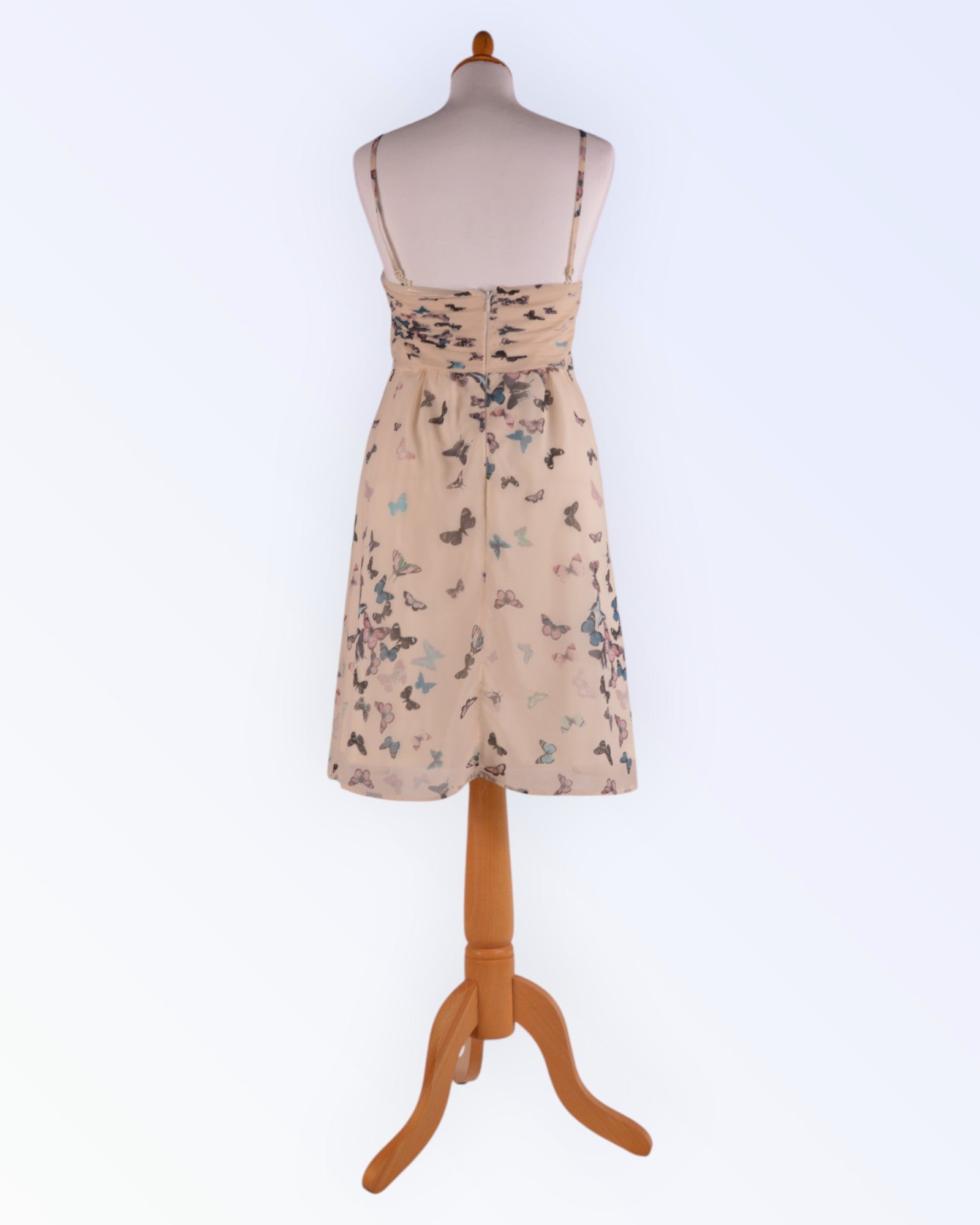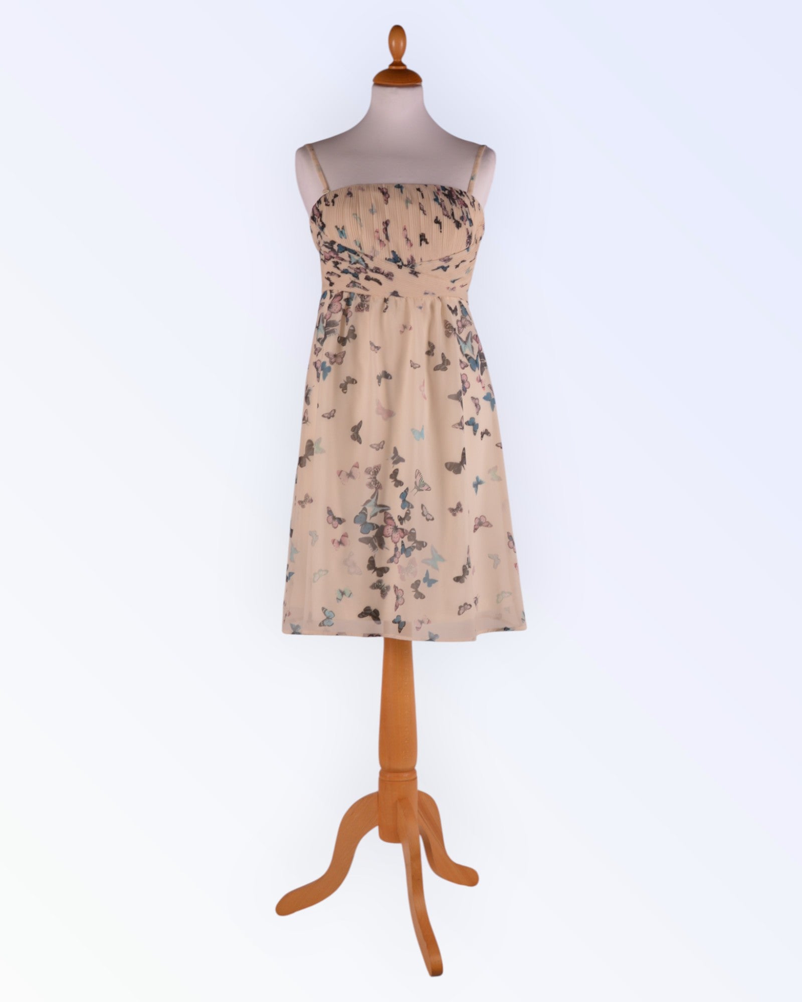 Liblikamustriga kangast ampiirlõikeline pidulik kleit. Õlapaelad eemaldatavad. Voodriga toode. Sobib ka tulevasele emale.
