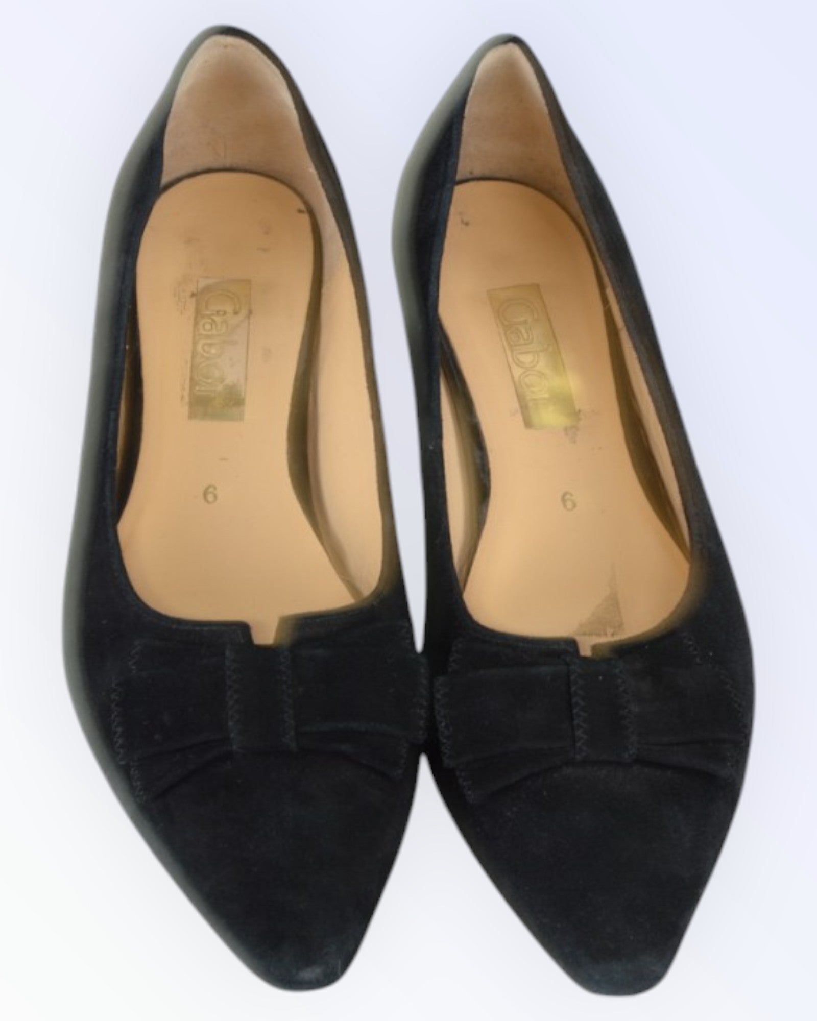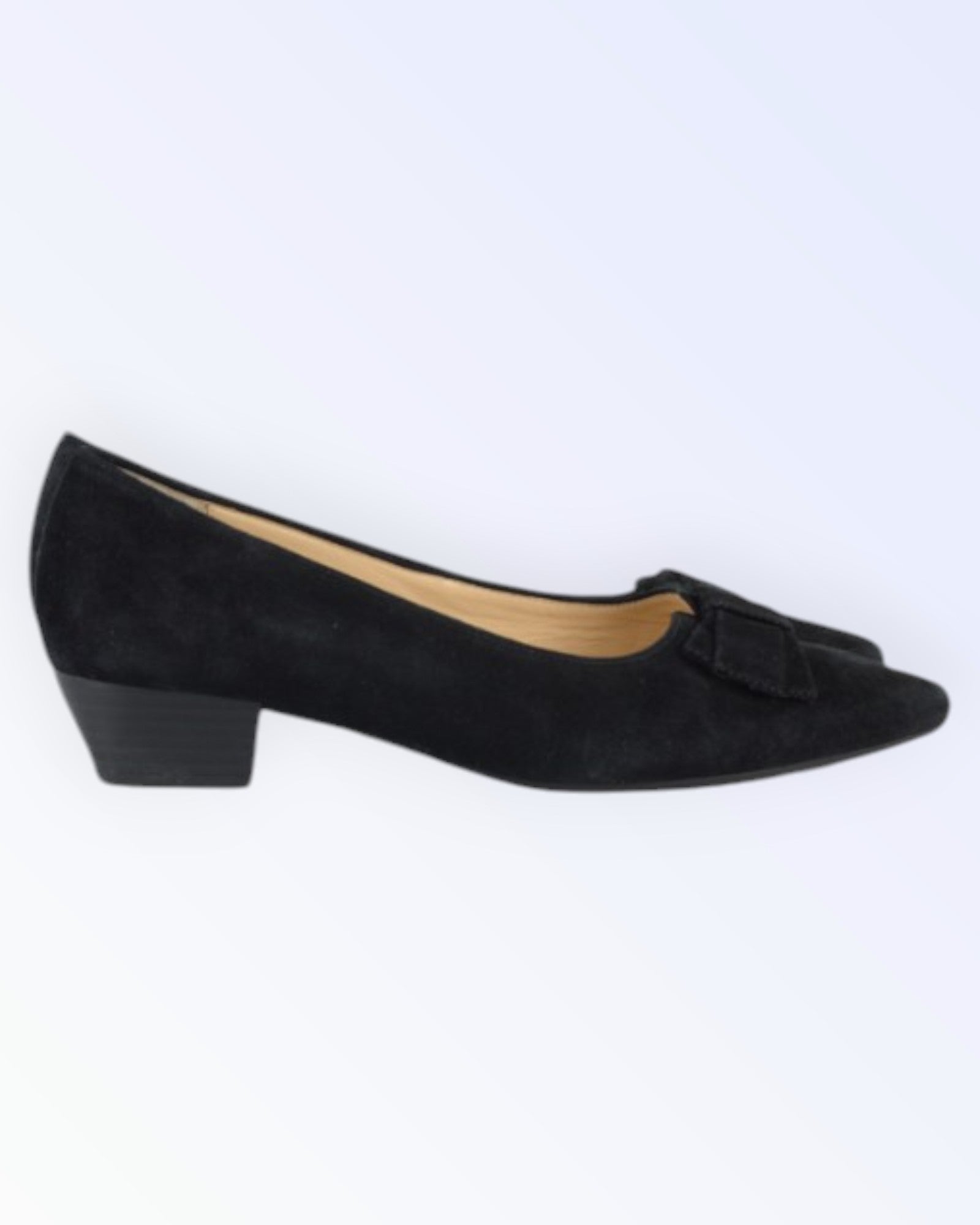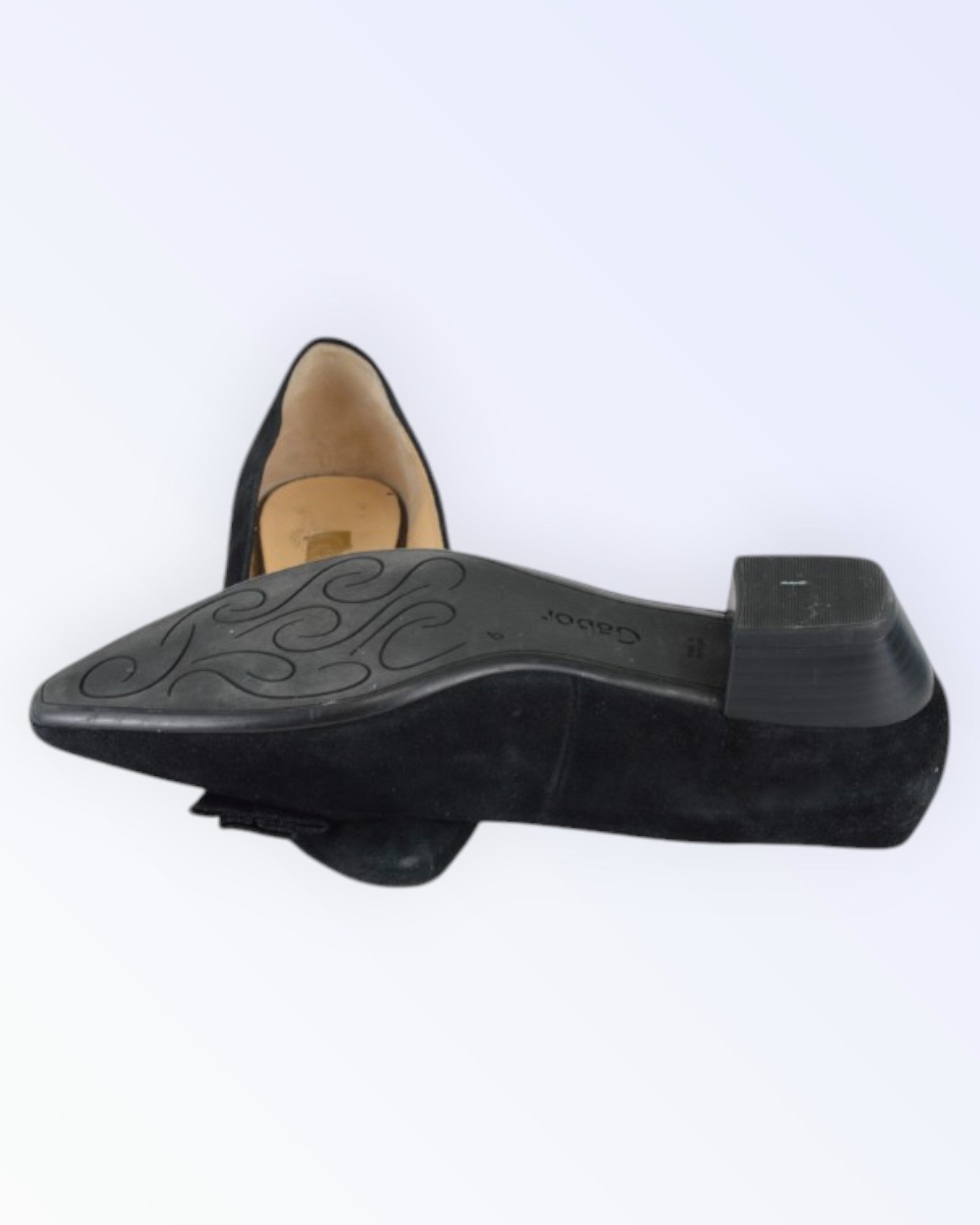 Gabor mustast seemisnahast madalad kingad. Mandlikujulise ninaga kingad on kaunistatud nahast lipsuga.