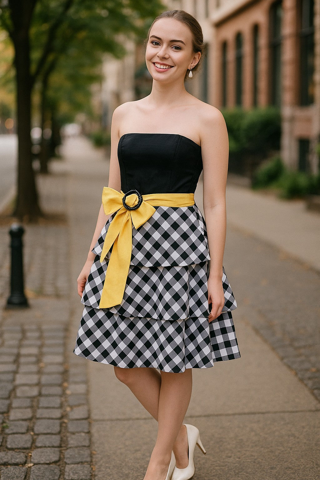 Glitz must-valge kokteilkleit. See suure kollase lipsuga romantilise disainiga kleit on koolipidude lemmik.