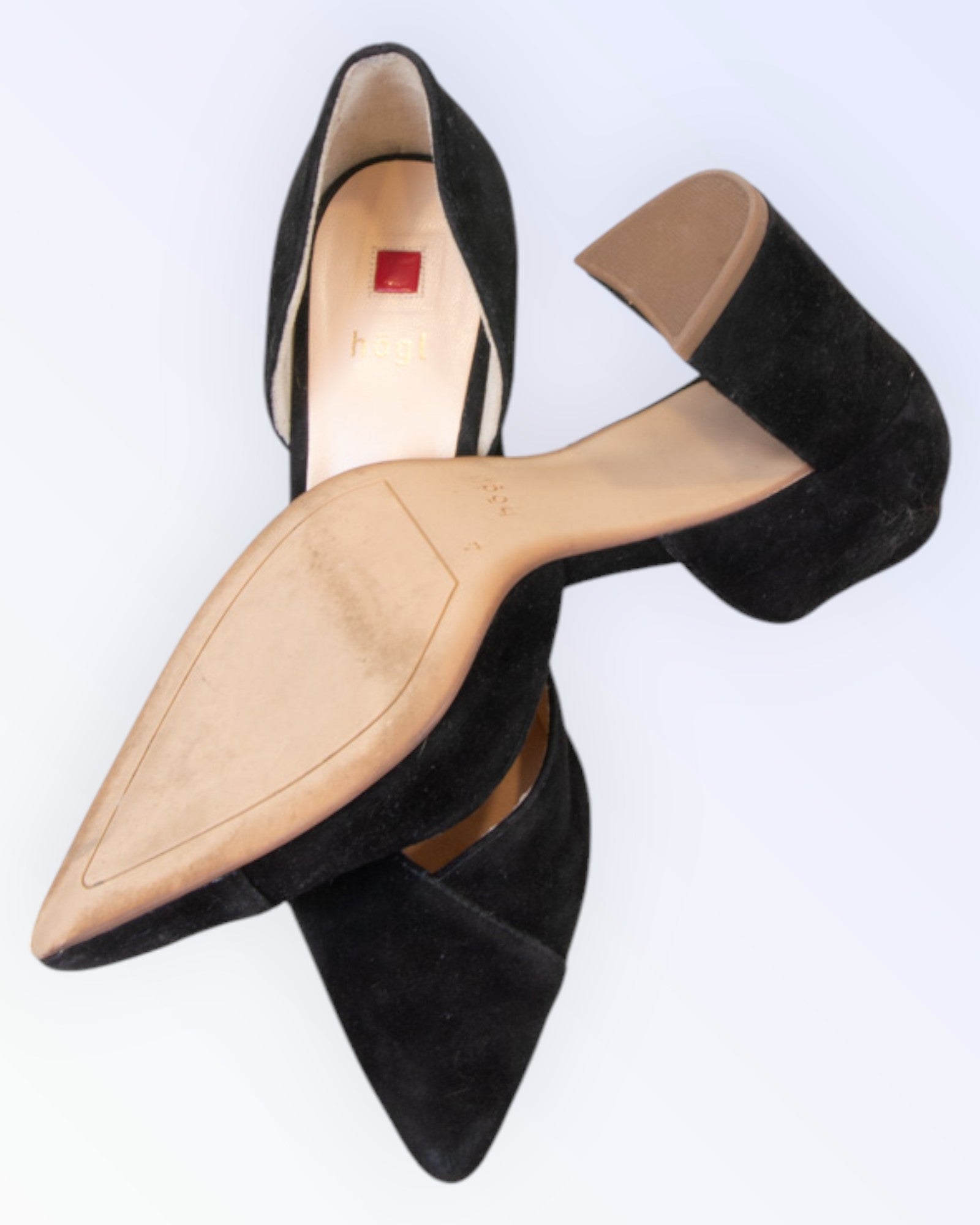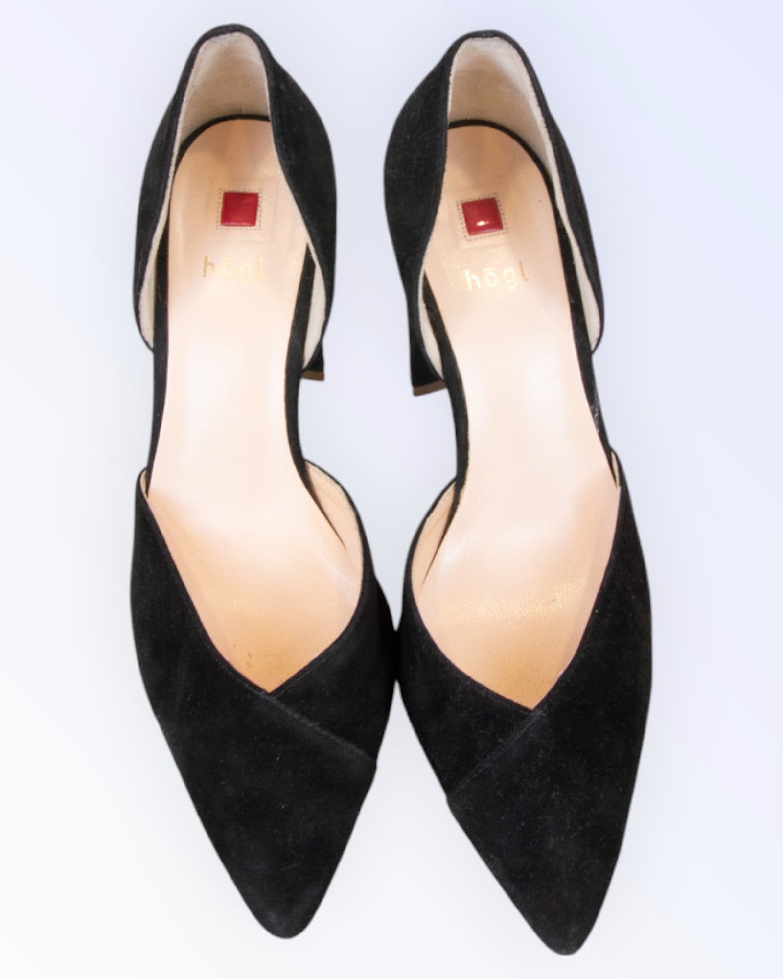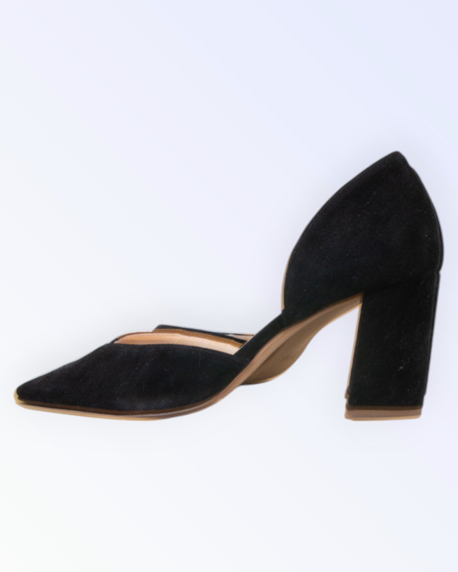 Högl mustad plokk-kontsaga seemisnahast kingad. Konts on kaetud nahaga, mandlikujuline nina.