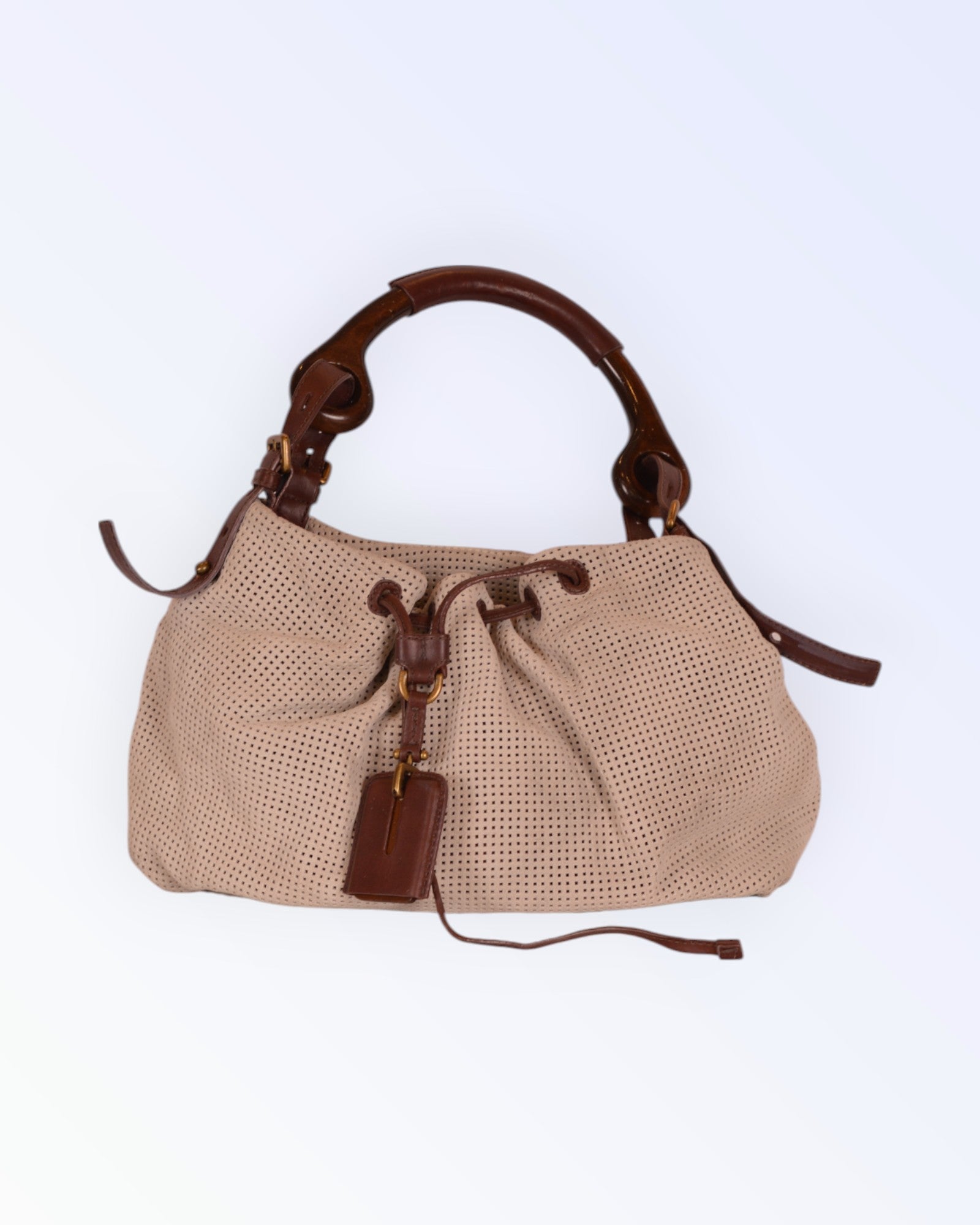 Beežist perforeeritud nahast suvine käekott. Rihmad tumepruunist nahast, sangad puidust.