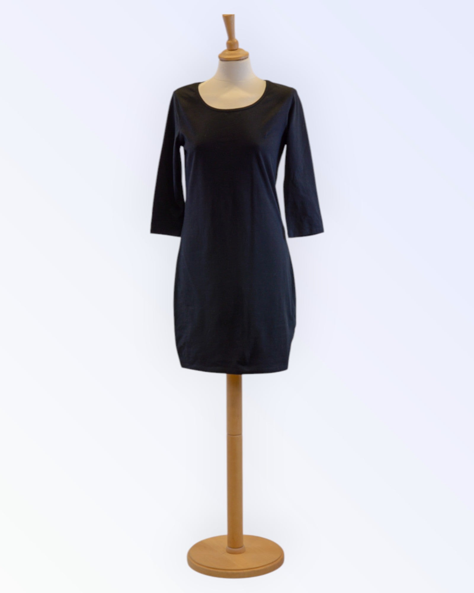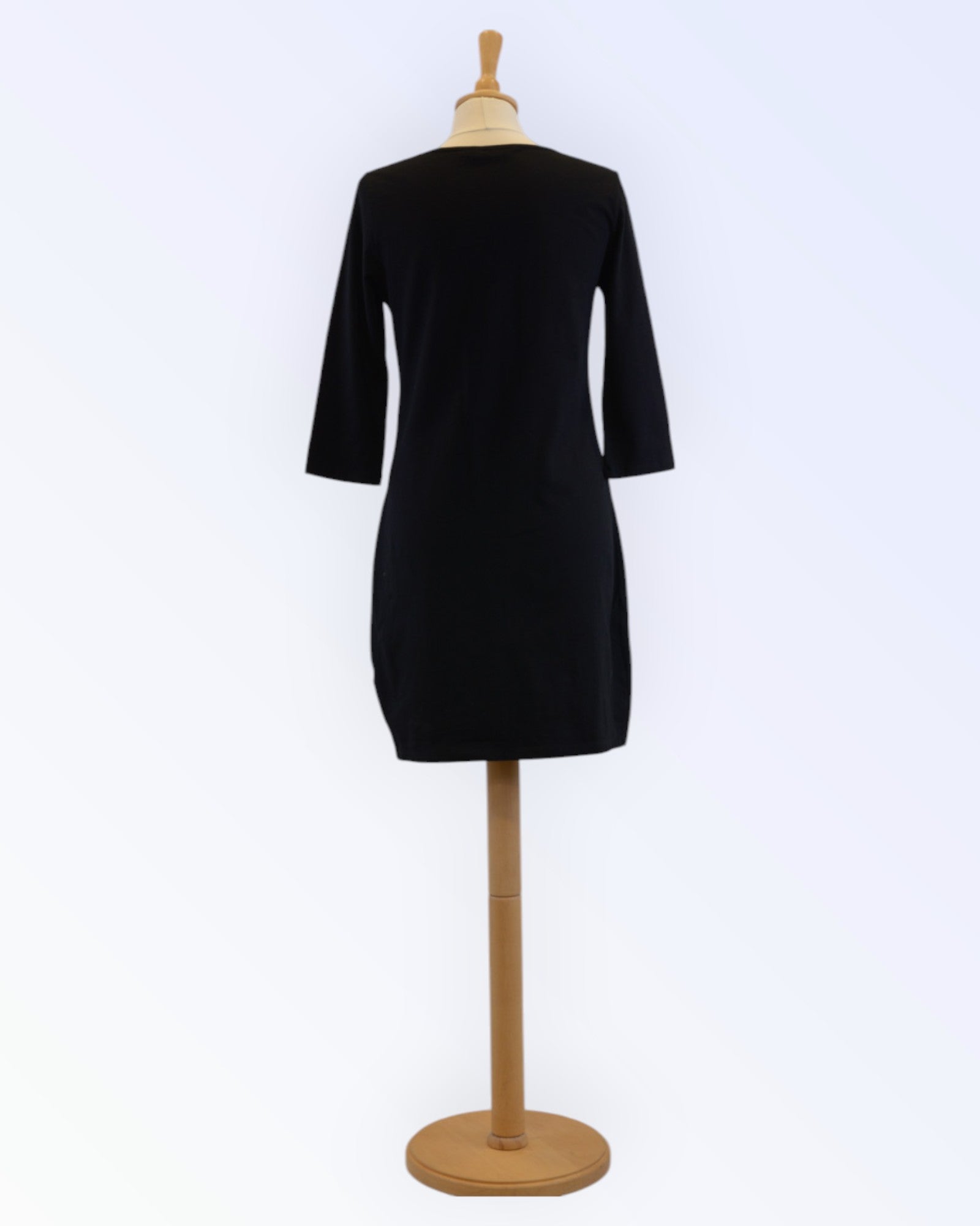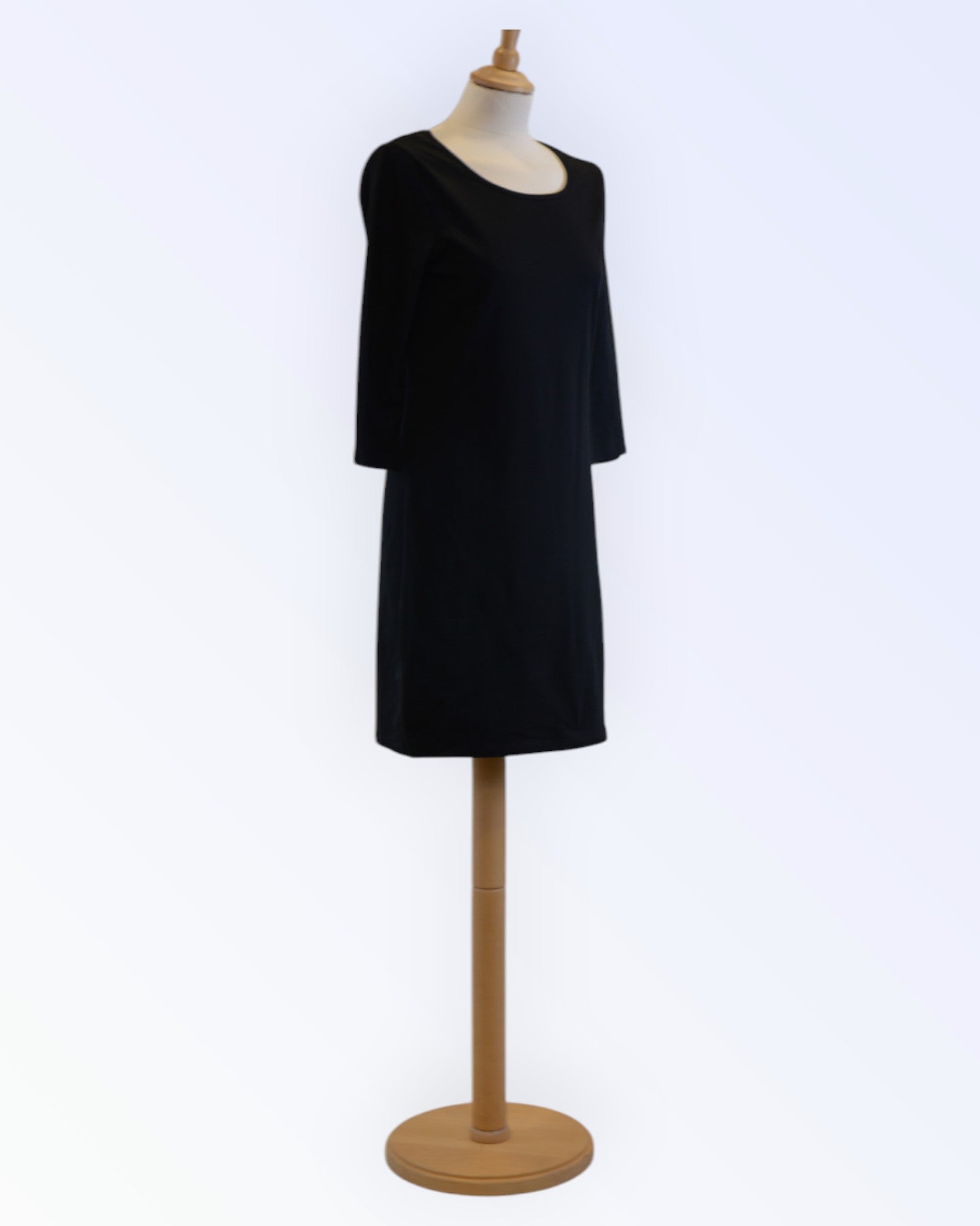 Mustast trikotaažist poolpikkade varrukatega tuunika.