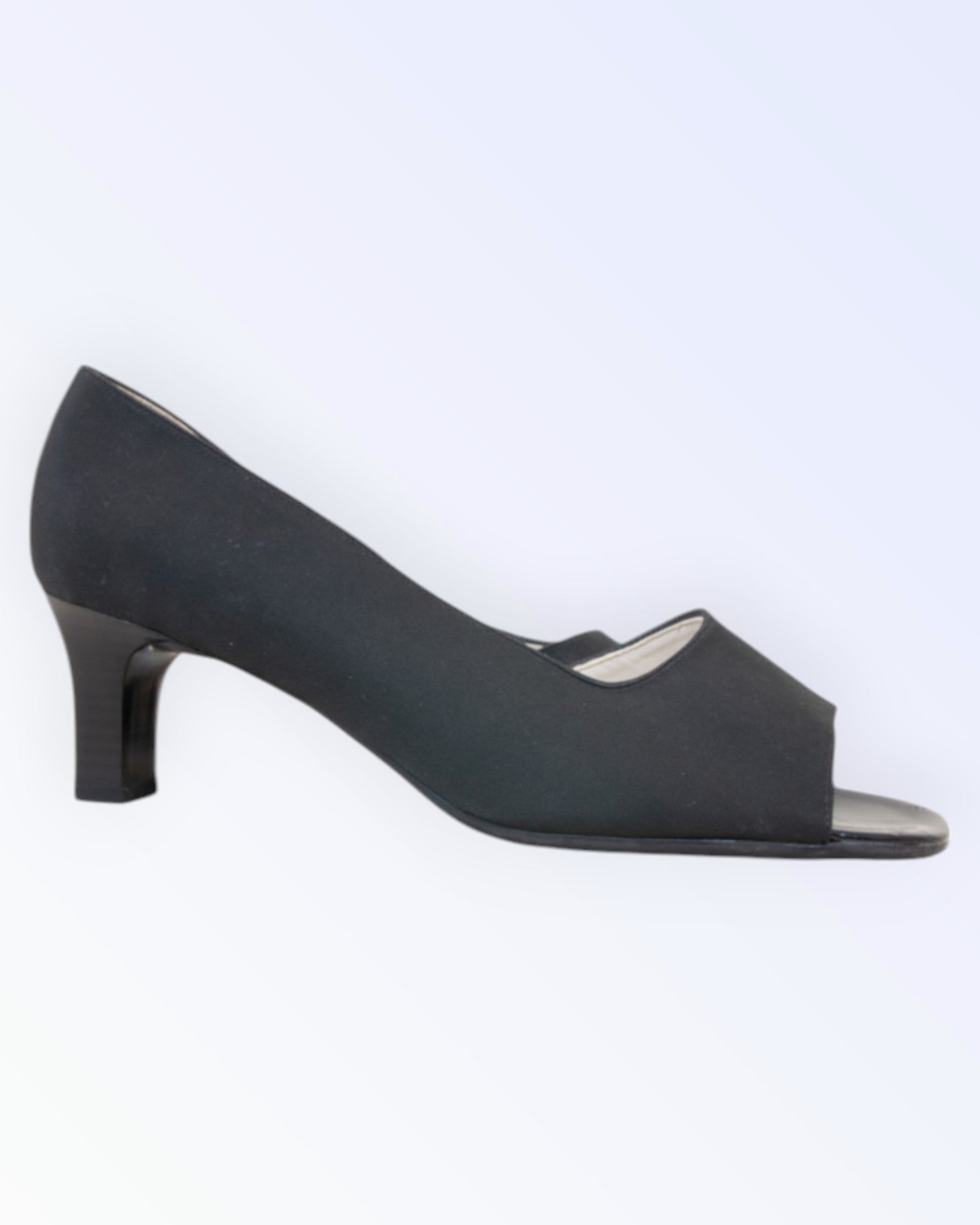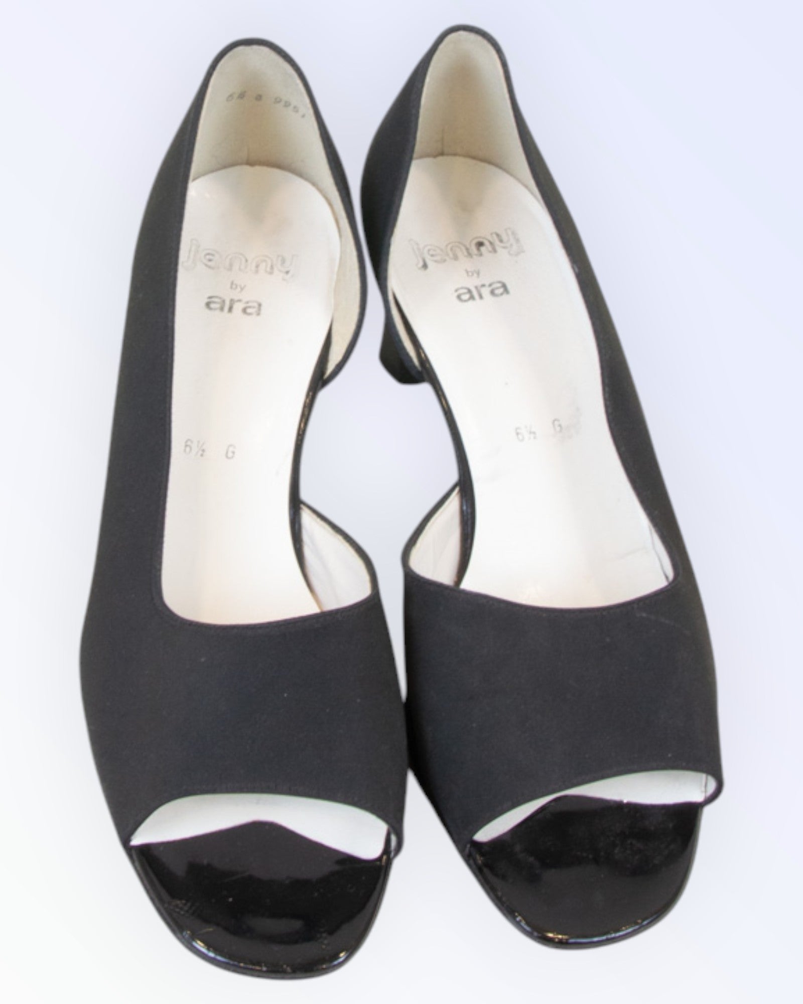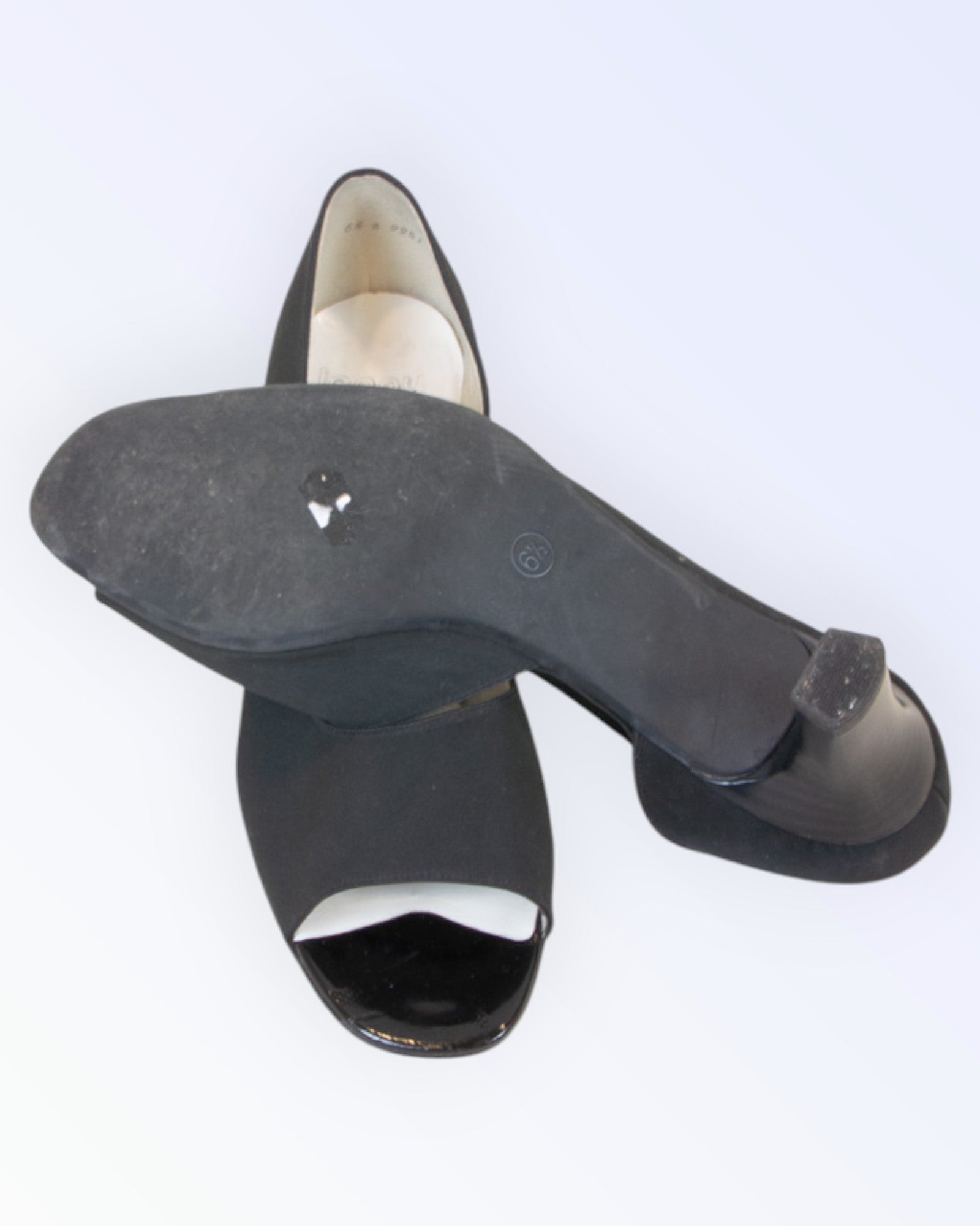 Mustast tekstiilist laia liistuga lahtised kingad.