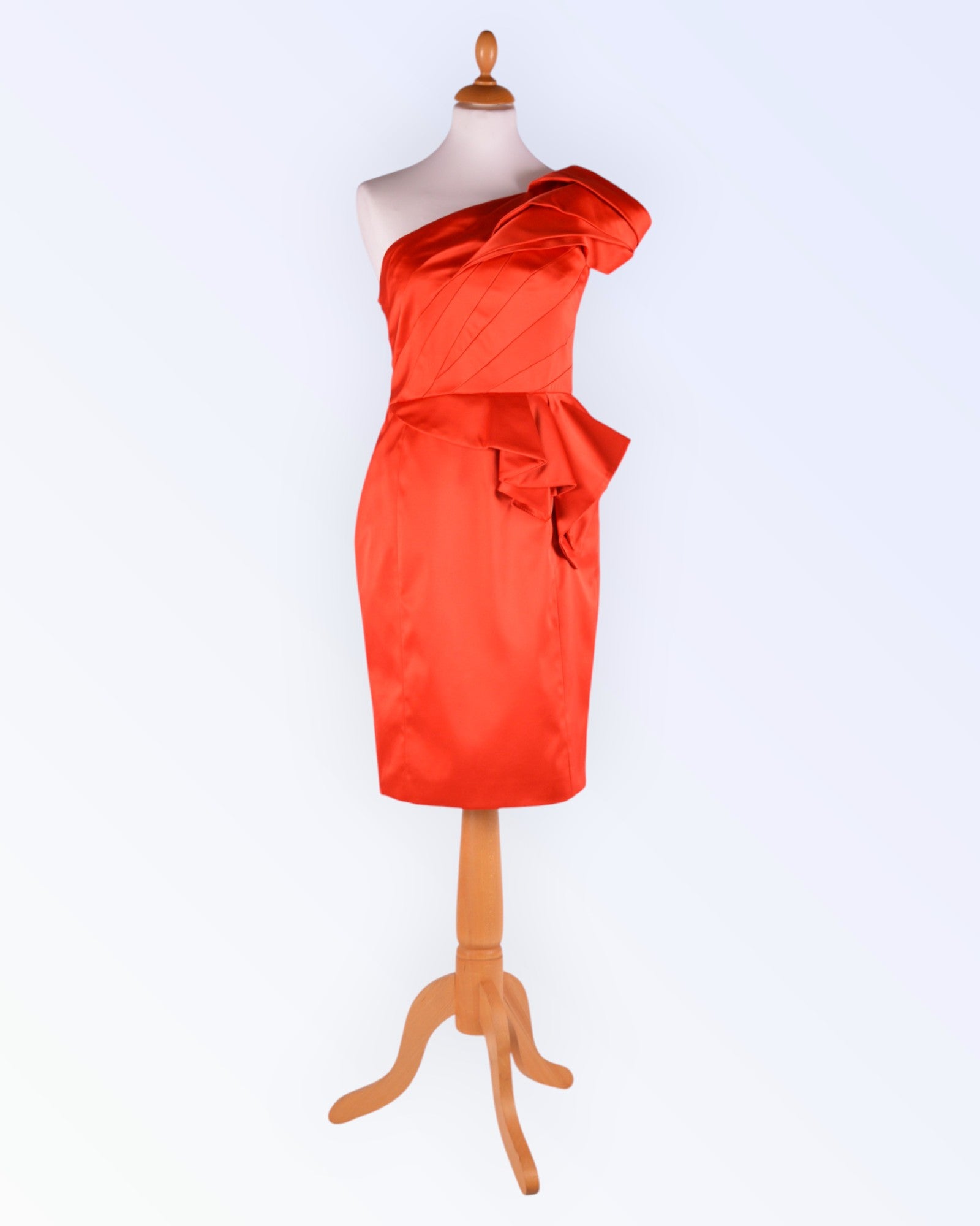 Asümmeetrilise disainiga punasest satiinist kokteilkleit. Voodriga toode.