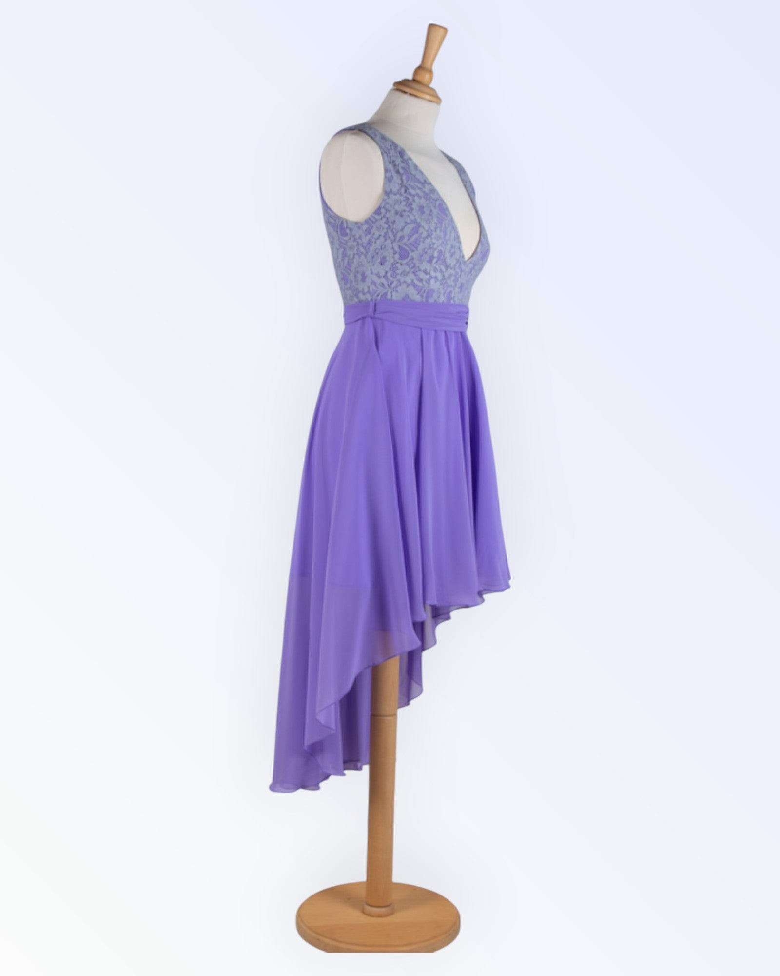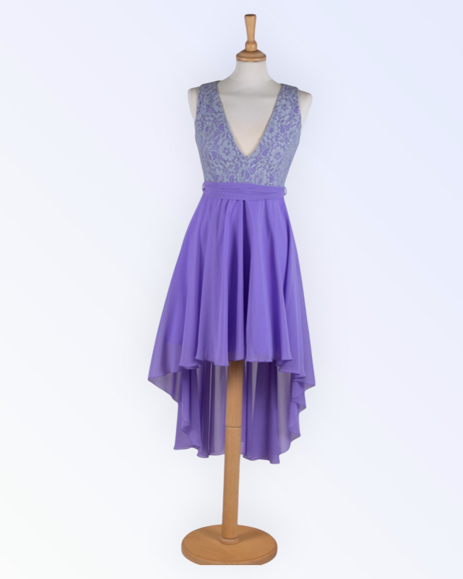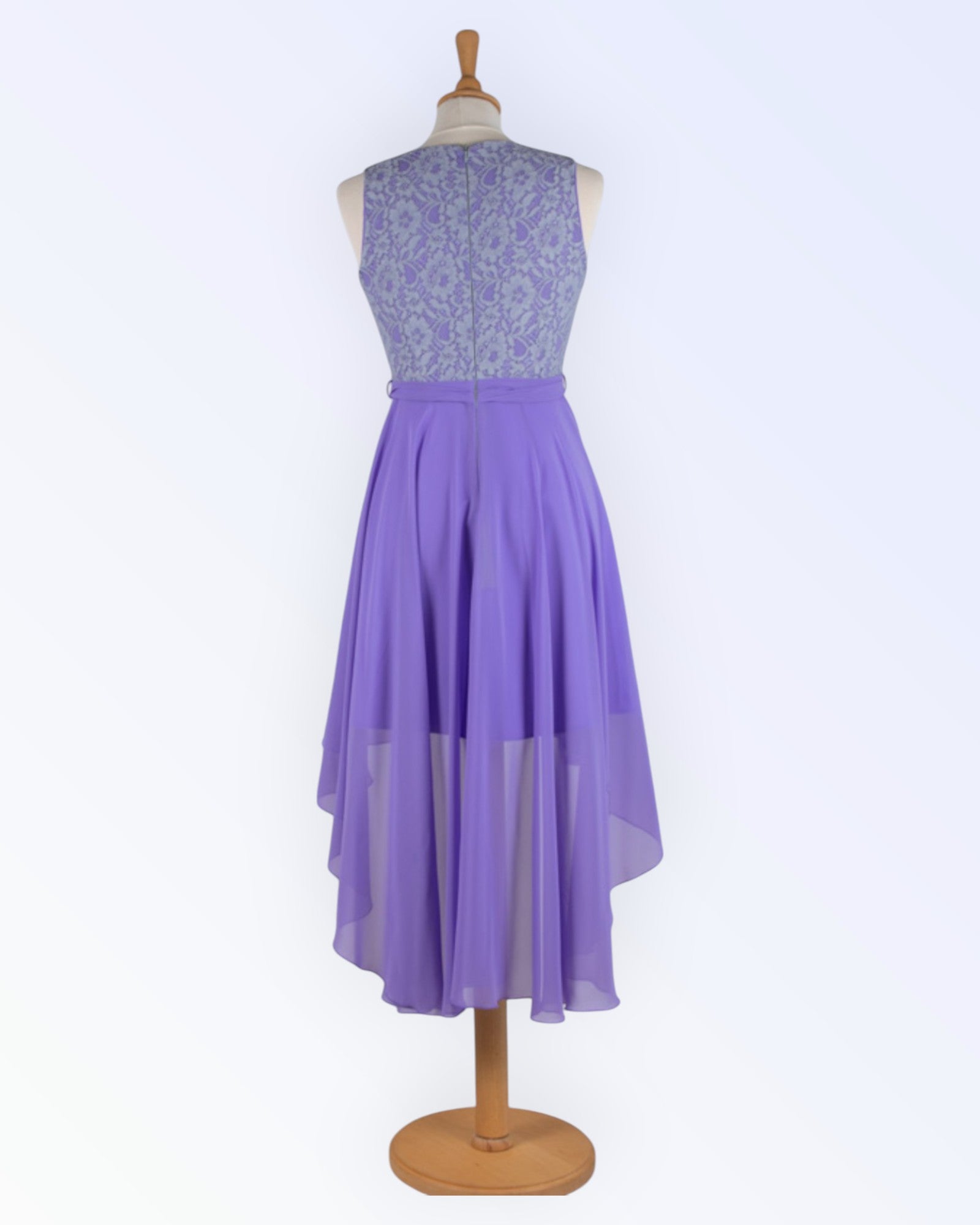 Lillast šifoonist high-low alläärega kokteilkleit. Kleidi kehaosa on kaetud halli pitsiga.
