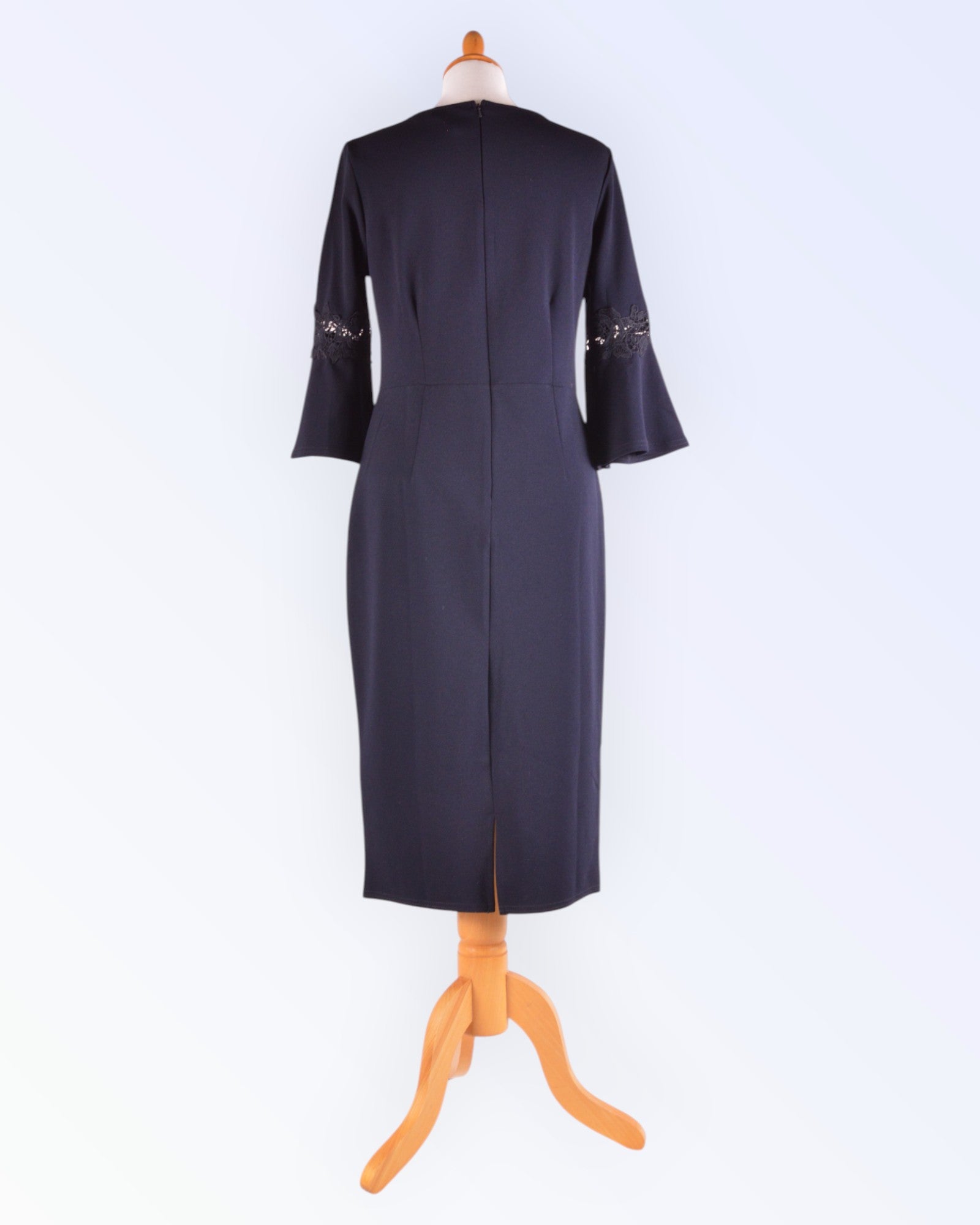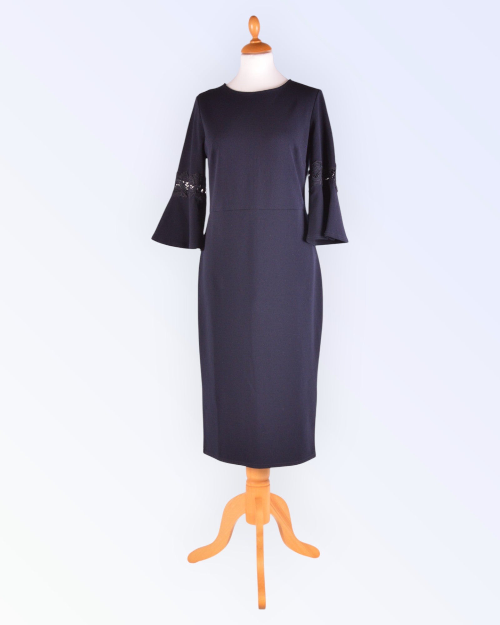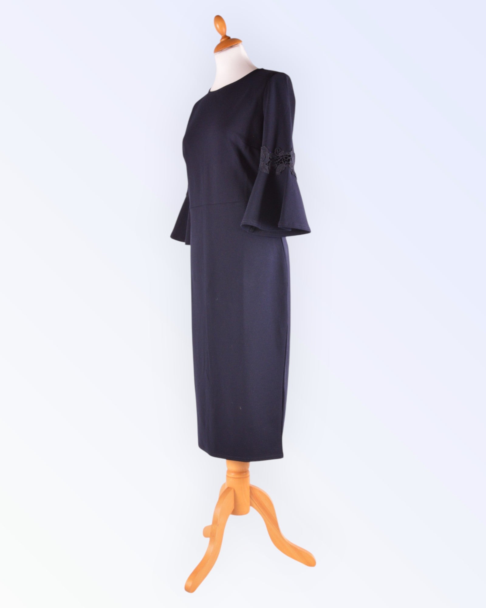 Paksemast tumesinisest trikotaažist poolpikkade varrukatega pidulik kleit. Voodrita toode.