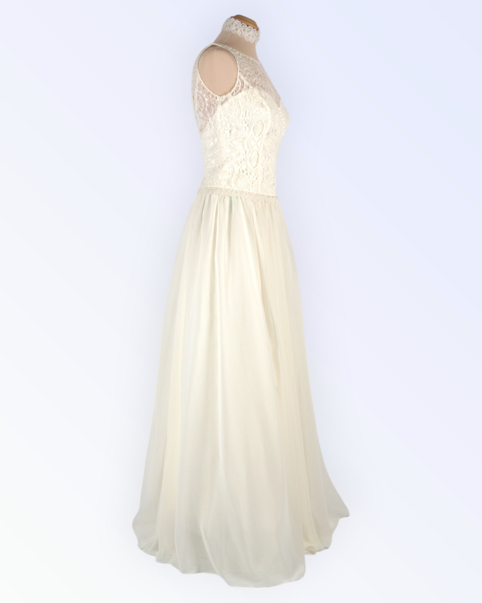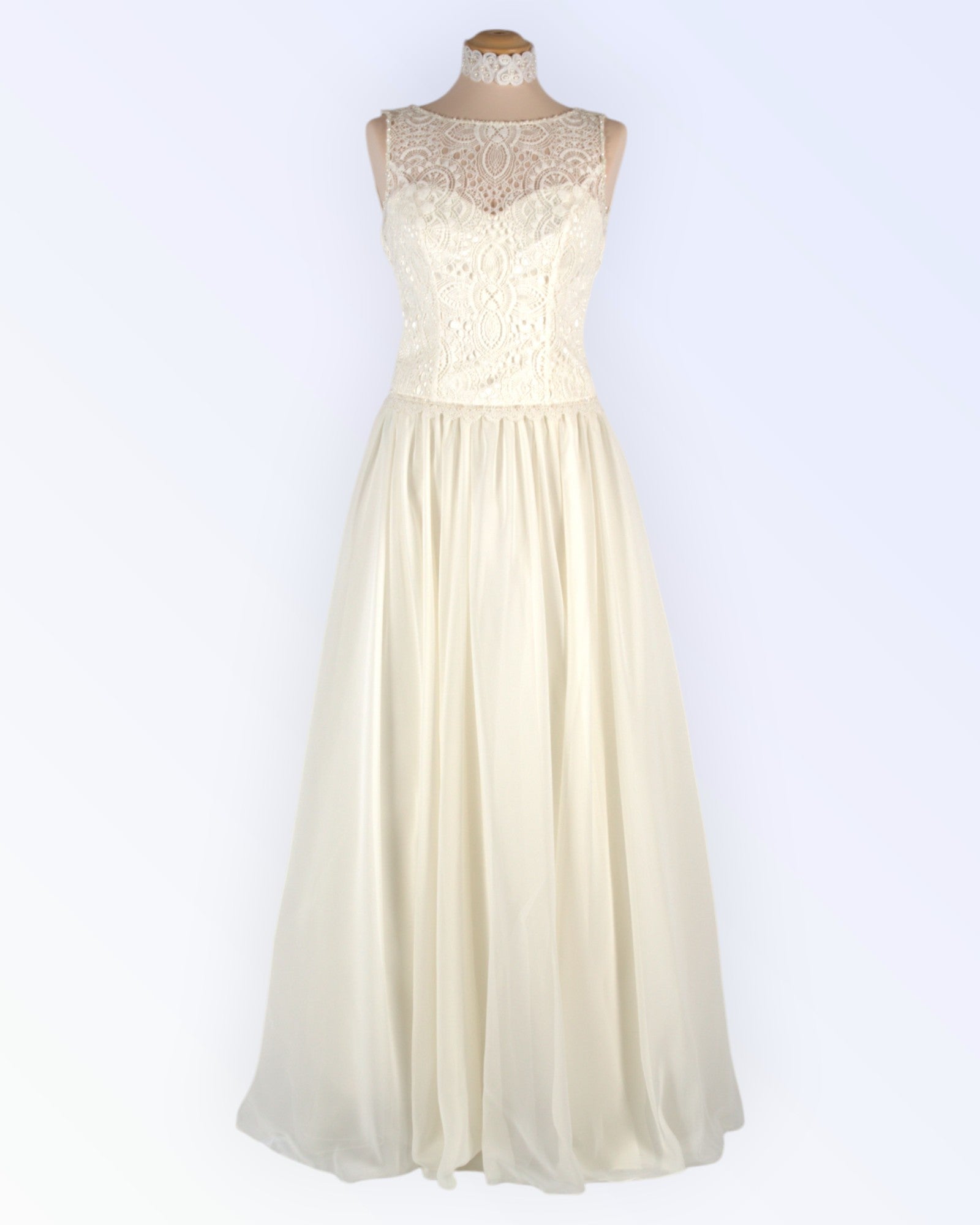 Sümmeetrilise mustriga pitsist pihaosa ja lendlevast šifoonist kroogitud seelikuga pulmakleit. Kaeluse ja käeaukude servad on kaunistatud helmestega. Avatud seljaosa.