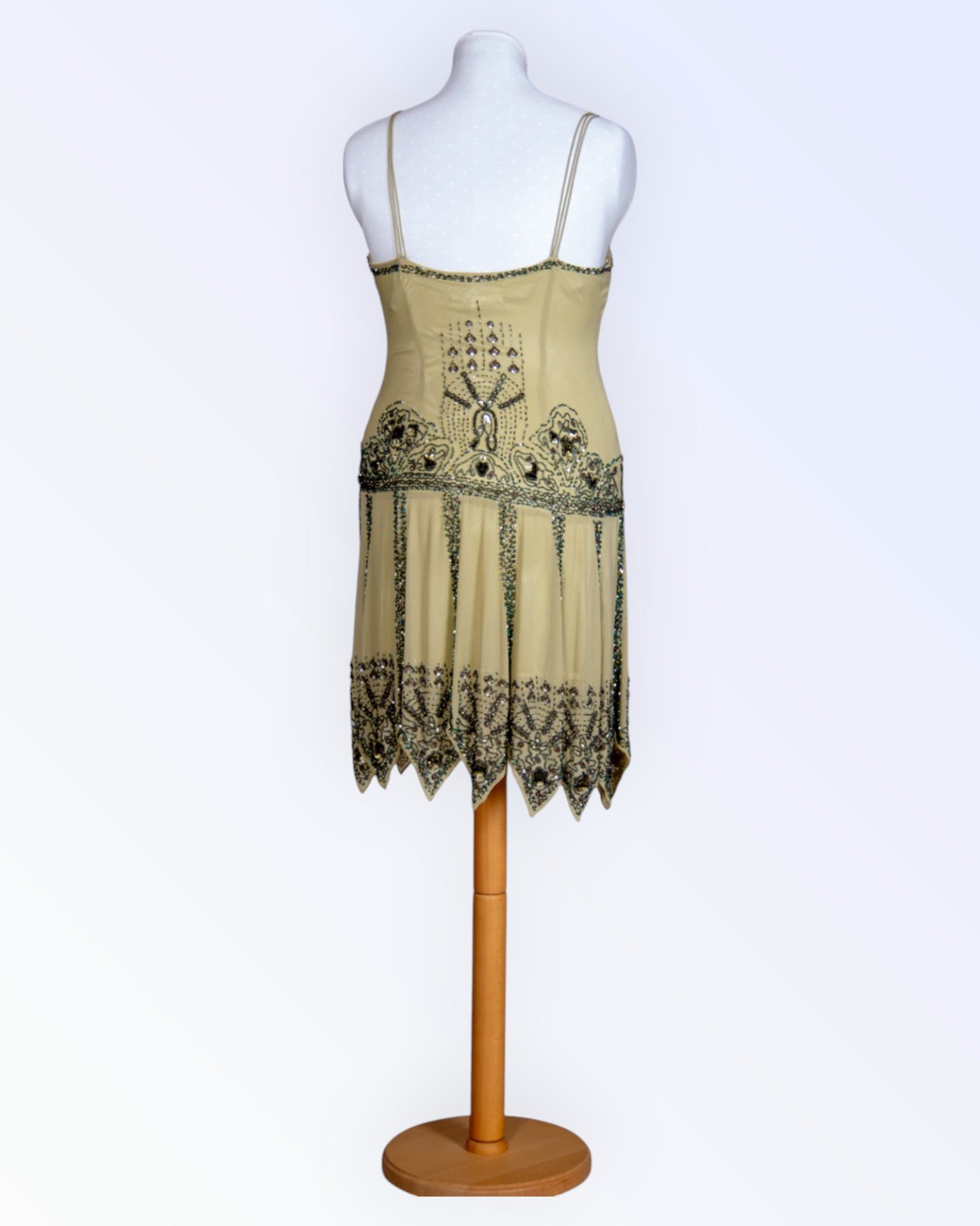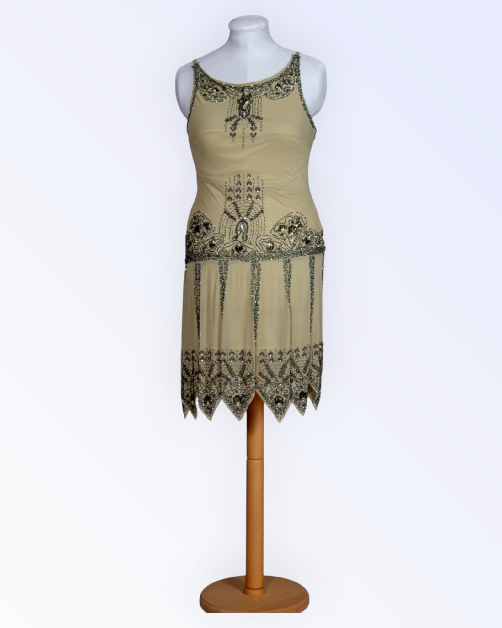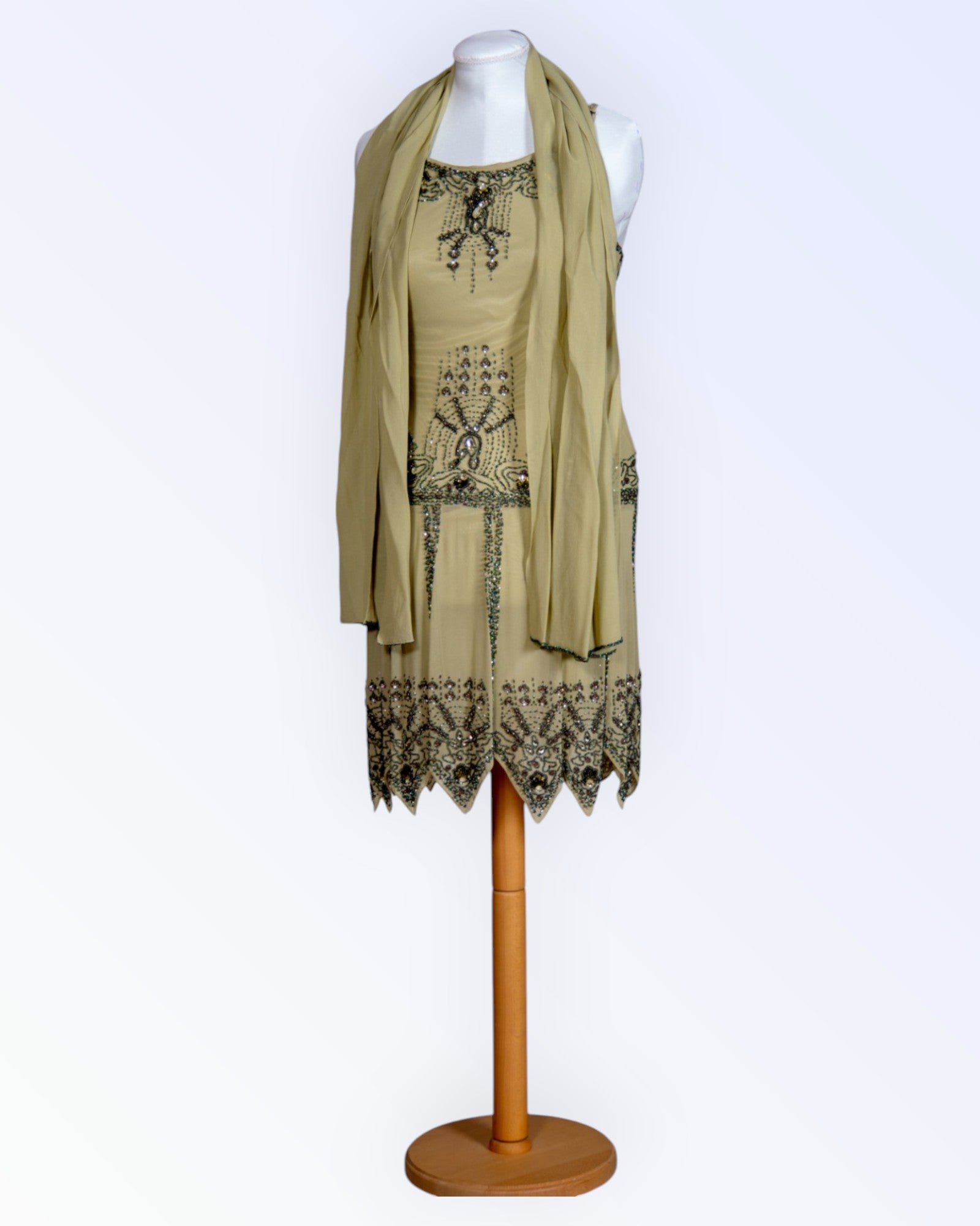 Stiilse helmestikandiga sakilise alläärega kokteilkleit, komplektis sall.