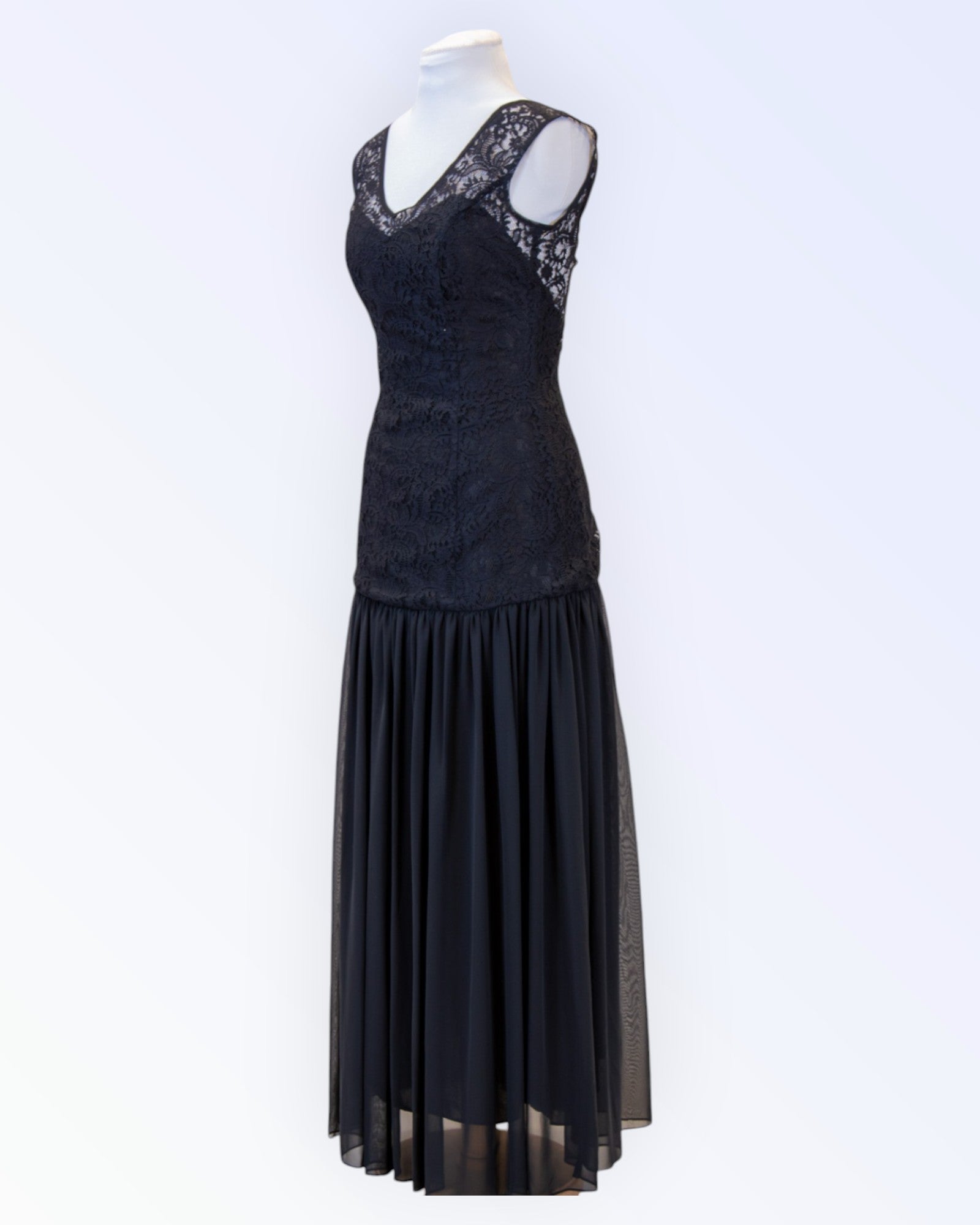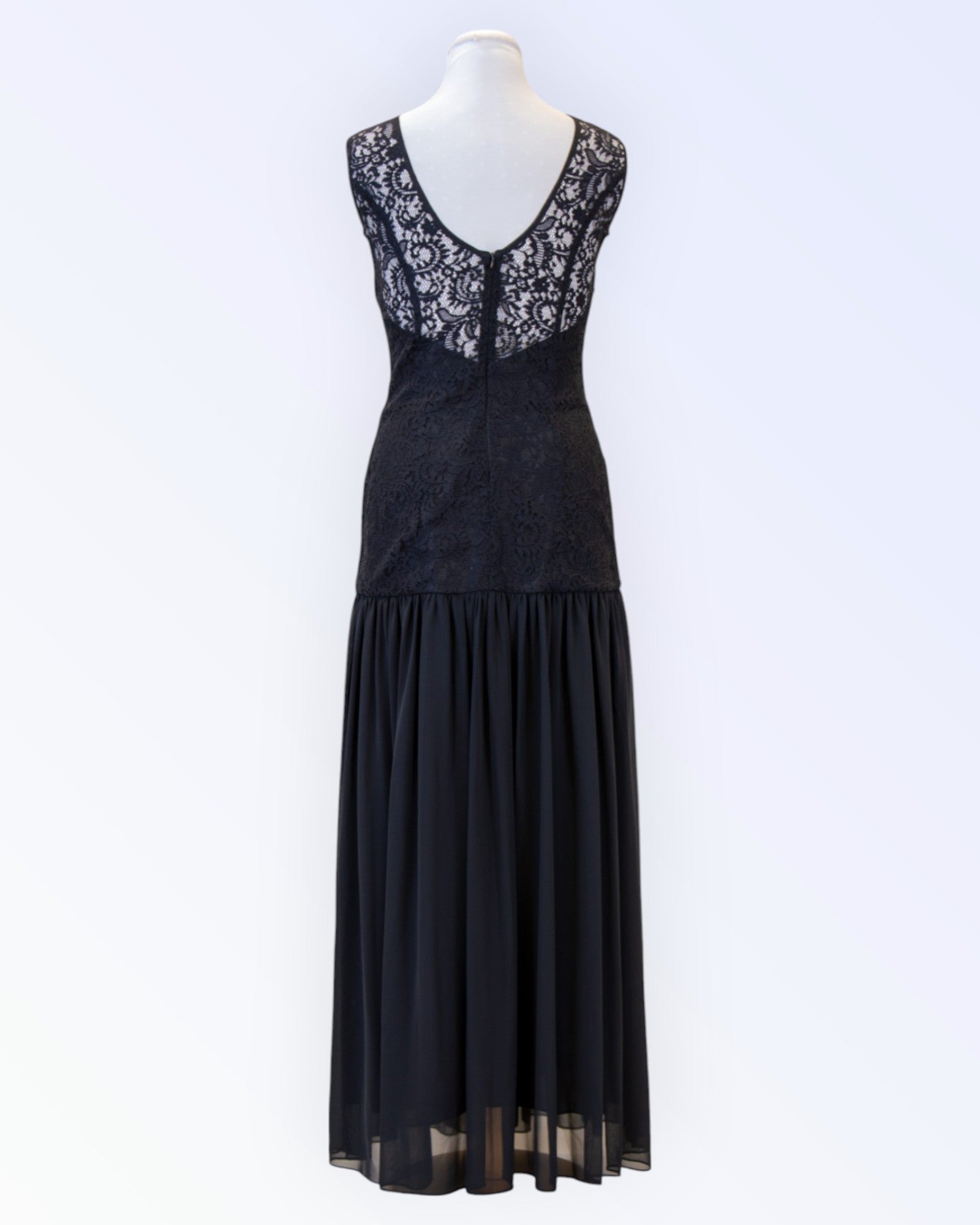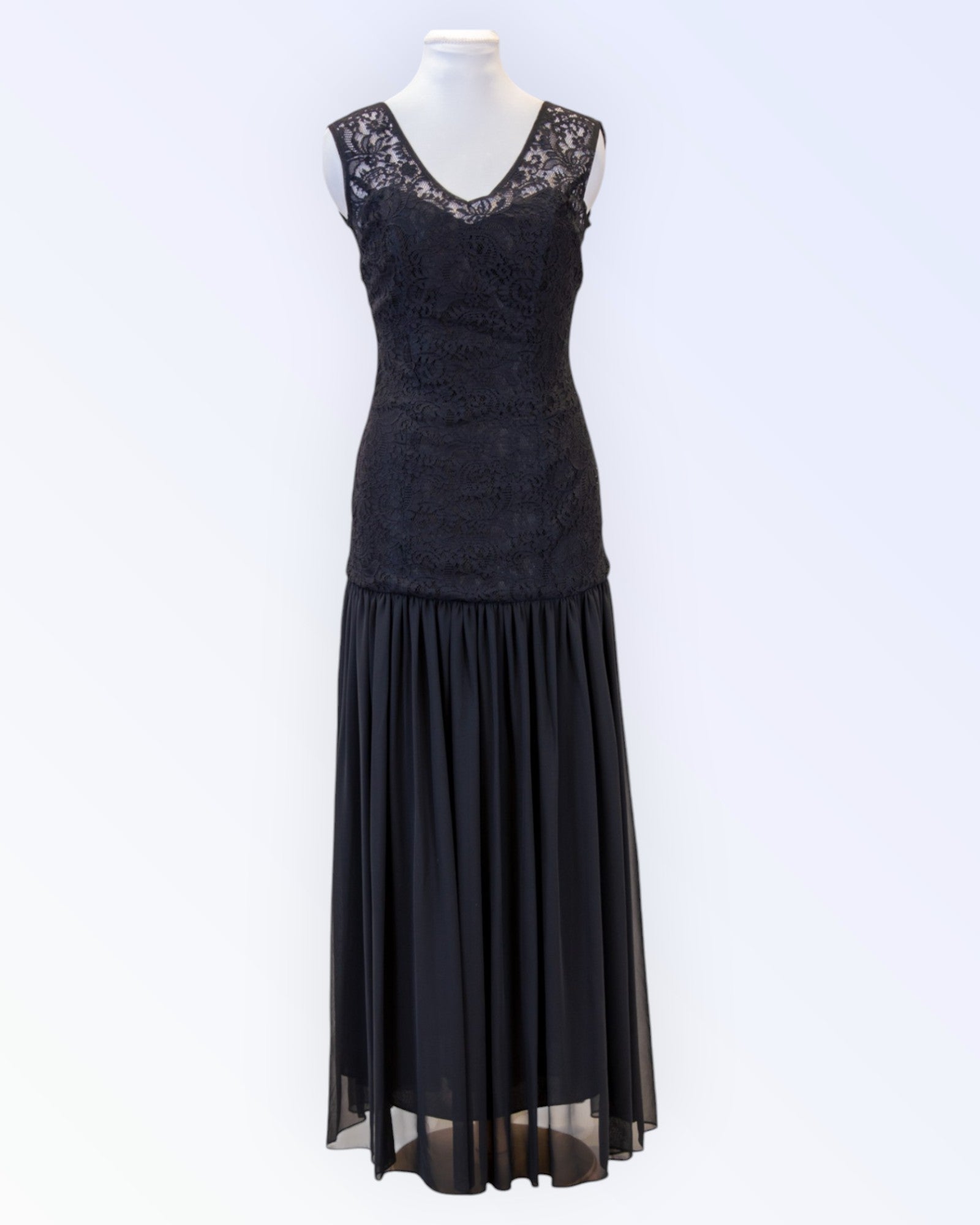 pikendatud pihaosaga mustast pitsist ja šifoonist pidulik kleit