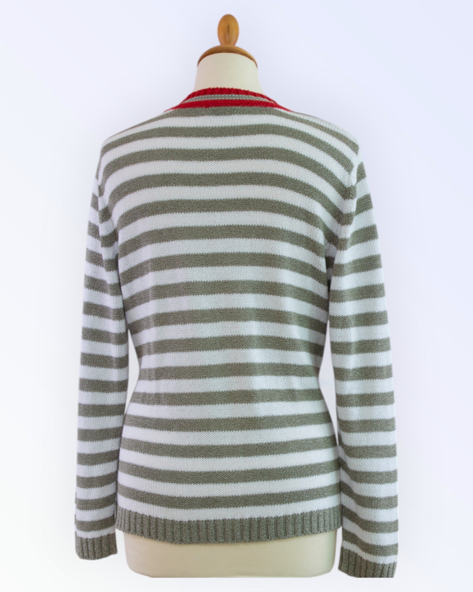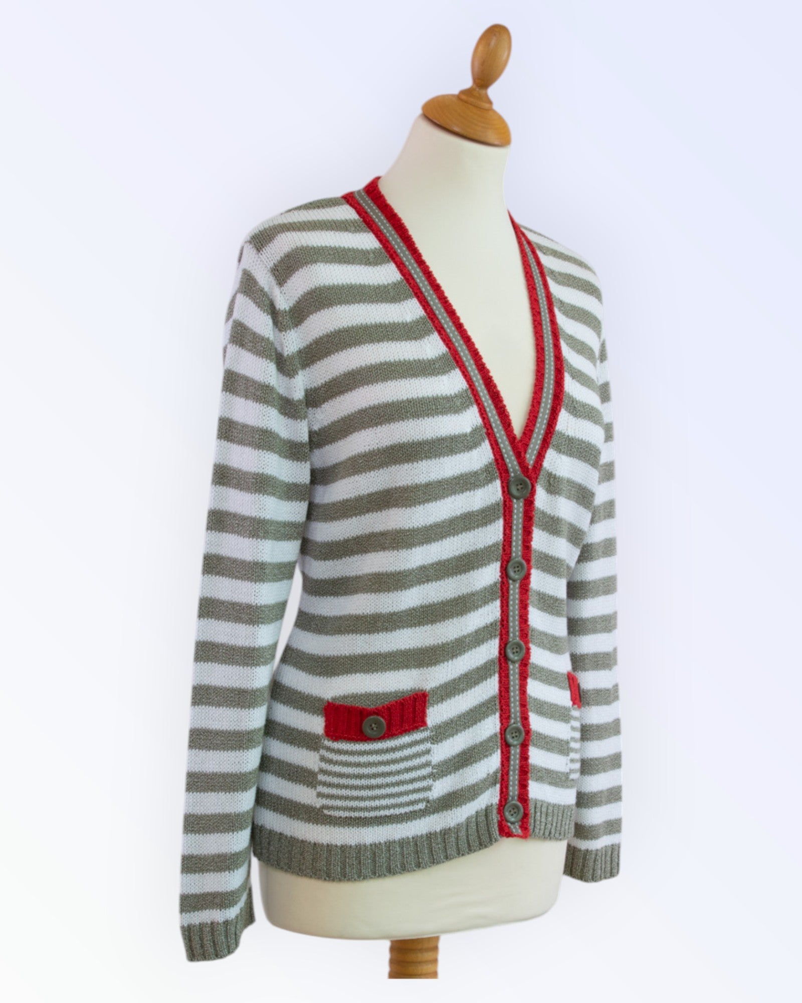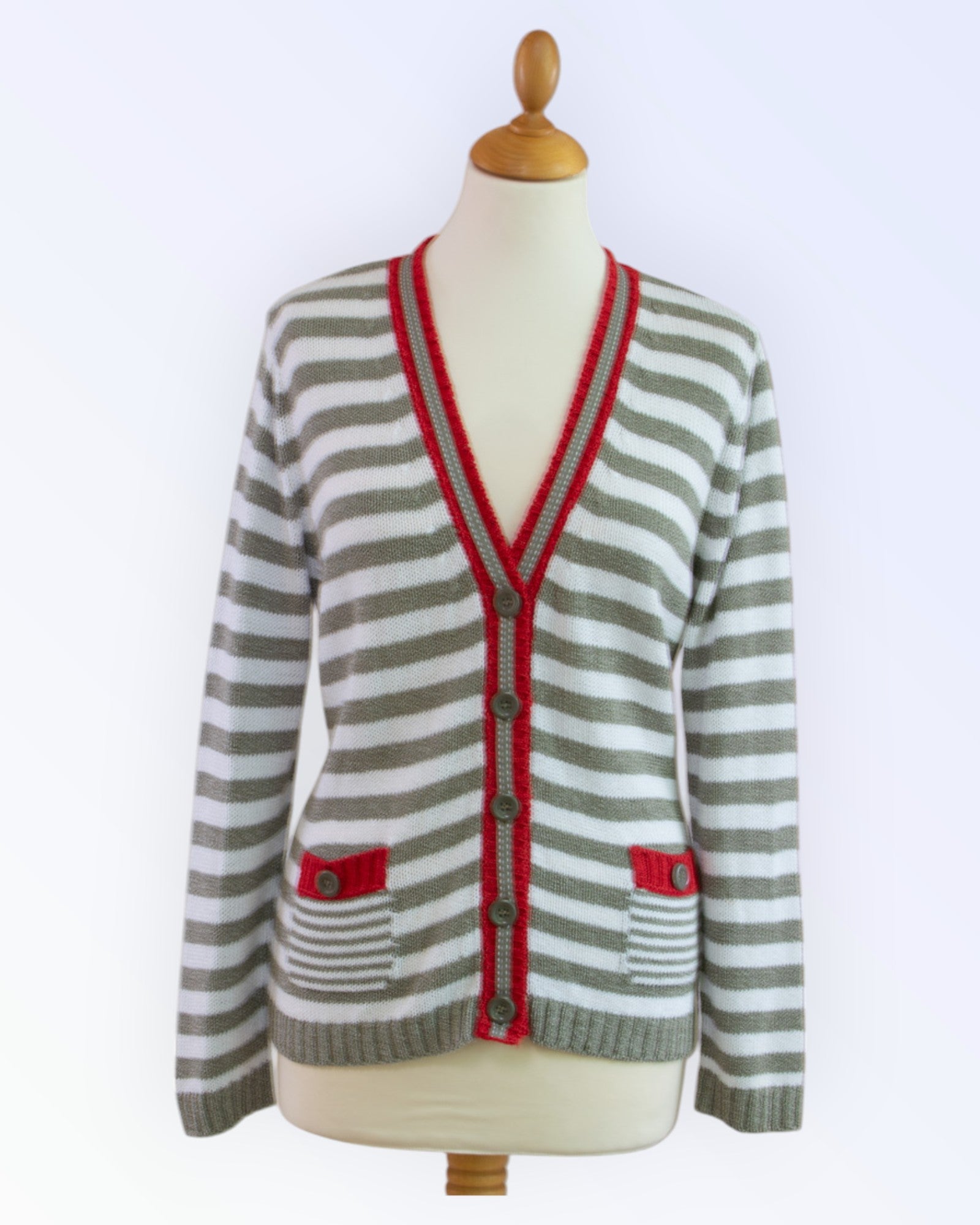 Kootud kardigan horisontaalsete triipude ja punaste äärtega