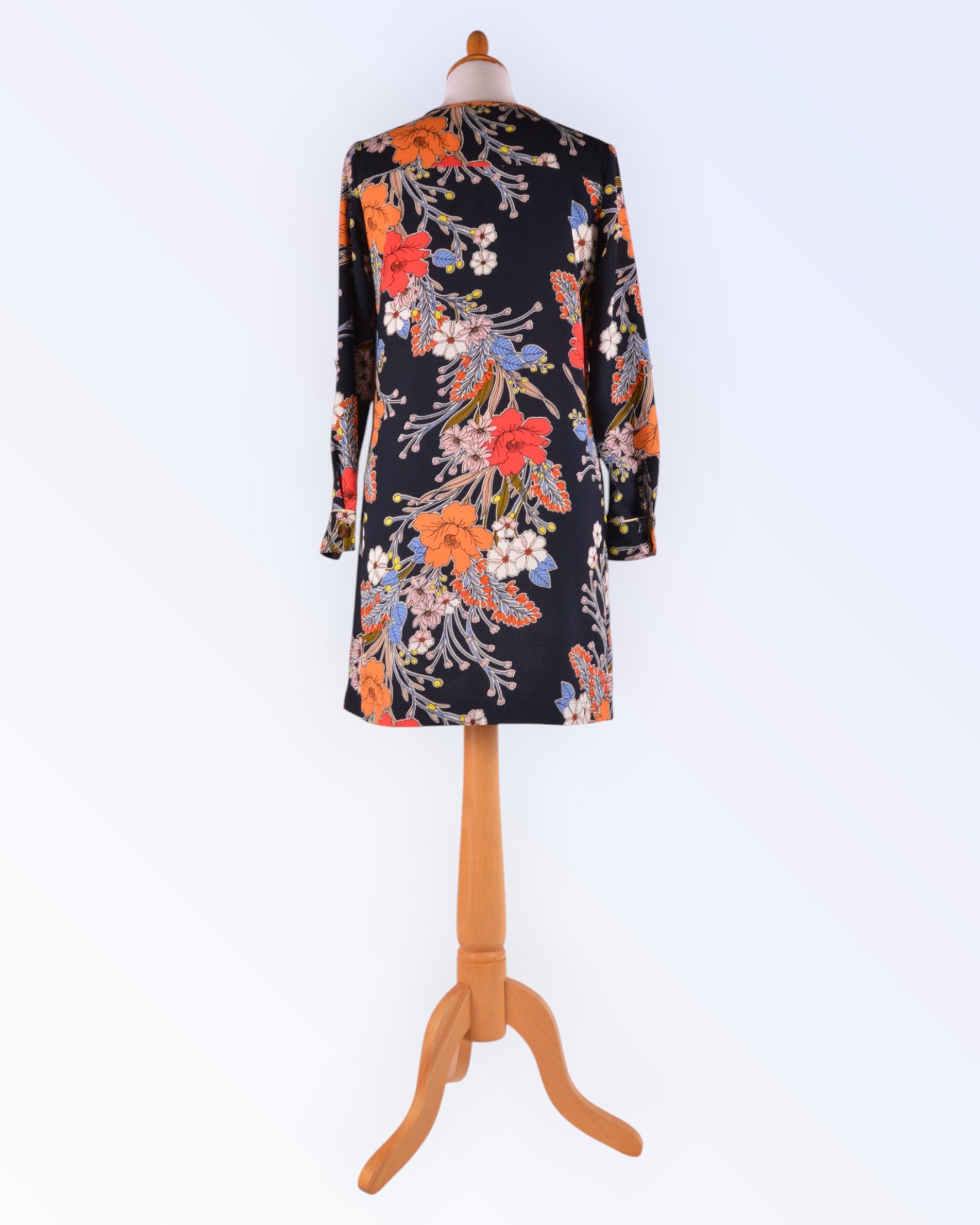 Lillemustriga tumesinisest kangast pikkade varrukatega sportliku disainiga sirgelõikeline kleit. Kleidil on küljetaskud. Voodrita toode. Sobib ka tulevasele emale.
