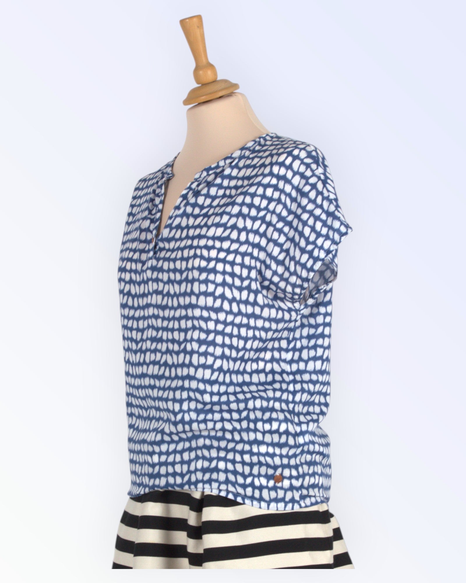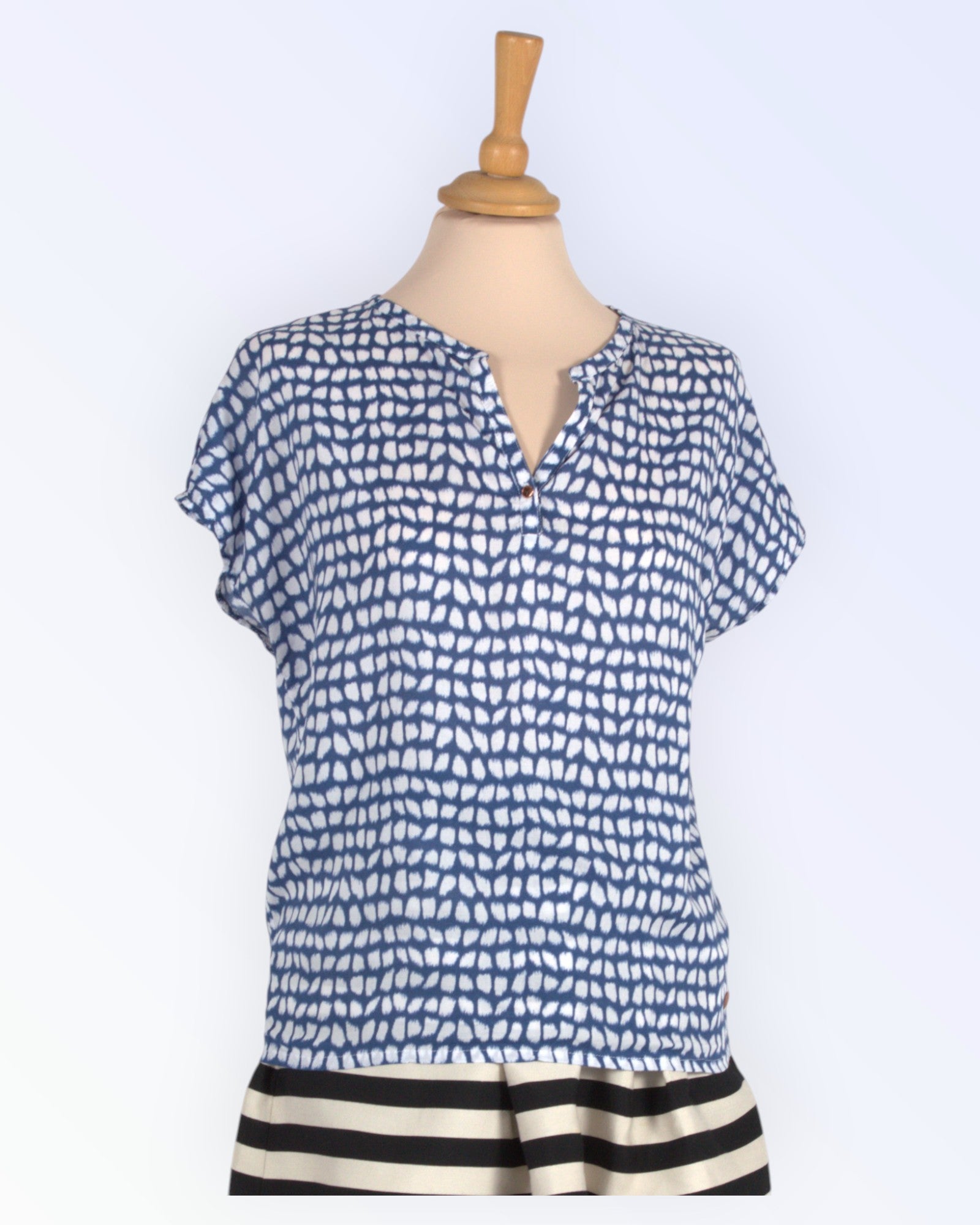 Sinise-valge mustriga kerge avaralõikeline suvepluus.