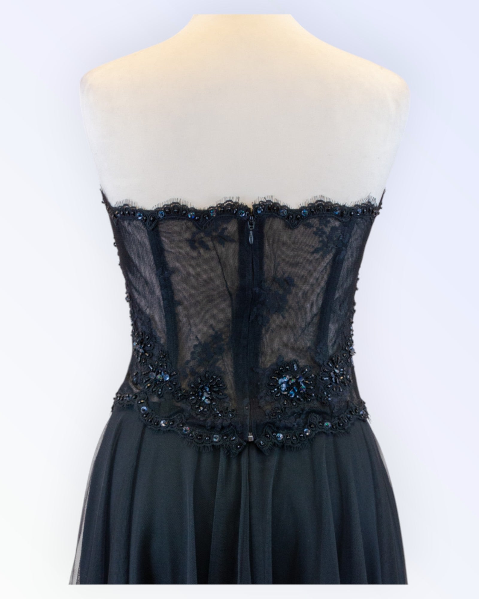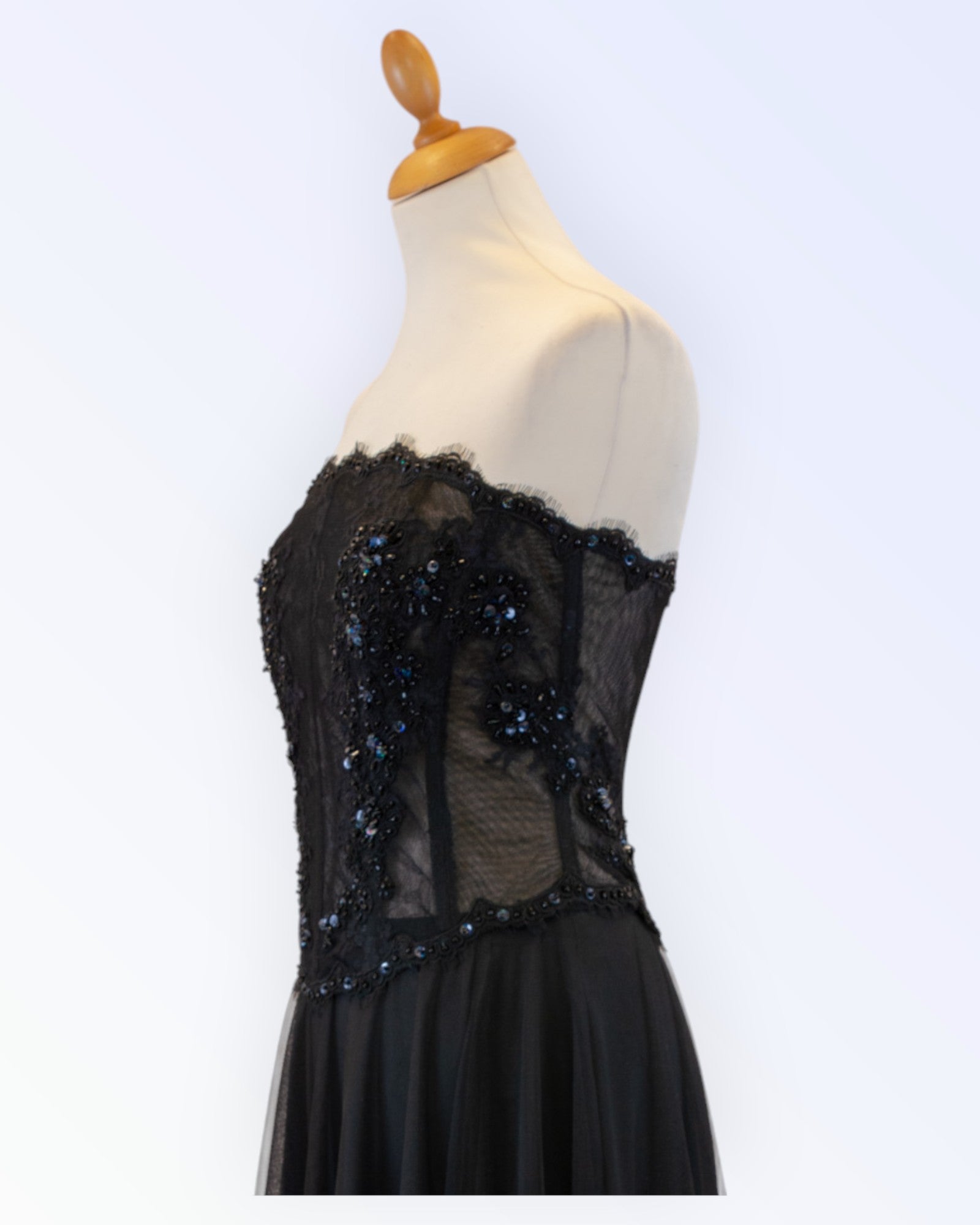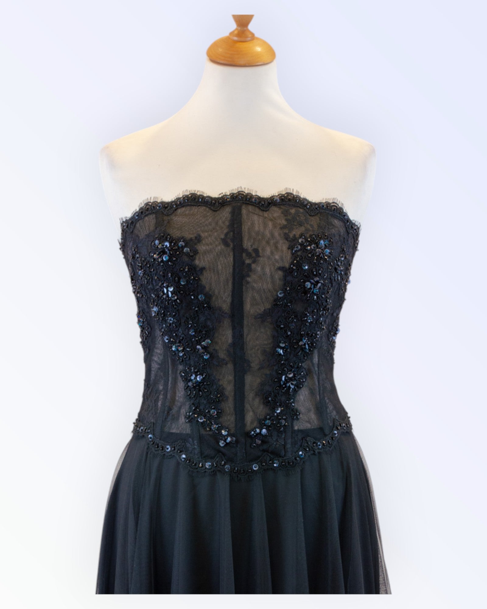 Mustast tüllist pidulik top. Läbikumav top on kaunistatud helmestikandi ja pitsmotiividega.