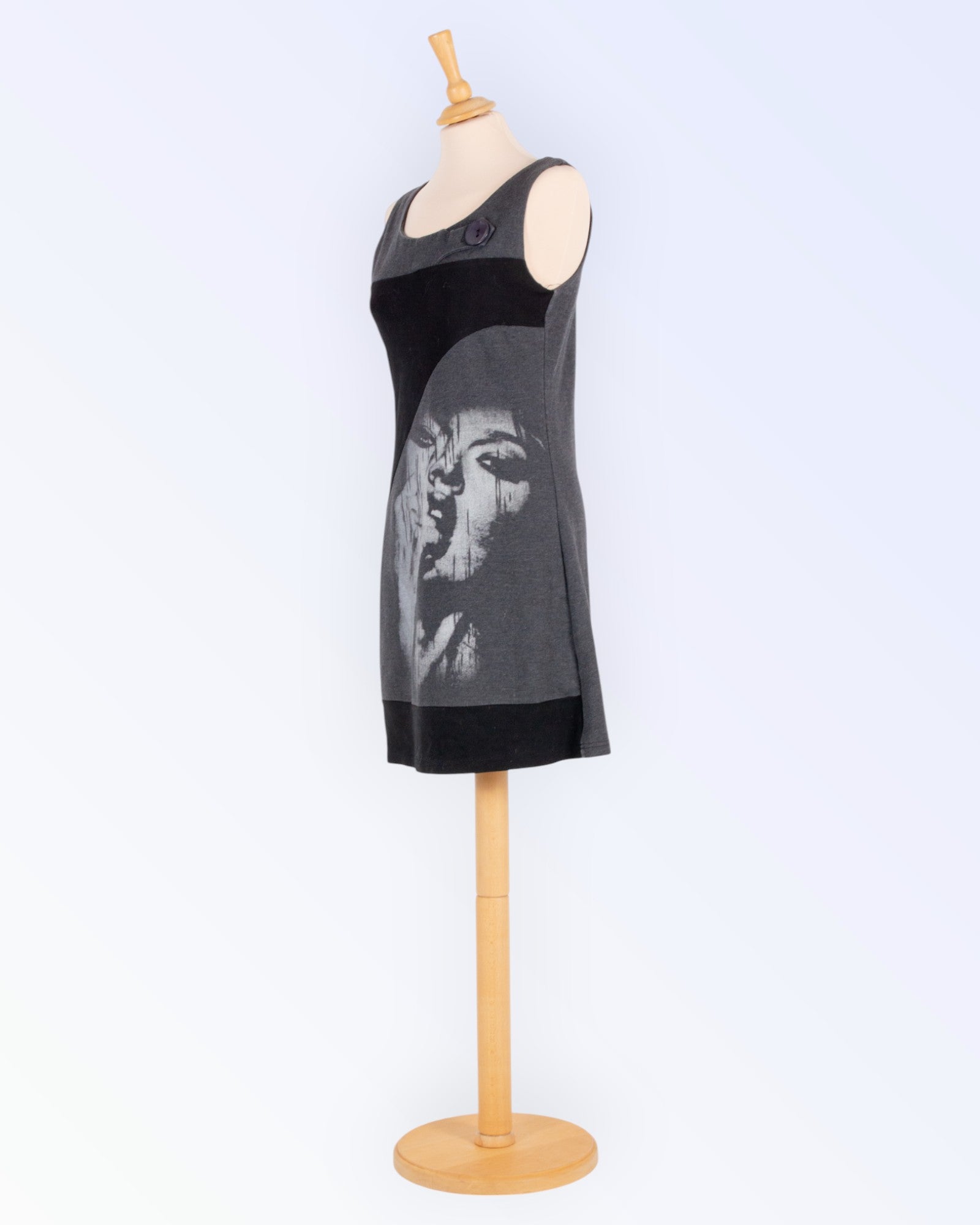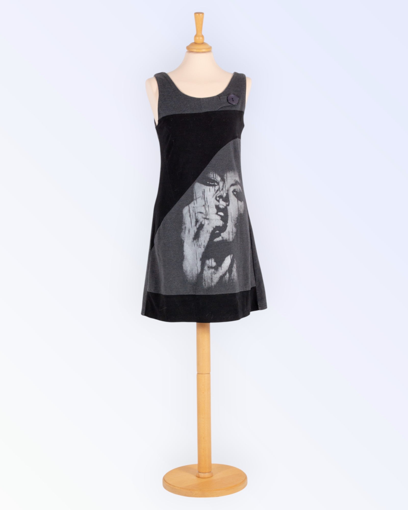 Sirgelõikeline asümmeetrilise disainiga paksemast trikotaažist tuunika. Unikaalsust lisavad suur dekoratiivne nööp ja trükimuster kleidi esiosas.