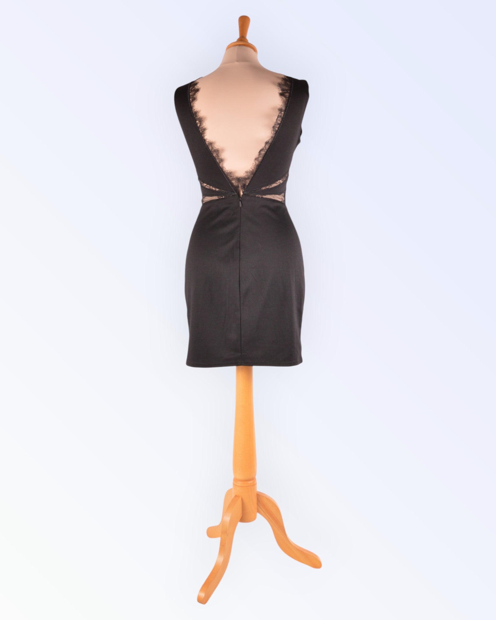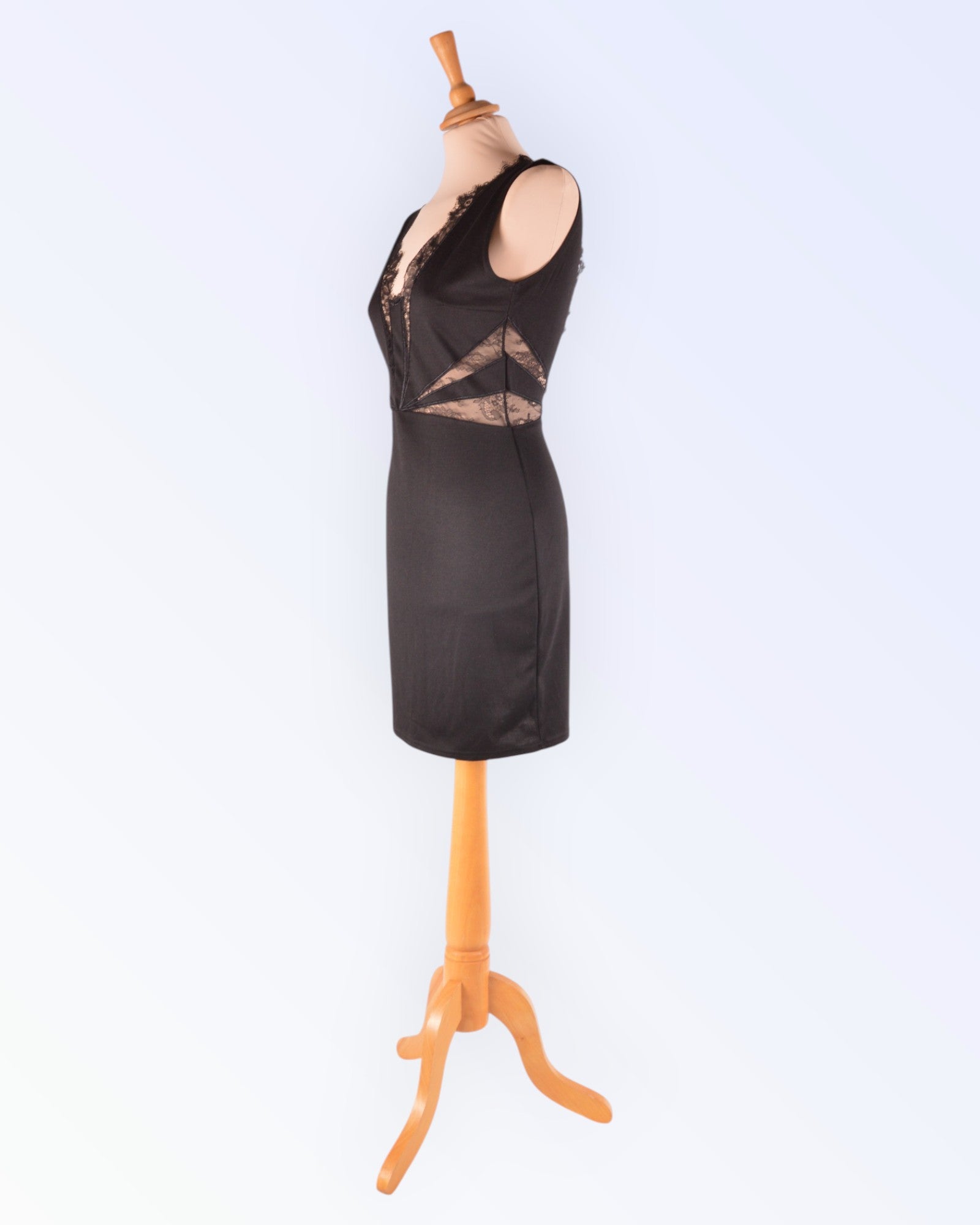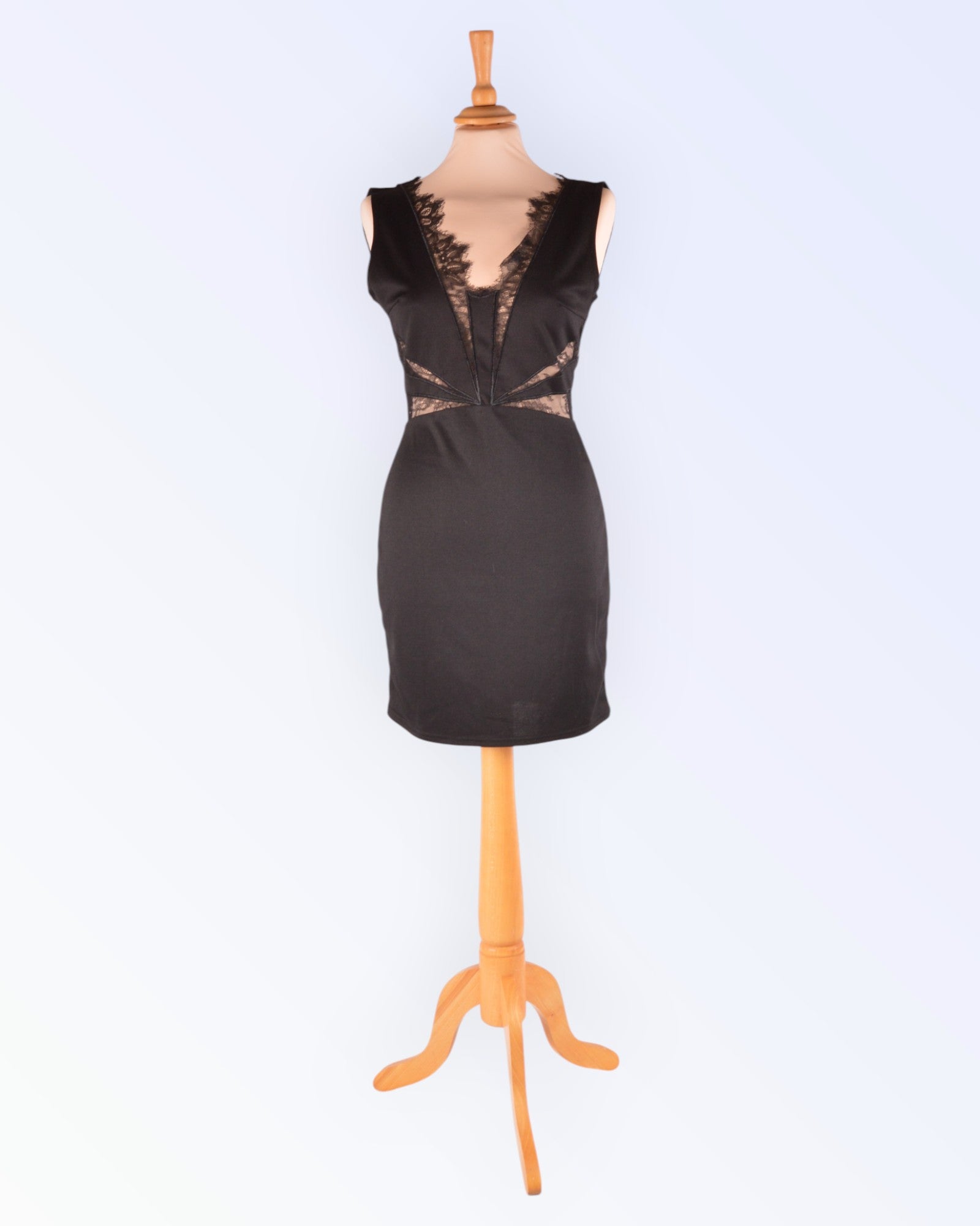 Väike must läbipaistvate pitsdetailidega trikotaažkleit. Voodrita toode.