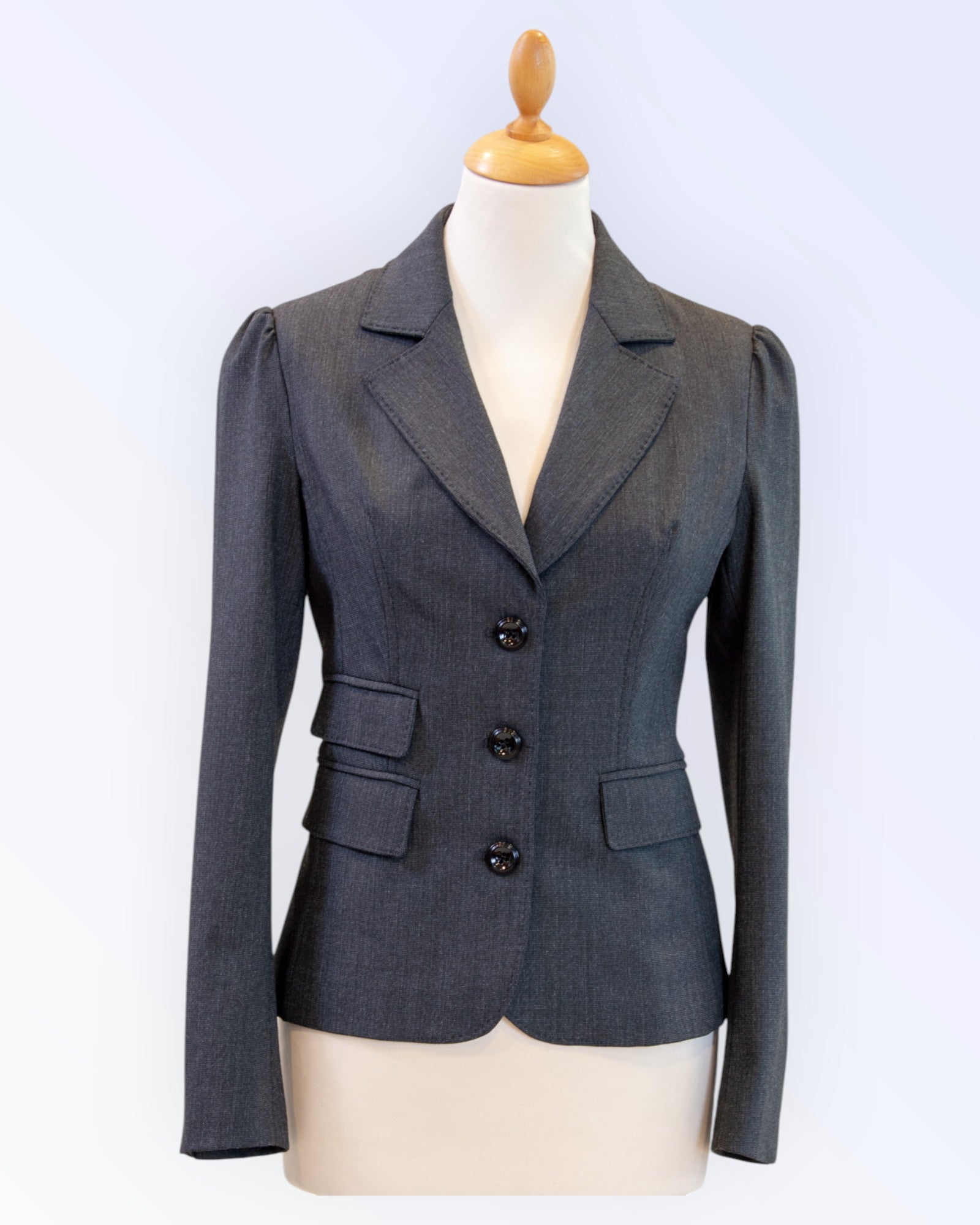 Klassikalise lõikega taljesse töödeldud tumehall kostüümjakk.